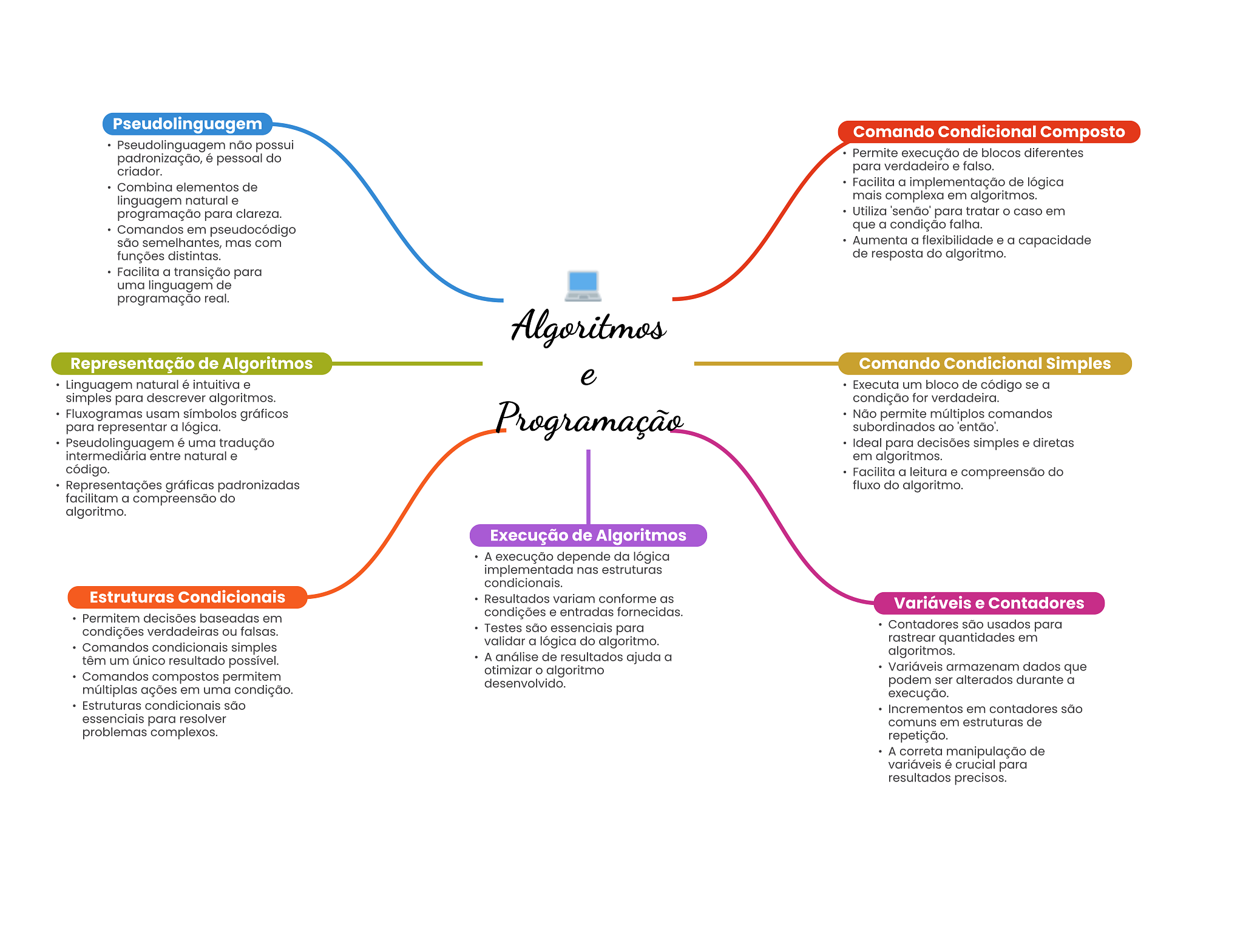 Pseudolinguagem Comando Condicional Composto Pseudolinguagem não possui padronização, é pessoal do Permite execução de blocos diferentes criador. para verdadeiro e falso. Combina elementos de Facilita a implementação de lógica linguagem natural e mais complexa em algoritmos. programação para clareza. Utiliza 'senão' para tratar caso em Comandos em pseudocódigo que a condição falha. são semelhantes, mas com Aumenta a flexibilidade e a capacidade funções distintas. de resposta do algoritmo. Facilita a transição para uma linguagem de programação real. Algoritmos Representação de Algoritmos Comando Condicional Simples Linguagem natural é intuitiva e e Executa um bloco de código se a simples para descrever algoritmos. condição for verdadeira. Fluxogramas usam símbolos gráficos Programação Não permite múltiplos comandos para representar a lógica. subordinados ao 'então'. Pseudolinguagem é uma tradução Ideal para decisões simples e diretas intermediária entre natural e em algoritmos. código. Facilita a leitura e compreensão do Representações gráficas padronizadas fluxo do algoritmo. facilitam a compreensão do algoritmo. Execução de Algoritmos A execução depende da lógica implementada nas estruturas condicionais. Estruturas Condicionais Resultados variam conforme as Variáveis e Contadores Permitem decisões baseadas em condições e entradas fornecidas. condições verdadeiras ou falsas. Testes são essenciais para Contadores são usados para Comandos condicionais simples validar a lógica do algoritmo. rastrear quantidades em têm um único resultado possível. A análise de resultados ajuda a algoritmos. otimizar algoritmo Variáveis armazenam dados que Comandos compostos permitem desenvolvido. podem ser alterados durante a múltiplas ações em uma condição. execução. Estruturas condicionais são Incrementos em contadores são essenciais para resolver comuns em estruturas de problemas complexos. repetição. A correta manipulação de variáveis é crucial para resultados precisos.