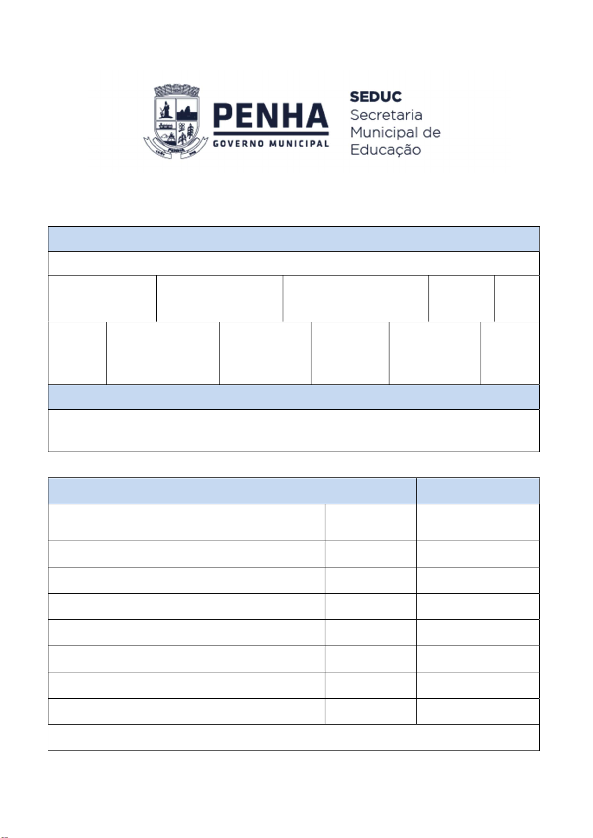 PEI – Plano Educacional Individualizado – 2025 IDENTIFICAÇÃO Nome: Data de Nascimento: Sexo: ( ) Masculino ( ) Feminino Matrícula: Turma: Ano: CID: Descrição da deficiência: Situação do Encaminhamento para Equipe de Apoio - Terapia: ( ) Aguardando ( ) Em andamento ( ) Concluído Avaliação Inicial A avaliação inicial na Educação Especial deve identificar a comunicação do estudante, sua interação social, habilidades acadêmicas e autonomia nas atividades. Também é essencial observar barreiras à aprendizagem e a necessidade de adaptações, como materiais acessíveis, tecnologia assistiva ou tempo ampliado. EQUIPE DE APOIO – TERAPIA Período de Atendimento Atendimento Educacional Especializado – AEE – Sala de Recursos Multifuncionais ( ) Sim ( ) Não Núcleo Educacional Multidisciplinar - NEM ( ) Sim ( ) Não APAE ( ) Sim ( ) Não AMA ( ) Sim ( ) Não Fonoaudiologia ( ) Sim ( ) Não Psicologia ( ) Sim ( ) Não Terapia Ocupacional ( ) Sim ( ) Não Univali (SAPS) ( ) Sim ( ) Não Outros: HABILIDADES Escrita Faz registros. ( )Sim ( ) Não ( ) Parcial Somente copia. ( )Sim ( ) Não ( ) Parcial Escreve de modo autoral. ( )Sim ( ) Não ( ) Parcial Apresenta desenhos, sinais gráficos e ou letras aleatórias. ( )Sim ( ) Não ( ) Parcial Escreve palavras. ( )Sim ( ) Não ( ) Parcial Escreve frase(s) alfabeticamente. ( )Sim ( ) Não ( ) Parcial Escreve texto(s) alfabeticamente. ( )Sim ( ) Não ( ) Parcial Necessita de enriquecimento curricular. ( )Sim ( ) Não ( ) Parcial Nível de Escrita e Leitura (Emília Ferreiro) Pré Silábico A criança não faz relação das letras com o som da língua falada. ( )Sim ( ) Não ( ) Parcial Silábico Interpreta a letra a sua maneira, utilizando valor de sílaba a cada letra. ( )Sim ( ) Não ( ) Parcial Silábico Alfabético Mistura a lógica da fase anterior com a identificação de algumas sílabas. ( )Sim ( ) Não ( ) Parcial Alfabético Domina enfim os valor das letras e sílabas. ( )Sim ( ) Não ( ) Parcial Incluir informações adicionais ou realizar alterações de bimestre. No 3º bimestre, com a mediação da professora, já escreve frases alfabeticamente de sílabas simples Leitura Expõe-se somente na oralidade. ( )Sim ( ) Não ( ) Parcial Nomeia ou descreve as ilustrações. ( )Sim ( ) Não ( ) Parcial Tenta decodificar as sílabas pausadamente, conseguindo êxito em algumas. ( )Sim ( ) Não ( ) Parcial Lê pausadamente o texto. ( )Sim ( ) Não ( ) Parcial Realiza leitura de pequenos textos e compreende o que leu. ( )Sim ( ) Não ( ) Parcial Realiza leitura de textos de média complexidade compreende o que leu. ( )Sim ( ) Não ( ) Parcial Realiza leitura de textos complexos e compreende o que leu. ( )Sim ( ) Não ( ) Parcial Lê com certa fluência respeitando sinais de pontuação. ( )Sim ( ) Não ( ) Parcial Incluir informações adicionais ou realizar alterações de bimestre. Raciocínio lógico matemático Identifica números. ( )Sim ( ) Não ( ) Parcial Identifica e relaciona números até 30. ( )Sim ( ) Não ( ) Parcial Identifica e relaciona números até 100. ( )Sim ( ) Não ( ) Parcial Identifica números e relaciona acima de 100. ( )Sim ( ) Não ( ) Parcial Realiza cálculos mentais básicos. ( )Sim ( ) Não ( ) Parcial Realiza adições simples. ( )Sim ( ) Não ( ) Parcial Realiza adições com dezenas. ( )Sim ( ) Não ( ) Parcial Realiza subtração simples. ( )Sim ( ) Não ( ) Parcial Realiza subtração com reserva. ( )Sim ( ) Não ( ) Parcial Realiza multiplicação. ( )Sim ( ) Não ( ) Parcial Realiza divisão. ( )Sim ( ) Não ( ) Parcial Resolve problemas matemáticos envolvendo as quatro operações básicas. ( )Sim ( ) Não ( ) Parcial Reconhece e nomeia as figuras geométricas planas. ( )Sim ( ) Não ( ) Parcial Lê tabelas e gráficos. ( )Sim ( ) Não ( ) Parcial Reconhece cédulas e moedas do sistema monetário brasileiro. ( )Sim ( ) Não ( ) Parcial Incluir informações adicionais ou realizar alterações de bimestre. Sensorial/ Órtese e Prótese Apresenta hipersensibilidade auditiva. ( )Sim ( ) Não ( ) Parcial Apresenta hipersensibilidade à luz. ( )Sim ( ) Não ( ) Parcial Apresenta hipersensibilidade tátil. ( )Sim ( ) Não ( ) Parcial Apresenta desconforto quando está próximo a muitas pessoas. ( )Sim ( ) Não ( ) Parcial Faz uso de órtese (dispositivo que auxilia um membro, órgão ou tecido do corpo) de membro superior. ( )Sim ( ) Não ( ) Parcial Faz uso de órtese de membro inferior. ( )Sim ( ) Não ( ) Parcial Faz uso de prótese (dispositivo que substitui um membro, órgão ou tecido do corpo) de membro superior. ( )Sim ( ) Não ( ) Parcial Faz uso de prótese de membro inferior. ( )Sim ( ) Não ( ) Parcial Possui Implante Coclear. ( )Sim ( ) Não ( ) Parcial Faz uso de Sistema FM. ( )Sim ( ) Não ( ) Parcial Faz uso de Aparelho de Amplificação Sonora Individual (aparelho auditivo). ( )Sim ( ) Não ( ) Parcial Incluir informações adicionais ou realizar alterações de bimestre. Acessibilidade Infraestrutura física/ Mobiliário/ Equipamentos Específicos/ Mobilidade Apresenta boa coordenação motora ampla, lateralidade, marcha, equilíbrio corporal, coordenação de membros e noção espacial. ( )Sim ( ) Não ( ) Parcial Demonstra coordenação motora fina como a manipulação de objetos com precisão, manuseio do lápis, uso da tesoura, escrita, desenho e pintura. ( )Sim ( ) Não ( ) Parcial Manipula objetos e peças de encaixe. ( )Sim ( ) Não ( ) Parcial Coordenação olho-mão (capacidade de alinhar movimentos como campo visual). ( )Sim ( ) Não ( ) Parcial Apresenta boa coordenação motora ampla, incluindo lateralidade, noção espacial, equilíbrio corporal e coordenação de membros. ( )Sim ( ) Não ( ) Parcial Banheiro adaptado. ( )Sim ( ) Não ( ) Parcial Necessita de banheiro com trocador. ( )Sim ( ) Não ( ) Parcial Necessita do uso da rampa para facilitar o acesso a outros espaços. ( )Sim ( ) Não ( ) Parcial Faz uso de cadeira de rodas. ( )Sim ( ) Não ( ) Parci
