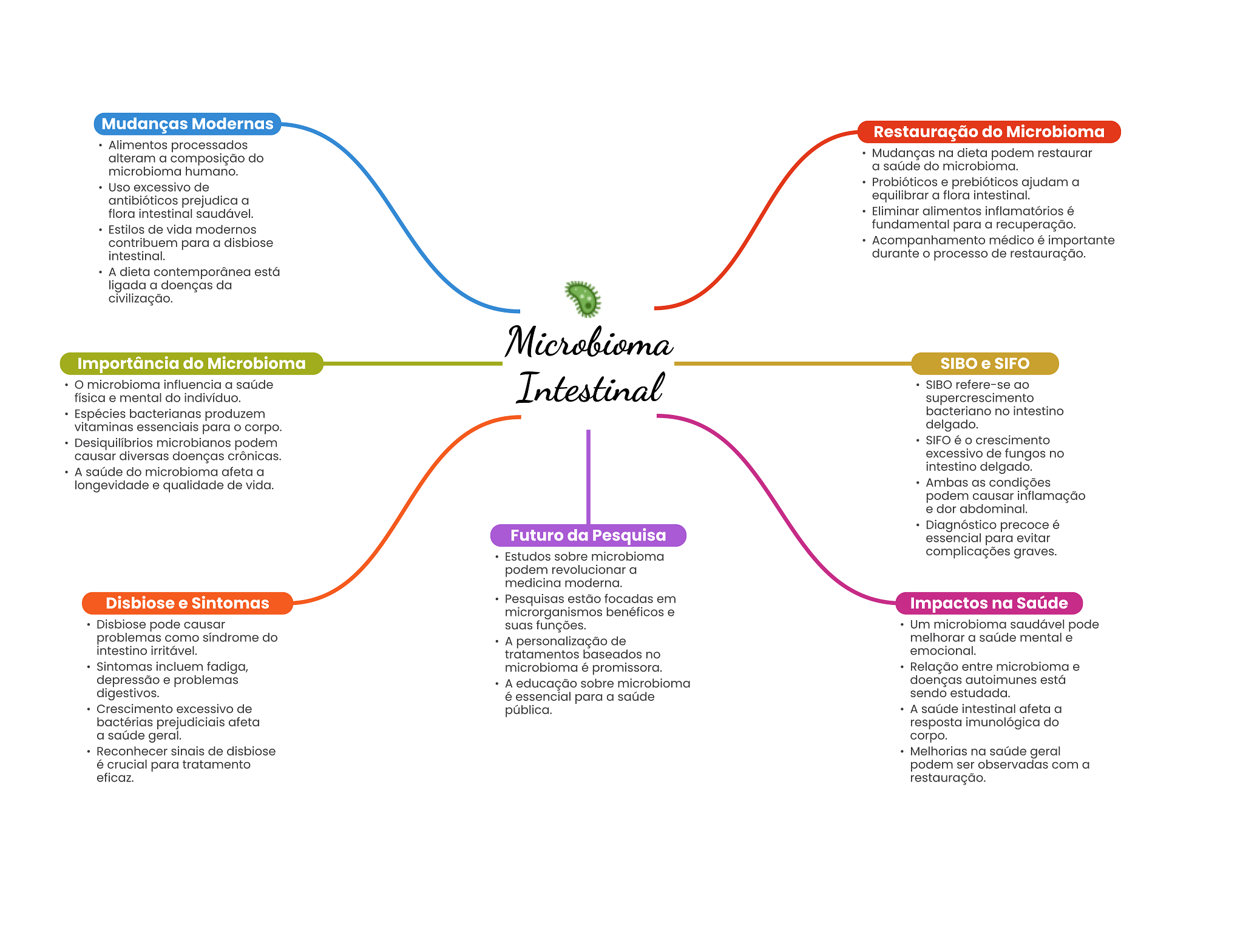 Mudanças Modernas Restauração do Microbioma Alimentos processados alteram a composição do Mudanças na dieta podem restaurar microbioma humano. a saúde do microbioma. Uso excessivo de Probióticos e prebióticos ajudam a antibióticos prejudica a equilibrar a flora intestinal. flora intestinal saudável. Eliminar alimentos inflamatórios é Estilos de vida modernos fundamental para a recuperação. contribuem para a disbiose Acompanhamento médico é importante intestinal. durante processo de restauração. A dieta contemporânea está ligada a doenças da civilização. Microbioma Importância do Microbioma SIBO e SIFO microbioma influencia a saúde Intestinal SIBO refere-se ao física e mental do indivíduo. supercrescimento Espécies bacterianas produzem bacteriano no intestino vitaminas essenciais para corpo. delgado. microbianos podem SIFO é O crescimento causar diversas doenças crônicas. excessivo de fungos no A saúde do microbioma afeta a intestino delgado. longevidade e qualidade de vida. Ambas as condições podem causar inflamação e dor abdominal. Diagnóstico precoce é Futuro da Pesquisa essencial para evitar Estudos sobre microbioma complicações graves. podem revolucionar a medicina moderna. Disbiose e Sintomas Pesquisas estão focadas em Impactos na Saúde microrganismos benéficos e Disbiose pode causar suas funções. Um microbioma saudável pode problemas como síndrome do A personalização de melhorar a saúde mental e intestino irritável. tratamentos baseados no emocional. Sintomas incluem fadiga, microbioma é promissora. Relação entre microbioma e depressão e problemas A educação sobre microbioma doenças autoimunes está digestivos. é essencial para a saúde sendo estudada. Crescimento excessivo de pública. A saúde intestinal afeta a bactérias prejudiciais afeta resposta imunológica do a saúde geral. corpo. Reconhecer sinais de disbiose Melhorias na saúde geral é crucial para tratamento podem ser observadas com a eficaz. restauração.