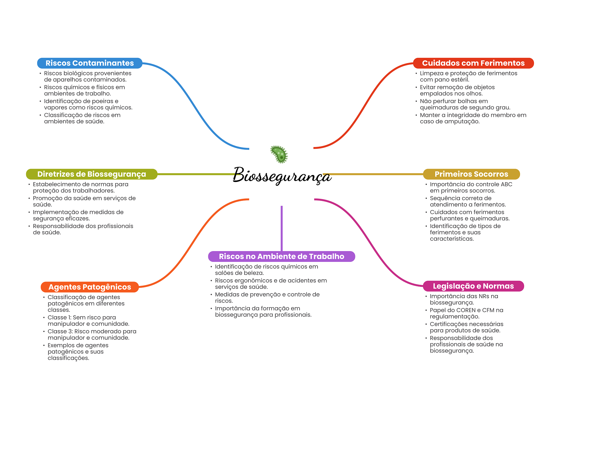Riscos Contaminantes Cuidados com Ferimentos Riscos biológicos provenientes Limpeza e proteção de ferimentos de aparelhos contaminados. com pano estéril. Riscos químicos e físicos em Evitar remoção de objetos ambientes de trabalho. empalados nos olhos. Identificação de poeiras e Não perfurar bolhas em vapores como riscos químicos. queimaduras de segundo grau. Classificação de riscos em Manter a integridade do membro em ambientes de saúde. caso de amputação. Diretrizes de Biossegurança Biossegurança Primeiros Socorros Estabelecimento de normas para Importância do controle ABC proteção dos trabalhadores. em primeiros socorros. Promoção da saúde em serviços de Sequência correta de saúde. atendimento a ferimentos. Implementação de medidas de Cuidados com ferimentos segurança eficazes. perfurantes e queimaduras. Responsabilidade dos profissionais Identificação de tipos de de saúde. ferimentos e suas características. Riscos no Ambiente de Trabalho Identificação de riscos químicos em salões de beleza. Riscos ergonômicos e de acidentes em Agentes Patogênicos serviços de saúde. Legislação e Normas Classificação de agentes Medidas de prevenção e controle de Importância das NRs na riscos. patogênicos em diferentes biossegurança. classes. Importância da formação em Papel do COREN e CFM na Classe 1: Sem risco para biossegurança para profissionais. regulamentação. manipulador e comunidade. Certificações necessárias Classe 3: Risco moderado para para produtos de saúde. manipulador e comunidade. Responsabilidade dos Exemplos de agentes profissionais de saúde na patogênicos e suas biossegurança. classificações.