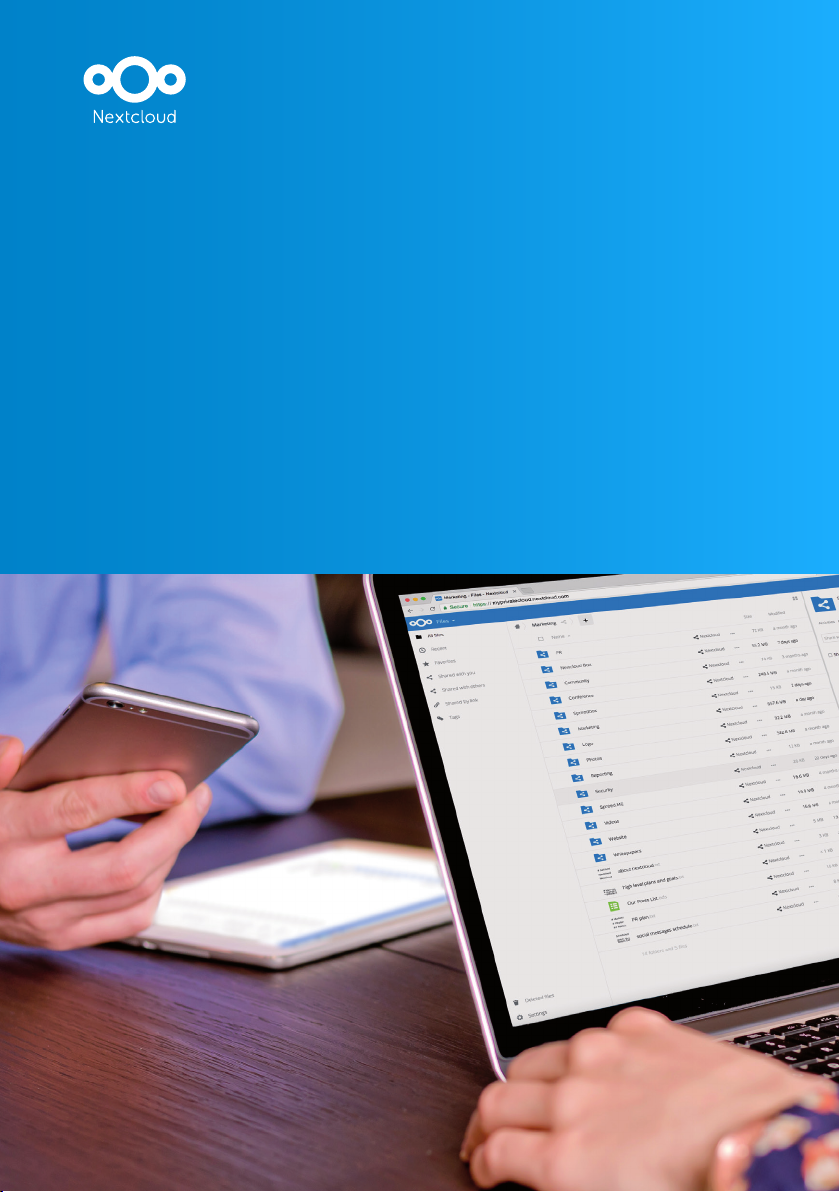 A safe home for all your data Access, share and protect your files, calendars, contacts, communication and more at home and in your enterprise nextcloud.com http://nextcloud.com Self-hosted, open file sync and communication app platform Nextcloud is the next generation open source, self-hosted, enterprise-ready file access and communication platform. Access and sync your files, contacts, calendars and communicate and collaborate across your devices. You decide what happens with your data, where it is and who can access it! Nextcloud puts you back in control. Easy access Users gain access to their documents and can collaborate with others within and outside their organization, assisted by audio/video chat, calendar & mail and planning and coordination tools. Nextcloud offers an easy to use web interface or clients for Windows, Mac, Linux, Android and iOS and its capabilities can be extended from an ecosystem of hundreds of apps. Seamless integration Nextcloud easily integrates into existing infrastructure with LDAP, SAML or Kerberos and its universal file access feature makes data available to users irrespective of where it is stored, be it on a local NAS, a remote FTP, Samba, NFS or object storage like S3. First class security Nextcloud puts IT in control, providing power-ful file access control capabilities to ensure company policies are enforced. Encryption, two-factor authentication, session management and brute force protection enable an extra layer of protection for your data. First class security backed by a 10,000 USD security bug bounty program provides the confidence that data meant to be private will stay private. https:443 WebDAV Access all of your data regardless of the device or platform you SMBNFSFTP Your data can be encrypted for both local and remote storage, protecting data stored on networks outside of your infrastructure. Universal file access Email sales@nextcloud.com Phone +49 711 252428-90 nextcloud.com @Nextclouders Get in touch! mailto:sales%40nextcloud.com?subject= https://nextcloud.com https://twitter.com/nextclouders https://www.facebook.com/Nextclouders/