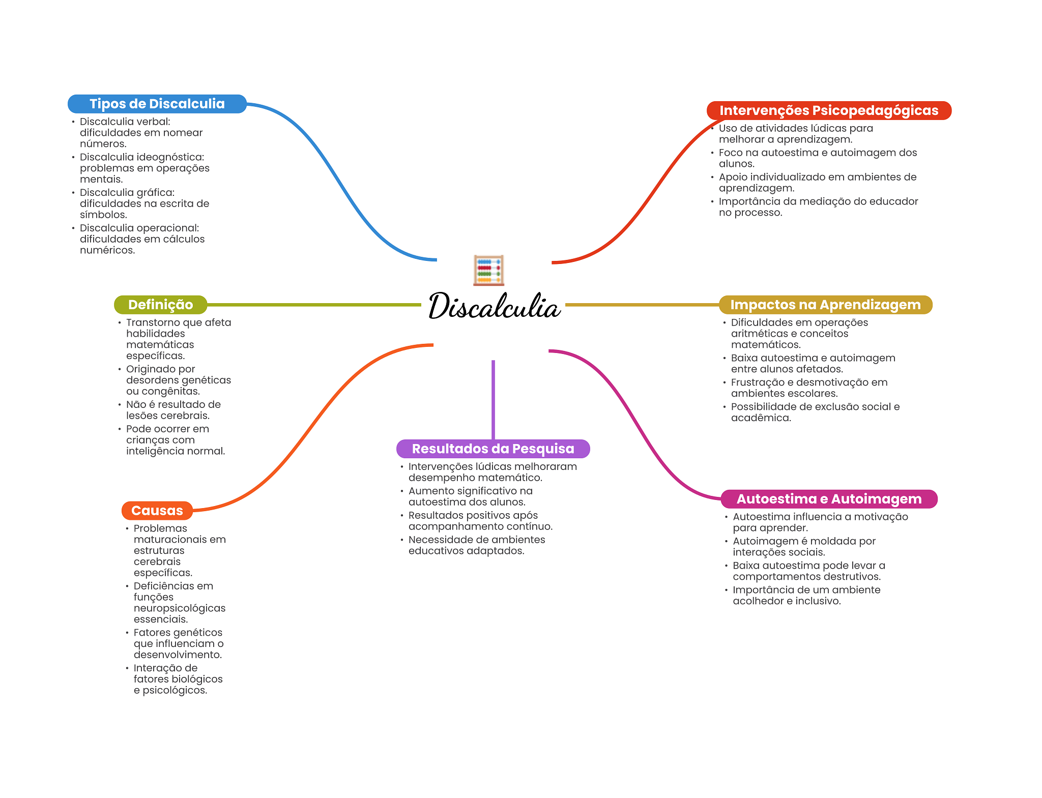 Tipos de Discalculia Intervenções Psicopedagógicas Discalculia verbal: dificuldades em nomear Uso de atividades lúdicas para números. melhorar a aprendizagem. Discalculia ideognóstica: Foco na autoestima e autoimagem dos alunos. problemas em operações mentais. Apoio individualizado em ambientes de Discalculia gráfica: aprendizagem. dificuldades na escrita de Importância da mediação do educador símbolos. no processo. Discalculia operacional: dificuldades em cálculos numéricos. Definição Discalculia Impactos na Aprendizagem Transtorno que afeta Dificuldades em operações habilidades aritméticas e conceitos matemáticas matemáticos. específicas. Baixa autoestima e autoimagem Originado por entre alunos afetados. desordens genéticas Frustração e desmotivação em ou congênitas. ambientes escolares. Não é resultado de Possibilidade de exclusão social e lesões cerebrais. acadêmica. Pode ocorrer em crianças com inteligência normal. Resultados da Pesquisa Intervenções lúdicas melhoraram desempenho matemático. Aumento significativo na autoestima dos alunos. Autoestima e Autoimagem Causas Resultados positivos após Autoestima influencia a motivação Problemas acompanhamento contínuo. para aprender. maturacionais em Necessidade de ambientes Autoimagem é moldada por estruturas educativos adaptados. interações sociais. cerebrais Baixa autoestima pode levar a específicas. comportamentos destrutivos. Deficiências em Importância de um ambiente funções acolhedor e inclusivo. neuropsicológicas essenciais. Fatores genéticos que influenciam desenvolvimento. Interação de fatores biológicos e psicológicos.