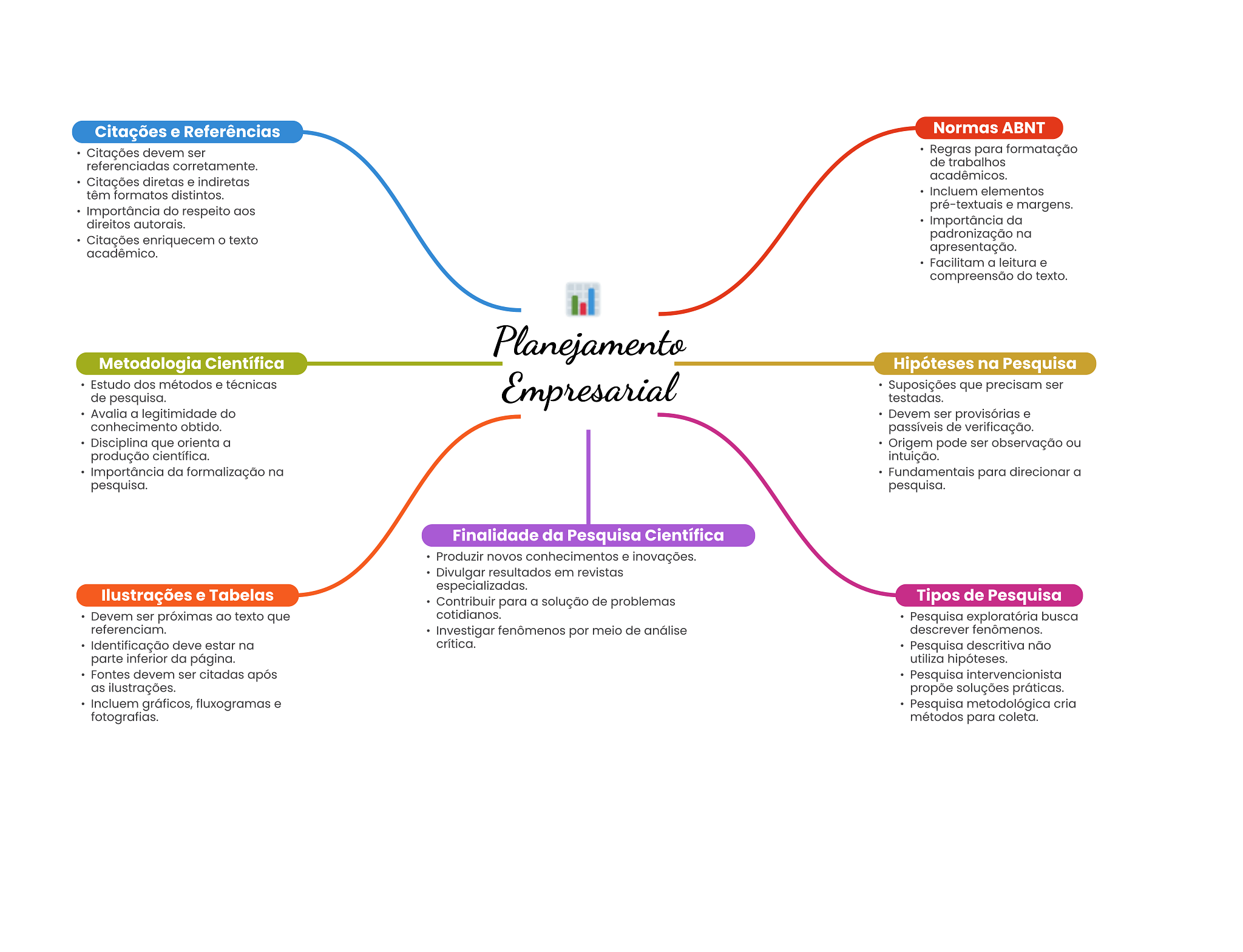 Citações e Referências Normas ABNT Citações devem ser Regras para formatação referenciadas corretamente. de trabalhos acadêmicos. Citações diretas e indiretas têm formatos distintos. Incluem elementos Importância do respeito aos pré-textuais e margens. direitos autorais. Importância da Citações enriquecem texto padronização na acadêmico. apresentação. Facilitam a leitura e compreensão do texto. Planejamento Metodologia Científica Hipóteses na Pesquisa Estudo dos métodos e técnicas Empresarial Suposições que precisam ser de pesquisa. testadas. Avalia a legitimidade do Devem ser provisórias e conhecimento obtido. passíveis de verificação. Disciplina que orienta a Origem pode ser observação ou produção científica. intuição. Importância da formalização na Fundamentais para direcionar a pesquisa. pesquisa. Finalidade da Pesquisa Científica Produzir novos conhecimentos e inovações. Divulgar resultados em revistas especializadas. Ilustrações e Tabelas Contribuir para a solução de problemas Tipos de Pesquisa Devem ser próximas ao texto que cotidianos. Pesquisa exploratória busca referenciam. Investigar fenômenos por meio de análise descrever fenômenos. Identificação deve estar na crítica. Pesquisa descritiva não parte inferior da página. utiliza hipóteses. Fontes devem ser citadas após Pesquisa intervencionista as ilustrações. propõe soluções práticas. Incluem gráficos, fluxogramas e Pesquisa metodológica cria fotografias. métodos para coleta.
