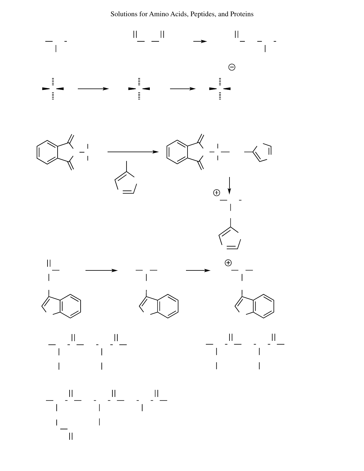 Solutions for Amino Acids, Peptides, and Proteins 36 continued Me3COC O O COCMe3 O H2N CH CH3 COOH C COOH CH3 HHO CTsO H CH3 COOH TsCl C COO CH3 NH2H Me3COC O NH CH COOH CH3 (d) + 37 pyridine excess NH3 D-alanine N O O CH COOEt COOEt CH2Br N NH N H H2C C H O N H H2C H C CNH2N H2O H3O+ C COOEt COOEt N O O CH2 H N N H3N CH COOH CH2 N NH H3O+ N H H2C H C COOHH3N 38 ∆ 2) 1) NaOEt racemic histidine 39 racemic tryptophan ∆ NH3, HCN H2N CH C CH2 NH CH CHCH3 C OH O O OHCH2SCH3 CHCH3 OH CH2 CH2SCH3 C O C O OHCHNHCHH2N 40 (a) neutral (b) neutral (c) H2N CH C (CH2)3 NH CH CH2 C NH CH (CH2)4NH2 C OH O O O HN COOHCNH2 NH basic: two basic side chains and one acidic side chain 647