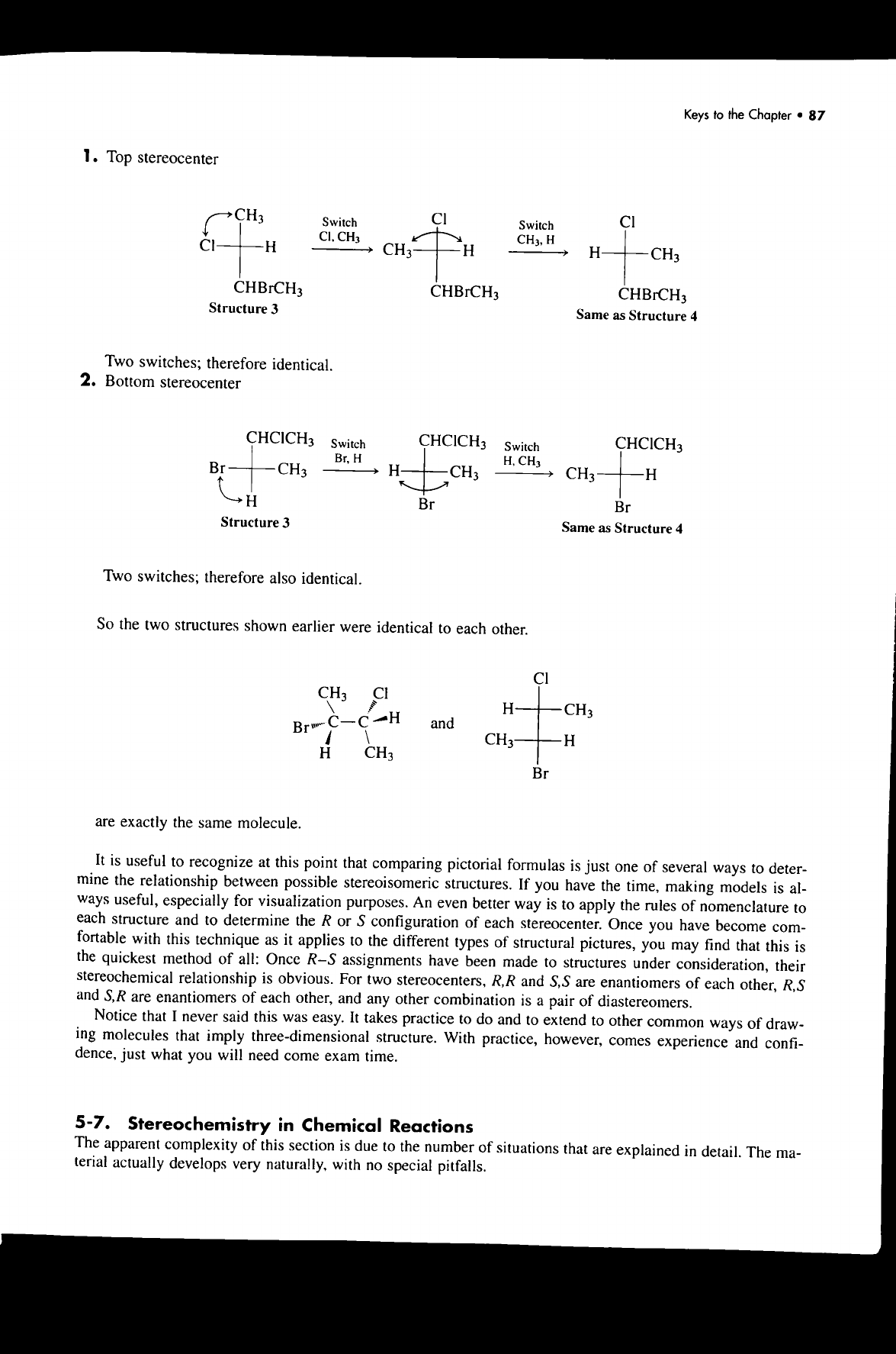 Keys to the Chapter 87 1. Top stereocenter CH₃ Switch Switch CH₃ CH₃, H CI H CH₃ H H CH₃ CHBrCH₃ CHBrCH₃ CHBrCH₃ Structure 3 Same as Structure 4 Two switches; therefore identical. 2. Bottom stereocenter CHCICH₃ Switch CHCICH₃ Switch CHCICH₃ Br, H H, CH₃ Br CH₃ H CH₃ CH₃ H H Br Br Structure 3 Same as Structure 4 Two switches; therefore also identical. So the two structures shown earlier were identical to each other. CH₃ H CH₃ Br C C H and CH₃ H H CH₃ Br are exactly the same molecule. It is useful to recognize at this point that comparing pictorial formulas is just one of several ways to deter- mine the relationship between possible stereoisomeric structures. If you have the time, making models is al- ways useful, especially for visualization purposes. An even better way is to apply the rules of nomenclature to each structure and to determine the R or S configuration of each stereocenter. Once you have become com- fortable with this technique as it applies to the different types of structural pictures, you may find that this is the quickest method of all: Once R-S assignments have been made to structures under consideration, their stereochemical relationship is obvious. For two stereocenters, R,R and S,S are enantiomers of each other, R,S and S,R are enantiomers of each other, and any other combination is a pair of diastereomers. Notice that I never said this was easy. It takes practice to do and to extend to other common ways of draw- ing molecules that imply three-dimensional structure. With practice, however, comes experience and confi- dence, just what you will need come exam time. 5-7. Stereochemistry in Chemical Reactions The apparent complexity of this section is due to the number of situations that are explained in detail. The ma- terial actually develops very naturally, with no special pitfalls.