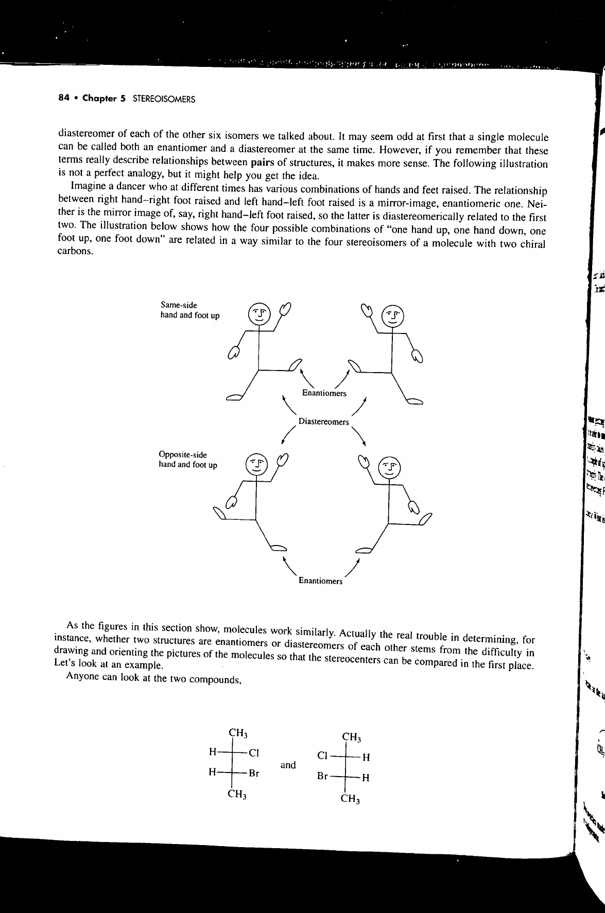 84 Chapter 5 STEREOISOMERS diastereomer of each of the other six isomers we talked about. It may seem odd at first that a single molecule can be called both an enantiomer and a diastereomer at the same time. However, if you remember that these terms really describe relationships between pairs of structures, it makes more sense. The following illustration is not a perfect analogy, but it might help you get the idea. Imagine a dancer who at different times has various combinations of hands and feet raised. The relationship between right hand-right foot raised and left hand-left foot raised is a mirror-image, enantiomeric one. Nei- ther is the mirror image of, say, right hand-left foot raised, so the latter is diastereomerically related to the first two. The illustration below shows how the four possible combinations of "one hand up, one hand down, one foot up, one foot down" are related in a way similar to the four stereoisomers of a molecule with two chiral carbons. Same-side hand and foot up Enantiomers Diastereomers Opposite-side hand and foot up is Enantiomers As the figures in this section show, molecules work similarly. Actually the real trouble in determining, for instance, whether two structures are enantiomers or diastereomers of each other stems from the difficulty in drawing and orienting the pictures of the molecules so that the stereocenters can be compared in the first place. Let's look at an example. Anyone can look at the two compounds, CH₃ CH₃ H H and H Br Br H CH₃ CH₃