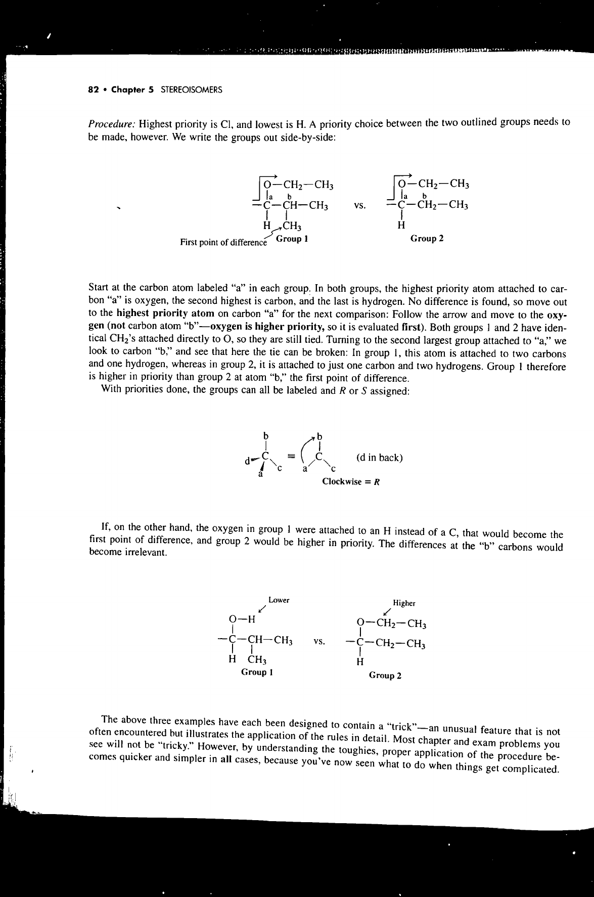 82 Chapter 5 STEREOISOMERS Procedure: Highest priority is Cl, and lowest is H. A priority choice between the two outlined groups needs to be made, however. We write the groups out side-by-side: b b CH CH₃ CH₂ CH₃ H CH₃ H First point of difference Group 1 Group 2 Start at the carbon atom labeled "a" in each group. In both groups, the highest priority atom attached to car- bon "a" is oxygen, the second highest is carbon, and the last is hydrogen. No difference is found, so move out to the highest priority atom on carbon "a" for the next comparison: Follow the arrow and move to the oxy- gen (not carbon atom "b"-oxygen is higher priority, so it is evaluated first). Both groups 1 and 2 have iden- tical CH₂'s attached directly to O, so they are still tied. Turning to the second largest group attached to "a," we look to carbon "b," and see that here the tie can be broken: In group 1, this atom is attached to two carbons and one hydrogen, whereas in group 2, it is attached to just one carbon and two hydrogens. Group 1 therefore is higher in priority than group 2 at atom "b," the first point of difference. With priorities done, the groups can all be labeled and R or S assigned: b b C III C d (d in back) c a c a Clockwise = R If, on the other hand, the oxygen in group 1 were attached to an H instead of a C, that would become the first point of difference, and group 2 would be higher in priority. The differences at the "b" carbons would become irrelevant. Lower Higher C CH CH₃ VS. H CH₃ H Group 1 Group 2 The above three examples have each been designed to contain a "trick"-an unusual feature that is not often encountered but illustrates the application of the rules in detail. Most chapter and exam problems you see will not be "tricky." However, by understanding the toughies, proper application of the procedure be- comes quicker and simpler in all cases, because you've now seen what to do when things get complicated.