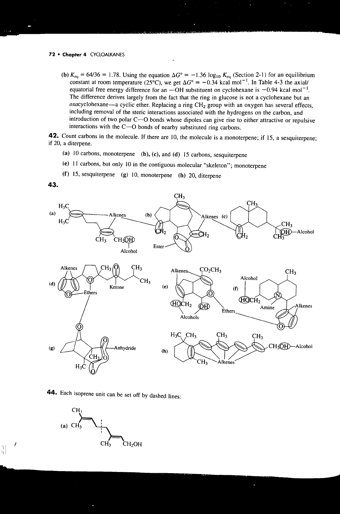 72 Chapter 4 CYCLOALKANES (b) = 64/36 = 1.78. Using the equation G° = - -1.36 log₁₀ (Section 2-1) for an equilibrium constant at room temperature (25°C), we get G° = - -0.34 kcal mol⁻¹. In Table 4-3 the axial/ equatorial free energy difference for an -OH substituent on cyclohexane is -0.94 kcal mol⁻¹. The difference derives largely from the fact that the ring in glucose is not a cyclohexane but an oxacyclohexane-a cyclic ether. Replacing a ring CH₂ group with an oxygen has several effects, including removal of the steric interactions associated with the hydrogens on the carbon, and introduction of two polar bonds whose dipoles can give rise to either attractive or repulsive interactions with the bonds of nearby substituted ring carbons. 42. Count carbons in the molecule. If there are 10, the molecule is a monoterpene; if 15, a sesquiterpene; if 20, a diterpene. (a) 10 carbons, monoterpene (b), (c), and (d) 15 carbons, sesquiterpene (e) 11 carbons, but only 10 in the contiguous molecular "skeleton"; monoterpene (f) 15, sesquiterpene (g) 10, monoterpene (h) 20, diterpene 43. CH₃ CH₃ (a) Alkenes (b) Alkenes (c) H₃C CH₃ H₂ OH Alcohol CHOH CH₂ CH₃ CH₃ Ester Alcohol Alkenes CH₃ CH₃ Alkenes CO₂CH₃ CH₃ Alcohol (d) CH₃ Ketone (e) (f) Ethers N HOCH2 OH Amine Alkenes Ethers Alcohols H₃C CH₃ CH₃ CH₃ (g) Anhydride CHOH Alcohol (h) CH₃ CH₃ Alkenes H₃C 44. Each isoprene unit can be set off by dashed lines: CH₃ (a) CH₃ CH₃ CH₂OH