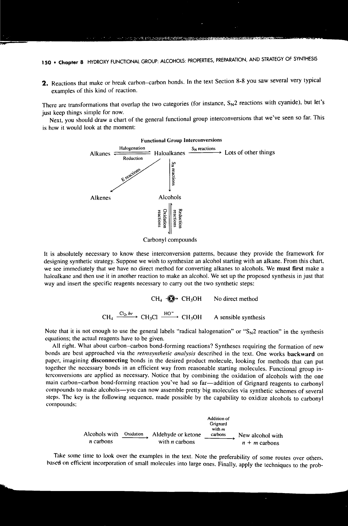 150 Chapter 8 HYDROXY FUNCTIONAL GROUP: ALCOHOLS: PROPERTIES, PREPARATION, AND STRATEGY OF SYNTHESIS 2. Reactions that make or break carbon-carbon bonds. In the text Section 8-8 you saw several very typical examples of this kind of reaction. There are transformations that overlap the two categories (for instance, reactions with cyanide), but let's just keep things simple for now. Next, you should draw a chart of the general functional group interconversions that we've seen so far. This is how it would look at the moment: Functional Group Interconversions Halogenation SN reactions Alkanes Haloalkanes Lots of other things Reduction reactions reactions NS Alkenes Alcohols reactions Oxidation reactions Reduction Carbonyl compounds It is absolutely necessary to know these interconversion patterns, because they provide the framework for designing synthetic strategy. Suppose we wish to synthesize an alcohol starting with an alkane. From this chart, we see immediately that we have no direct method for converting alkanes to alcohols. We must first make a haloalkane and then use it in another reaction to make an alcohol. We set up the proposed synthesis in just that way and insert the specific reagents necessary to carry out the two synthetic steps: CH₄ No direct method Cl₂, hv CH₄ CH₃Cl CH₃OH A sensible synthesis Note that it is not enough to use the general labels "radical halogenation" or "SN2 reaction" in the synthesis equations; the actual reagents have to be given. All right. What about carbon-carbon bond-forming reactions? Syntheses requiring the formation of new bonds are best approached via the retrosynthetic analysis described in the text. One works backward on paper, imagining disconnecting bonds in the desired product molecule, looking for methods that can put together the necessary bonds in an efficient way from reasonable starting molecules. Functional group in- terconversions are applied as necessary. Notice that by combining the oxidation of alcohols with the one main carbon-carbon bond-forming reaction you've had so far-addition of Grignard reagents to carbonyl compounds to make alcohols-you can now assemble pretty big molecules via synthetic schemes of several steps. The key is the following sequence. made possible by the capability to oxidize alcohols to carbonyl compounds: Addition of Grignard with m Alcohols with Oxidation Aldehyde or ketone carbons New alcohol with carbons with n carbons n + m carbons Take some time to look over the examples in the text. Note the preferability of some routes over based on efficient incorporation of small molecules into large ones. Finally, apply the techniques to the prob-