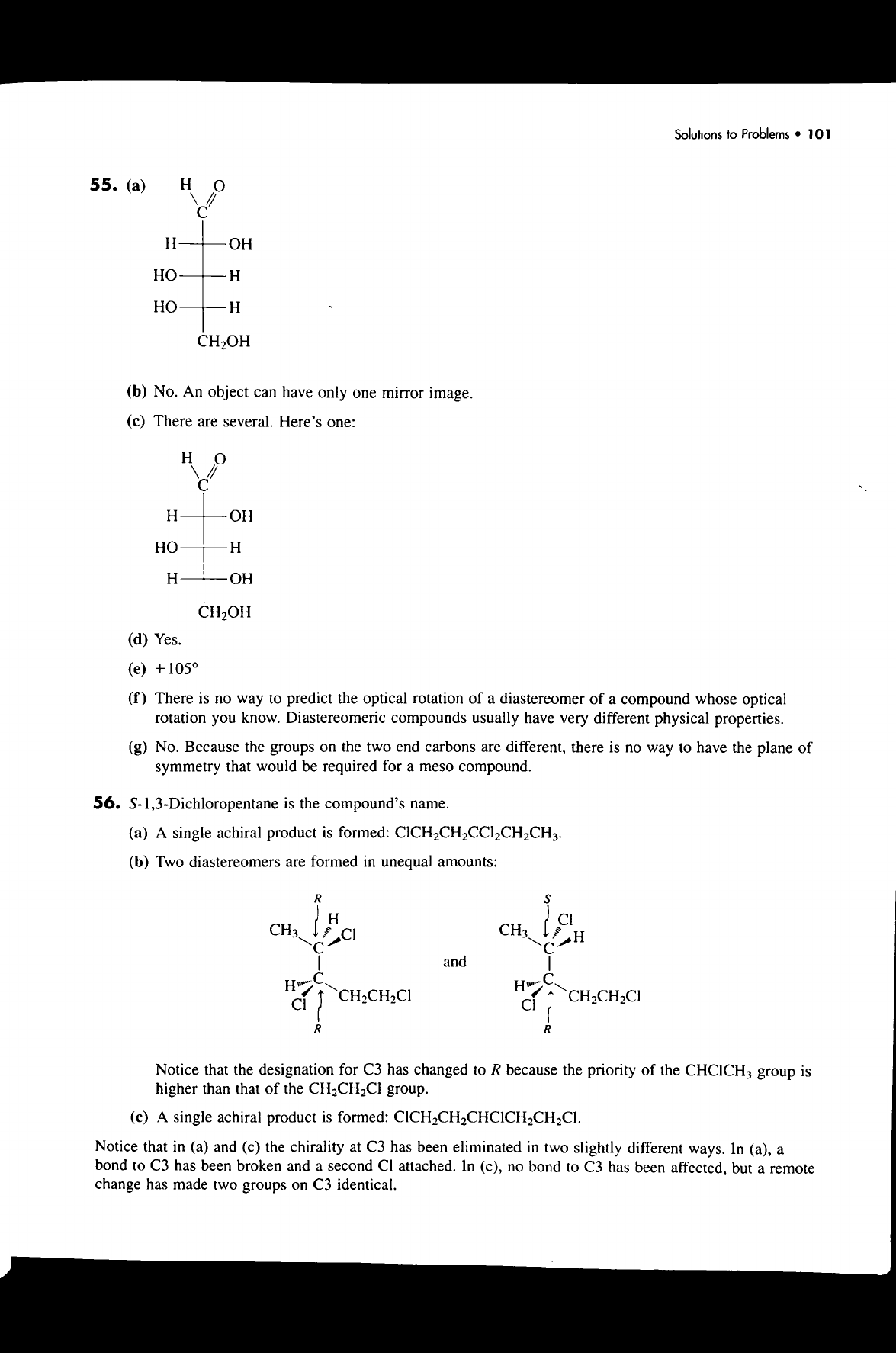 Solutions to Problems 101 55. (a) H C H OH H HO H CH₂OH (b) No. An object can have only one mirror image. (c) There are several. Here's one: H C H OH HO H H OH CH₂OH (d) Yes. (e) + 105° (f) There is no way to predict the optical rotation of a diastereomer of a compound whose optical rotation you know. Diastereomeric compounds usually have very different physical properties. (g) No. Because the groups on the two end carbons are different, there is no way to have the plane of symmetry that would be required for a meso compound. 56. S-1,3-Dichloropentane is the compound's name. (a) A single achiral product is formed: (b) Two diastereomers are formed in unequal amounts: R S H CI CH₃ CI CH₃ H C C and C C H H CH₂CH₂Cl Cl CH₂CH₂Cl R R Notice that the designation for C3 has changed to R because the priority of the CHCICH₃ group is higher than that of the CH₂CH₂Cl group. (c) A single achiral product is formed: Notice that in (a) and (c) the chirality at C3 has been eliminated in two slightly different ways. In (a), a bond to C3 has been broken and a second Cl attached. In (c), no bond to C3 has been affected, but a remote change has made two groups on C3 identical.