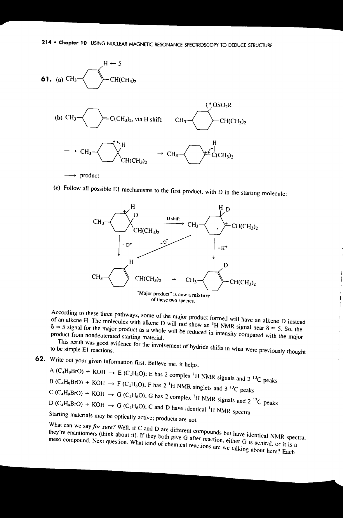 214 Chapter 10 USING NUCLEAR MAGNETIC RESONANCE SPECTROSCOPY TO DEDUCE STRUCTURE H 5 61. (a) CH₃ CH(CH₃)₂ OSO₂R (b) CH₃ C(CH₃)₂, via H shift: CH₃ CH(CH₃)₂ H + H CH₃ CH₃ C(CH₃)₂ CH(CH₃)₂ product (c) Follow all possible El mechanisms to the first with D in the starting molecule: H HD + D D shift + CH₃ CH₃ CH(CH₃)₂ CH(CH₃)₂ -H+ H D CH₃ CH(CH₃)₂ + CH₃ CH(CH₃)₂ "Major product" is now a mixture of these two species. According to these three pathways, some of the major product formed will have an alkene D instead of an alkene H. The molecules with alkene D will not show an NMR signal near δ = 5. So, the δ = 5 signal for the major product as a whole will be reduced in intensity compared with the major product from nondeuterated starting material. This result was good evidence for the involvement of hydride shifts in what were previously thought to be simple El reactions. 62. Write out your given information first. Believe me. it helps. A + E E has 2 complex NMR signals and 2 peaks B + KOH F (C₁H₈O); F has 2 'H NMR singlets and 3 peaks C + G (C₁H₈O); G has 2 complex ¹H NMR signals and 2 peaks D + G C and D have identical ¹H NMR spectra Starting materials may be optically active; products are not. What can we say for sure? Well, if C and D are different compounds but have identical NMR they're enantiomers (think about it). If they both give G after reaction, either G is or it is a meso compound. Next question. What kind of chemical reactions are we talking about here? Each