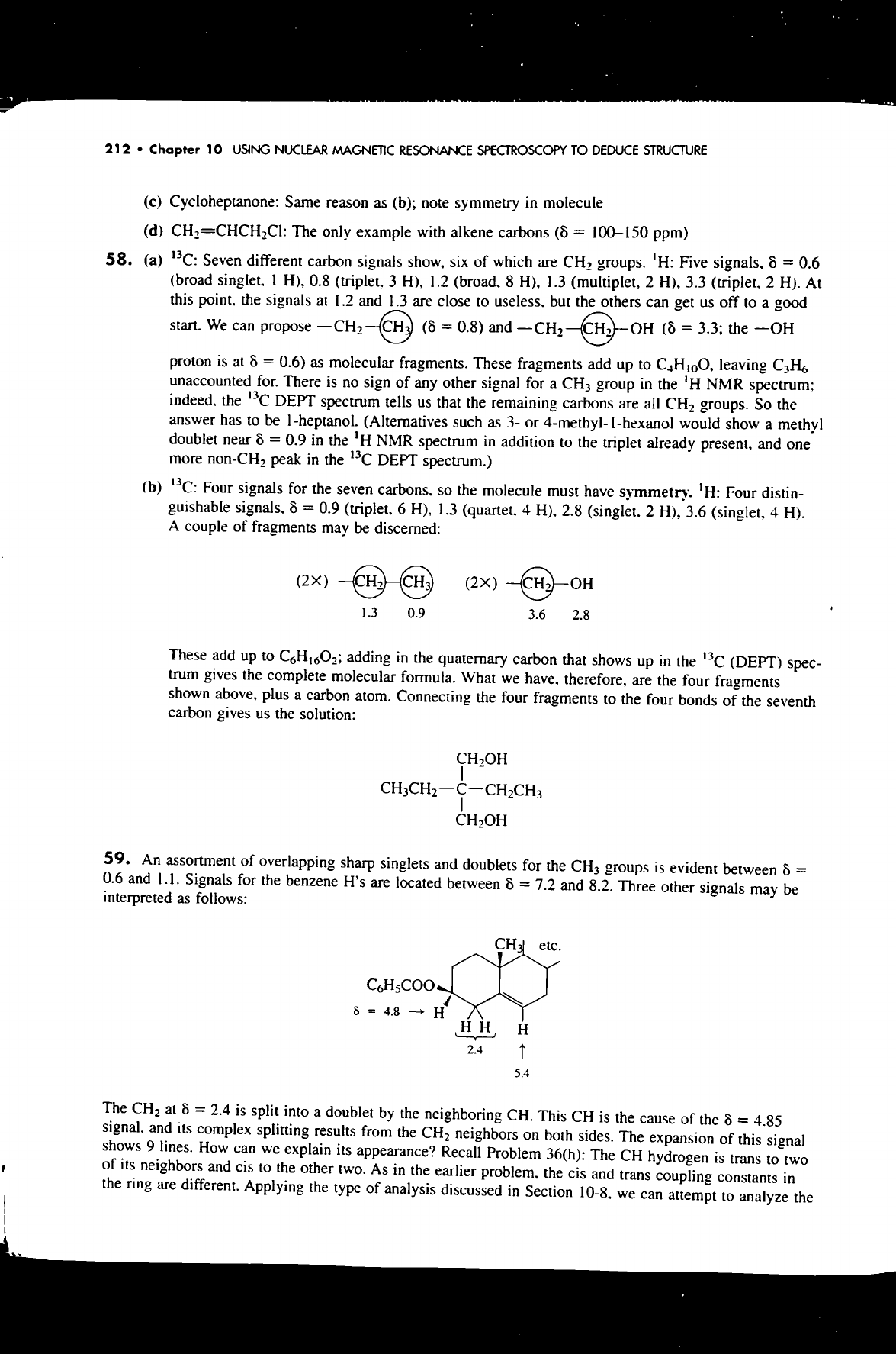 212 Chapter 10 USING NUCLEAR MAGNETIC RESONANCE SPECTROSCOPY TO DEDUCE STRUCTURE (c) Cycloheptanone: Same reason as (b); note symmetry in molecule (d) The only example with alkene carbons (δ = 100-150 ppm) 58. (a) ¹³C: Seven different carbon signals show, six of which are CH₂ groups. Five signals, δ = 0.6 (broad singlet. 1 H), 0.8 (triplet, 3 H), 1.2 (broad, 8 H), 1.3 (multiplet, 2 H), 3.3 2 H). At this point. the signals at 1.2 and 1.3 are close to but the others can get us off to a good start. We can propose CH₂ (δ = 0.8) and CH₂ OH (δ = 3.3; the -OH proton is at δ = 0.6) as molecular fragments. These fragments add up to leaving C₃H₆ unaccounted for. There is no sign of any other signal for a CH₃ group in the 'H NMR spectrum; indeed. the ¹³C DEPT spectrum tells us that the remaining carbons are all CH₂ groups. So the answer has to be 1-heptanol. (Alternatives such as 3- or would show a methyl doublet near δ = 0.9 in the 'H NMR spectrum in addition to the triplet already present. and one more non-CH₂ peak in the ¹³C DEPT spectrum.) (b) ¹³C: Four signals for the seven carbons. so the molecule must have symmetry. ¹H: Four distin- guishable signals. δ = 0.9 (triplet. 6 H), 1.3 (quartet. 4 H), 2.8 (singlet. 2 H), 3.6 (singlet, 4 H). A couple of fragments may be discerned: (2X) CH, (2X) OH 1.3 0.9 3.6 2.8 These add up to C₆H₁₆O₂; adding in the quaternary carbon that shows up in the ¹³C (DEPT) spec- trum gives the complete molecular formula. What we have, therefore, are the four fragments shown above, plus a carbon atom. Connecting the four fragments to the four bonds of the seventh carbon gives us the solution: CH₂OH CH₂OH 59. An assortment of overlapping sharp singlets and doublets for the CH₃ groups is evident between δ = 0.6 and 1.1. Signals for the benzene H's are located between δ = 7.2 and 8.2. Three other signals may be interpreted as follows: CH₃| etc. C₆H₅COO δ = 4.8 H HH, H 2.4 5.4 The CH₂ at δ = 2.4 is split into a doublet by the neighboring CH. This CH is the cause of the δ = 4.85 signal, and its complex splitting results from the CH₂ neighbors on both sides. The expansion of this signal shows 9 lines. How can we explain its appearance? Recall Problem 36(h): The CH hydrogen is trans to two of its neighbors and cis to the other two. As in the earlier problem, the cis and trans coupling constants in the ring are different. Applying the type of analysis discussed in Section 10-8, we can attempt to analyze the