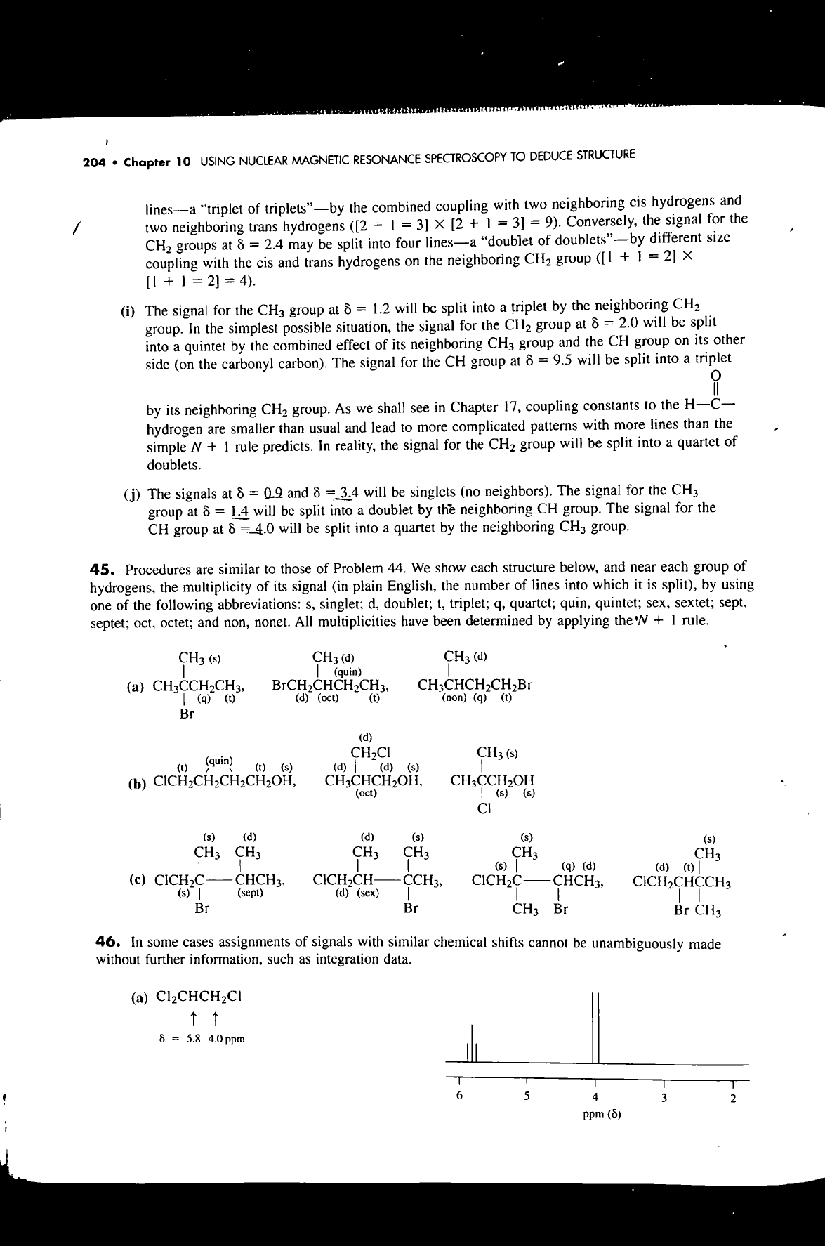 204 Chapter 10 USING NUCLEAR MAGNETIC RESONANCE SPECTROSCOPY TO DEDUCE STRUCTURE lines-a "triplet of triplets"-by the combined coupling with two neighboring cis hydrogens and two neighboring trans hydrogens ([2 + 1 = 3] X [2 + = 3] = 9). Conversely, the signal for the CH₂ groups at δ = 2.4 may be split into four lines-a "doublet of doublets"-by different size coupling with the cis and trans hydrogens on the neighboring CH₂ group ([1 + = 2] X + 1 = 2] = 4). (i) The signal for the CH₃ group at δ = 1.2 will be split into a triplet by the neighboring CH₂ group. In the simplest possible situation, the signal for the CH₂ group at δ = 2.0 will be split into a quintet by the combined effect of its neighboring CH₃ group and the CH group on its other side (on the carbonyl carbon). The signal for the CH group at δ = 9.5 will be split into a triplet O by its neighboring CH₂ group. As we shall see in Chapter 17, coupling constants to the H-C- hydrogen are smaller than usual and lead to more complicated patterns with more lines than the simple N + 1 rule predicts. In reality, the signal for the CH₂ group will be split into a quartet of doublets. (j) The signals at δ = 0.9 and δ will be singlets (no neighbors). The signal for the CH₃ group at δ = 1.4 will be split into a doublet by the neighboring CH group. The signal for the CH group at δ =4.0 will be split into a quartet by the neighboring CH₃ group. 45. Procedures are similar to those of Problem 44. We show each structure below, and near each group of hydrogens, the multiplicity of its signal (in plain English, the number of lines into which it is split), by using one of the following abbreviations: s, singlet; d, doublet; t, triplet; q, quartet; quin, quintet; sex, sextet; sept, septet; oct, octet; and non, nonet. All multiplicities have been determined by applying + 1 rule. CH₃ (s) CH₃ (d) (quin) (a) CH₃CCH₂CH₃, BrCH₂CHCH₂CH₃, CH₃CHCH₂CH₂Br (q) (t) (d) (oct) (t) (non) (q) (t) Br (d) CH₂Cl (quin) CH₃ (s) (t) / (t) (s) (d) (d) (s) (b) ClCH₂CH₂CH₂CH₂OH, CH₃CHCH₂OH, (oct) (s) (s) CI (s) (d) (d) (s) (s) (s) CH₃ CH₃ CH₃ CH₃ CH₃ CH₃ (s) (q) (d) (d) (t) (c) CICH₂C CHCH₃, CCH₃, CHCH₃, CICH₂CHCCH₃ (s) (sept) (d) (sex) Br Br CH₃ Br Br CH₃ 46. In some cases assignments of signals with similar chemical shifts cannot be unambiguously made without further information, such as integration data. (a) δ = 5.8 4.0 ppm 6 5 4 3 2 ppm (δ)