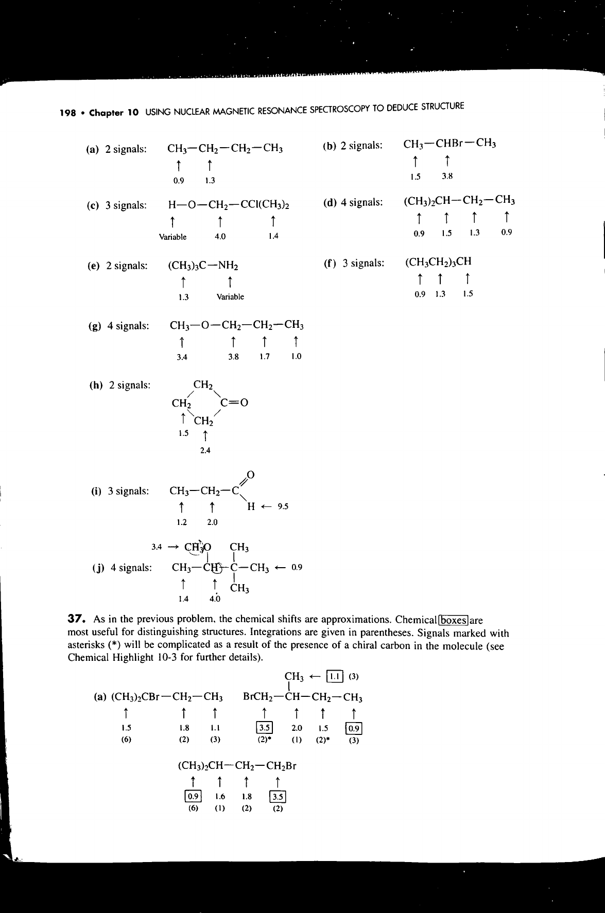198 Chapter 10 USING NUCLEAR MAGNETIC RESONANCE SPECTROSCOPY TO DEDUCE STRUCTURE (a) 2 signals: (b) 2 signals: 0.9 1.3 1.5 3.8 (c) 3 signals: (d) 4 signals: Variable 4.0 1.4 0.9 1.5 1.3 0.9 (e) 2 signals: (CH₃)₃C-NH₂ (f) 3 signals: (CH₃CH₂)₃CH 1.3 Variable 0.9 1.3 1.5 (g) 4 signals: 3.4 3.8 1.7 1.0 (h) 2 signals: CH₂ CH 2 CH₂ 1.5 2.4 O (i) 3 signals: CH₃-CH₂-C H 9.5 1.2 2.0 3.4 CH3O CH₃ (j) 4 signals: CH₃ 1.4 4.0 37. As in the previous problem, the chemical shifts are approximations. Chemical boxes are most useful for distinguishing structures. Integrations are given in parentheses. Signals marked with asterisks (*) will be complicated as a result of the presence of a chiral carbon in the molecule (see Chemical Highlight 10-3 for further details). CH₃ 1.1 (3) (a) 1.5 1.8 1.1 3.5 2.0 1.5 0.9 (6) (2) (3) (2)* (1) (2)* (3) 0.9 1.6 1.8 3.5 (6) (1) (2) (2)