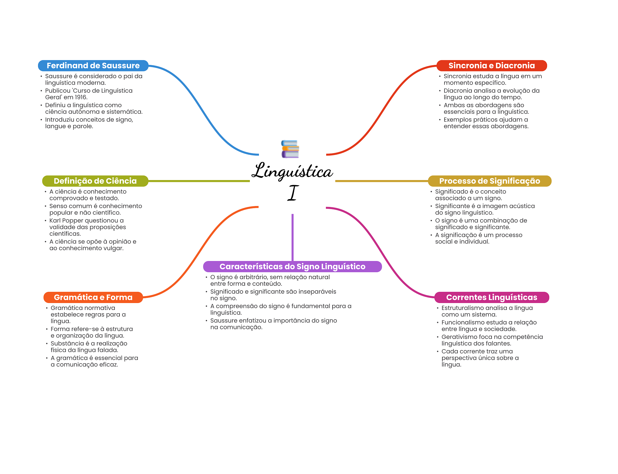 Ferdinand de Saussure Sincronia e Diacronia Saussure é considerado pai da Sincronia estuda a língua em um linguística moderna. momento específico. Publicou de Linguística Diacronia analisa a evolução da Geral' em 1916. língua ao longo do tempo. Definiu a linguística como Ambas as abordagens são ciência autônoma e sistemática. essenciais para a linguística. Introduziu conceitos de signo, Exemplos práticos ajudam a langue e parole. entender essas abordagens. Linguística Definição de Ciência Processo de Significação A ciência é conhecimento comprovado e testado. I Significado é O conceito associado a um signo. Senso comum é conhecimento Significante é a imagem acústica popular e não científico. do signo linguístico. Karl Popper questionou a signo é uma combinação de validade das proposições significado e significante. científicas. A significação é um processo A ciência se opõe à opinião e social e individual. ao conhecimento vulgar. Características do Signo Linguístico signo é arbitrário, sem relação natural entre forma e conteúdo. Significado e significante são inseparáveis Gramática e Forma no signo. Correntes Linguísticas Gramática normativa A compreensão do signo é fundamental para a Estruturalismo analisa a língua estabelece regras para a linguística. como um sistema. língua. Saussure enfatizou a importância do signo Funcionalismo estuda a relação Forma refere-se à estrutura na comunicação. entre língua e sociedade. e organização da língua. Gerativismo foca na competência Substância é a realização linguística dos falantes. física da língua falada. Cada corrente traz uma A gramática é essencial para perspectiva única sobre a a comunicação eficaz. língua.