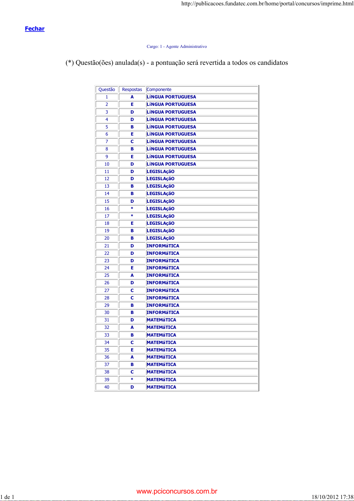 pcimarkpci MjgwNDoxMDhjOmQwZGU6ZjAwMDowOTI3OmQ2YjE6MDFiNjplODlh:VHVlLCAxNiBKYW4gMjAyNCAyMTo0MDo1NSAtMDMwMA== www.pciconcursos.com.br Fechar Cargo: 1 - Agente Administrativo (*) Questão(ões) anulada(s) - a pontuação será revertida a todos os candidatos Questão Respostas Componente 1 A LíNGUA PORTUGUESA 2 E LíNGUA PORTUGUESA 3 D LíNGUA PORTUGUESA 4 D LíNGUA PORTUGUESA 5 B LíNGUA PORTUGUESA 6 E LíNGUA PORTUGUESA 7 C LíNGUA PORTUGUESA 8 B LíNGUA PORTUGUESA 9 E LíNGUA PORTUGUESA 10 D LíNGUA PORTUGUESA 11 D LEGISLAçãO 12 D LEGISLAçãO 13 B LEGISLAçãO 14 B LEGISLAçãO 15 D LEGISLAçãO 16 * LEGISLAçãO 17 * LEGISLAçãO 18 E LEGISLAçãO 19 B LEGISLAçãO 20 B LEGISLAçãO 21 D INFORMáTICA 22 D INFORMáTICA 23 D INFORMáTICA 24 E INFORMáTICA 25 A INFORMáTICA 26 D INFORMáTICA 27 C INFORMáTICA 28 C INFORMáTICA 29 B INFORMáTICA 30 B INFORMáTICA 31 D MATEMáTICA 32 A MATEMáTICA 33 B MATEMáTICA 34 C MATEMáTICA 35 E MATEMáTICA 36 A MATEMáTICA 37 B MATEMáTICA 38 C MATEMáTICA 39 * MATEMáTICA 40 D MATEMáTICA http://publicacoes.fundatec.com.br/home/portal/concursos/imprime.html 1 de 1 18/10/2012 17:38 www.pciconcursos.com.br pcimarkpci MjgwNDoxMDhjOmQwZGU6ZjAwMDowOTI3OmQ2YjE6MDFiNjplODlh:VHVlLCAxNiBKYW4gMjAyNCAyMTo0MDo1NSAtMDMwMA== www.pciconcursos.com.br Fechar Cargo: 2 - Agente de Combate à Endemias (*) Questão(ões) anulada(s) - a pontuação será revertida a todos os candidatos Questão Respostas Componente 1 D LíNGUA PORTUGUESA 2 D LíNGUA PORTUGUESA 3 A LíNGUA PORTUGUESA 4 D LíNGUA PORTUGUESA 5 B LíNGUA PORTUGUESA 6 E LíNGUA PORTUGUESA 7 C LíNGUA PORTUGUESA 8 A LíNGUA PORTUGUESA 9 B LíNGUA PORTUGUESA 10 E LíNGUA PORTUGUESA 11 C LíNGUA PORTUGUESA 12 C LíNGUA PORTUGUESA 13 D LíNGUA PORTUGUESA 14 E LíNGUA PORTUGUESA 15 B LíNGUA PORTUGUESA 16 A MATEMáTICA 17 C MATEMáTICA 18 D MATEMáTICA 19 B MATEMáTICA 20 C MATEMáTICA 21 E MATEMáTICA 22 C MATEMáTICA 23 D MATEMáTICA 24 B MATEMáTICA 25 A MATEMáTICA 26 E MATEMáTICA 27 C MATEMáTICA 28 D MATEMáTICA 29 B MATEMáTICA 30 E MATEMáTICA 31 D LEGISLAçãO 32 E LEGISLAçãO 33 C LEGISLAçãO 34 D LEGISLAçãO 35 C LEGISLAçãO 36 A LEGISLAçãO 37 C LEGISLAçãO 38 C LEGISLAçãO 39 A LEGISLAçãO 40 C LEGISLAçãO http://publicacoes.fundatec.com.br/home/portal/concursos/imprime.html 1 de 1 18/10/2012 17:38 www.pciconcursos.com.br pcimarkpci MjgwNDoxMDhjOmQwZGU6ZjAwMDowOTI3OmQ2YjE6MDFiNjplODlh:VHVlLCAxNiBKYW4gMjAyNCAyMTo0MDo1NSAtMDMwMA== www.pciconcursos.com.br Fechar Cargo: 3 - Arquiteto (*) Questão(ões) anulada(s) - a pontuação será revertida a todos os candidatos Questão Respostas Componente 1 E LíNGUA PORTUGUESA 2 E LíNGUA PORTUGUESA 3 C LíNGUA PORTUGUESA 4 A LíNGUA PORTUGUESA 5 A LíNGUA PORTUGUESA 6 D LíNGUA PORTUGUESA 7 D LíNGUA PORTUGUESA 8 A LíNGUA PORTUGUESA 9 B LíNGUA PORTUGUESA 10 E LíNGUA PORTUGUESA 11 A LíNGUA PORTUGUESA 12 E LíNGUA PORTUGUESA 13 D LEGISLAçãO 14 A LEGISLAçãO 15 D LEGISLAçãO 16 B LEGISLAçãO 17 E LEGISLAçãO 18 C LEGISLAçãO 19 D LEGISLAçãO 20 C LEGISLAçãO 21 C LEGISLAçãO 22 C LEGISLAçãO 23 E INFORMáTICA 24 B INFORMáTICA 25 C INFORMáTICA 26 A INFORMáTICA 27 A INFORMáTICA 28 C INFORMáTICA 29 E INFORMáTICA 30 A INFORMáTICA 31 C INFORMáTICA 32 B INFORMáTICA 33 C CONHECIMENTOS ESPECIFICOS 34 A CONHECIMENTOS ESPECIFICOS 35 C CONHECIMENTOS ESPECIFICOS 36 E CONHECIMENTOS ESPECIFICOS 37 C CONHECIMENTOS ESPECIFICOS 38 E CONHECIMENTOS ESPECIFICOS 39 A CONHECIMENTOS ESPECIFICOS 40 D CONHECIMENTOS ESPECIFICOS http://publicacoes.fundatec.com.br/home/portal/concursos/imprime.html 1 de 1 18/10/2012 17:39 www.pciconcursos.com.br pcimarkpci MjgwNDoxMDhjOmQwZGU6ZjAwMDowOTI3OmQ2YjE6MDFiNjplODlh:VHVlLCAxNiBKYW4gMjAyNCAyMTo0MDo1NSAtMDMwMA== www.pciconcursos.com.br Fechar Cargo: 4 - Assistente Social (*) Questão(ões) anulada(s) - a pontuação será revertida a todos os candidatos Questão Respostas Componente 1 E LíNGUA PORTUGUESA 2 E LíNGUA PORTUGUESA 3 C LíNGUA PORTUGUESA 4 A LíNGUA PORTUGUESA 5 A LíNGUA PORTUGUESA 6 D LíNGUA PORTUGUESA 7 D LíNGUA PORTUGUESA 8 A LíNGUA PORTUGUESA 9 B LíNGUA PORTUGUESA 10 E LíNGUA PORTUGUESA 11 A LíNGUA PORTUGUESA 12 E LíNGUA PORTUGUESA 13 D LEGISLAçãO 14 A LEGISLAçãO 15 D LEGISLAçãO 16 B LEGISLAçãO 17 E LEGISLAçãO 18 C LEGISLAçãO 19 D LEGISLAçãO 20 B LEGISLAçãO 21 B LEGISLAçãO 22 * LEGISLAçãO 23 E INFORMáTICA 24 B INFORMáTICA 25 C INFORMáTICA 26 A INFORMáTICA 27 A INFORMáTICA 28 C INFORMáTICA 29 E INFORMáTICA 30 A INFORMáTICA 31 C INFORMáTICA 32 B INFORMáTICA 33 A CONHECIMENTOS ESPECIFICOS 34 A CONHECIMENTOS ESPECIFICOS 35 C CONHECIMENTOS ESPECIFICOS 36 A CONHECIMENTOS ESPECIFICOS 37 C CONHECIMENTOS ESPECIFICOS 38 D CONHECIMENTOS ESPECIFICOS 39 E CONHECIMENTOS ESPECIFICOS 40 A CONHECIMENTOS ESPECIFICOS http://publicacoes.fundatec.com.br/home/portal/concursos/imprime.html 1 de 1 18/10/2012 17:39 www.pciconcursos.com.br pcimarkpci MjgwNDoxMDhjOmQwZGU6ZjAwMDowOTI3OmQ2YjE6MDFiNjplODlh:VHVlLCAxNiBKYW4gMjAyNCAyMTo0MDo1NSAtMDMwMA== www.pciconcursos.com.br Fechar Cargo: 5 - Auxiliar de Farmácia (*) Questão(ões) anulada(s) - a pontuação será revertida a todos os candidatos Questão Respostas Componente 1 D LíNGUA PORTUGUESA 2 D LíNGUA PORTUGUESA 3 A LíNGUA PORTUGUESA 4 D LíNGUA PORTUGUESA 5 B LíNGUA PORTUGUESA 6 E LíNGUA PORTUGUESA 7 C LíNGUA PORTUGUESA 8 A LíNGUA PORTUGUESA 9 B LíNGUA PORTUGUESA 10 E LíNGUA PORTUGUESA 11 C LíNGUA PORTUGUESA 12 C LíNGUA PORTUGUESA 13 D LíNGUA PORTUGUESA 14 E LíNGUA PORTUGUESA 15 B LíNGUA PORTUGUESA 16 A MATEMáTICA 17 C MATEMáTICA 18 D MATEMáTICA 19 B MATEMáTICA 20 C MATEMáTICA 21 E MATEMáTICA 22 C MATEMáTICA 23 D MATEMáTICA 24 B MATEMáTICA 25 A MATEMáTICA 26 E MATEMáTICA 27 C MATEMáTICA 28 D MATEMáTICA 29 B MATEMáTICA 30 E MATEMáTICA 31 D LEGISLAçãO 32 E LEGISLAçãO 33 C LEGISLAçãO 34 D LEGISLAçãO 35 C LEGISLAçãO 36 A LEGISLAçãO 37 C LEGISLAçãO 38 C LEGISLAçãO 39 E LEGISLAçãO 40 D LEGISLA