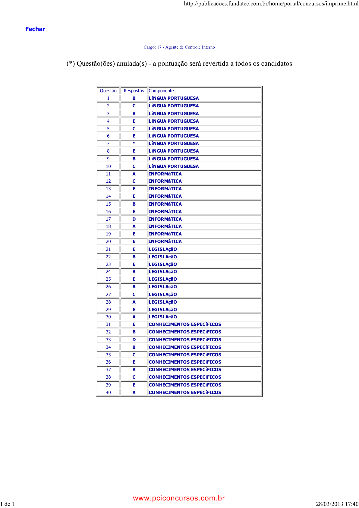 pcimarkpci MjgwNDoxMDhjOmQwZGU6ZjAwMDowOTI3OmQ2YjE6MDFiNjplODlh:VHVlLCAxNiBKYW4gMjAyNCAyMTozNTo1MyAtMDMwMA== www.pciconcursos.com.br Fechar Cargo: 17 - Agente de Controle Interno (*) Questão(ões) anulada(s) - a pontuação será revertida a todos os candidatos Questão Respostas Componente 1 B LíNGUA PORTUGUESA 2 C LíNGUA PORTUGUESA 3 A LíNGUA PORTUGUESA 4 E LíNGUA PORTUGUESA 5 C LíNGUA PORTUGUESA 6 E LíNGUA PORTUGUESA 7 * LíNGUA PORTUGUESA 8 E LíNGUA PORTUGUESA 9 B LíNGUA PORTUGUESA 10 C LíNGUA PORTUGUESA 11 A INFORMáTICA 12 C INFORMáTICA 13 E INFORMáTICA 14 E INFORMáTICA 15 B INFORMáTICA 16 E INFORMáTICA 17 D INFORMáTICA 18 A INFORMáTICA 19 E INFORMáTICA 20 E INFORMáTICA 21 E LEGISLAçãO 22 B LEGISLAçãO 23 E LEGISLAçãO 24 A LEGISLAçãO 25 E LEGISLAçãO 26 B LEGISLAçãO 27 C LEGISLAçãO 28 A LEGISLAçãO 29 E LEGISLAçãO 30 A LEGISLAçãO 31 E CONHECIMENTOS ESPECíFICOS 32 B CONHECIMENTOS ESPECíFICOS 33 D CONHECIMENTOS ESPECíFICOS 34 B CONHECIMENTOS ESPECíFICOS 35 C CONHECIMENTOS ESPECíFICOS 36 E CONHECIMENTOS ESPECíFICOS 37 A CONHECIMENTOS ESPECíFICOS 38 C CONHECIMENTOS ESPECíFICOS 39 E CONHECIMENTOS ESPECíFICOS 40 A CONHECIMENTOS ESPECíFICOS http://publicacoes.fundatec.com.br/home/portal/concursos/imprime.html 1 de 1 28/03/2013 17:40 www.pciconcursos.com.br pcimarkpci MjgwNDoxMDhjOmQwZGU6ZjAwMDowOTI3OmQ2YjE6MDFiNjplODlh:VHVlLCAxNiBKYW4gMjAyNCAyMTozNTo1MyAtMDMwMA== www.pciconcursos.com.br Fechar Cargo: 18 - Agente de Estratégias de Saúde da Família – Área “A” (*) Questão(ões) anulada(s) - a pontuação será revertida a todos os candidatos Questão Respostas Componente 1 B LíNGUA PORTUGUESA 2 A LíNGUA PORTUGUESA 3 C LíNGUA PORTUGUESA 4 A LíNGUA PORTUGUESA 5 E LíNGUA PORTUGUESA 6 D LíNGUA PORTUGUESA 7 C LíNGUA PORTUGUESA 8 D LíNGUA PORTUGUESA 9 B LíNGUA PORTUGUESA 10 D LíNGUA PORTUGUESA 11 E LíNGUA PORTUGUESA 12 C LíNGUA PORTUGUESA 13 C LíNGUA PORTUGUESA 14 A LíNGUA PORTUGUESA 15 C LíNGUA PORTUGUESA 16 C MATEMáTICA 17 A MATEMáTICA 18 A MATEMáTICA 19 E MATEMáTICA 20 B MATEMáTICA 21 D MATEMáTICA 22 A MATEMáTICA 23 B MATEMáTICA 24 E MATEMáTICA 25 E MATEMáTICA 26 C MATEMáTICA 27 E MATEMáTICA 28 B MATEMáTICA 29 C MATEMáTICA 30 D MATEMáTICA 31 D LEGISLAçãO 32 E LEGISLAçãO 33 E LEGISLAçãO 34 * LEGISLAçãO 35 A LEGISLAçãO 36 D LEGISLAçãO 37 C LEGISLAçãO 38 D LEGISLAçãO 39 A LEGISLAçãO 40 D LEGISLAçãO http://publicacoes.fundatec.com.br/home/portal/concursos/imprime.html 1 de 1 28/03/2013 17:40 www.pciconcursos.com.br pcimarkpci MjgwNDoxMDhjOmQwZGU6ZjAwMDowOTI3OmQ2YjE6MDFiNjplODlh:VHVlLCAxNiBKYW4gMjAyNCAyMTozNTo1MyAtMDMwMA== www.pciconcursos.com.br Fechar Cargo: 22 - Agente Fiscal de Obras e Posturas (*) Questão(ões) anulada(s) - a pontuação será revertida a todos os candidatos Questão Respostas Componente 1 E LíNGUA PORTUGUESA 2 D LíNGUA PORTUGUESA 3 B LíNGUA PORTUGUESA 4 C LíNGUA PORTUGUESA 5 A LíNGUA PORTUGUESA 6 A LíNGUA PORTUGUESA 7 D LíNGUA PORTUGUESA 8 B LíNGUA PORTUGUESA 9 D LíNGUA PORTUGUESA 10 C LíNGUA PORTUGUESA 11 * INFORMáTICA 12 D INFORMáTICA 13 A INFORMáTICA 14 C INFORMáTICA 15 B INFORMáTICA 16 A INFORMáTICA 17 E INFORMáTICA 18 E INFORMáTICA 19 C INFORMáTICA 20 A INFORMáTICA 21 B LEGISLAçãO 22 E LEGISLAçãO 23 D LEGISLAçãO 24 A LEGISLAçãO 25 C LEGISLAçãO 26 E LEGISLAçãO 27 E LEGISLAçãO 28 A LEGISLAçãO 29 B LEGISLAçãO 30 D LEGISLAçãO 31 B MATEMáTICA 32 D MATEMáTICA 33 C MATEMáTICA 34 A MATEMáTICA 35 D MATEMáTICA 36 * MATEMáTICA 37 B MATEMáTICA 38 A MATEMáTICA 39 C MATEMáTICA 40 D MATEMáTICA http://publicacoes.fundatec.com.br/home/portal/concursos/imprime.html 1 de 1 28/03/2013 17:42 www.pciconcursos.com.br pcimarkpci MjgwNDoxMDhjOmQwZGU6ZjAwMDowOTI3OmQ2YjE6MDFiNjplODlh:VHVlLCAxNiBKYW4gMjAyNCAyMTozNTo1MyAtMDMwMA== www.pciconcursos.com.br Fechar Cargo: 23 - Analista Clínico (*) Questão(ões) anulada(s) - a pontuação será revertida a todos os candidatos Questão Respostas Componente 1 B LíNGUA PORTUGUESA 2 C LíNGUA PORTUGUESA 3 A LíNGUA PORTUGUESA 4 E LíNGUA PORTUGUESA 5 C LíNGUA PORTUGUESA 6 E LíNGUA PORTUGUESA 7 * LíNGUA PORTUGUESA 8 E LíNGUA PORTUGUESA 9 B LíNGUA PORTUGUESA 10 C LíNGUA PORTUGUESA 11 A INFORMáTICA 12 C INFORMáTICA 13 E INFORMáTICA 14 E INFORMáTICA 15 B INFORMáTICA 16 E INFORMáTICA 17 D INFORMáTICA 18 A INFORMáTICA 19 E INFORMáTICA 20 E INFORMáTICA 21 E LEGISLAçãO 22 B LEGISLAçãO 23 E LEGISLAçãO 24 A LEGISLAçãO 25 E LEGISLAçãO 26 B LEGISLAçãO 27 C LEGISLAçãO 28 A LEGISLAçãO 29 E LEGISLAçãO 30 A LEGISLAçãO 31 A CONHECIMENTOS ESPECíFICOS 32 D CONHECIMENTOS ESPECíFICOS 33 C CONHECIMENTOS ESPECíFICOS 34 C CONHECIMENTOS ESPECíFICOS 35 B CONHECIMENTOS ESPECíFICOS 36 A CONHECIMENTOS ESPECíFICOS 37 B CONHECIMENTOS ESPECíFICOS 38 B CONHECIMENTOS ESPECíFICOS 39 A CONHECIMENTOS ESPECíFICOS 40 E CONHECIMENTOS ESPECíFICOS http://publicacoes.fundatec.com.br/home/portal/concursos/imprime.html 1 de 1 28/03/2013 17:42 www.pciconcursos.com.br pcimarkpci MjgwNDoxMDhjOmQwZGU6ZjAwMDowOTI3OmQ2YjE6MDFiNjplODlh:VHVlLCAxNiBKYW4gMjAyNCAyMTozNTo1MyAtMDMwMA== www.pciconcursos.com.br Fechar Cargo: 24 - Arquiteto e Urbanista (*) Questão(ões) anulada(s) - a pontuação será revertida a todos os candidatos Questão Respostas Componente 1 B LíNGUA PORTUGUESA 2 C LíNGUA PORTUGUESA 3 A LíNGUA PORTUGUESA 4 E LíNGUA PORTUGUESA 5 C LíNGUA PORTUGUESA 6 E LíNGUA PORTUGUESA 7 * LíNGUA PORTUGUESA 8 E LíNGUA PORTUGUESA 9 B LíNGUA PORTUGUESA 10 C LíNGUA PORTUGUESA 11 A INFORMáTICA 12 C INFORMáTICA 13 E INFORMáTICA 14 E INFORMáTICA 15 B INFORMáTICA 16 E INFORMáTICA 17 D INFORMáTICA 18 A INFORMáTICA 19 E INFORMáTICA 20 E INFORMáTICA 21 E LEGISLAçãO 22 B LEGISLAçãO 23 E LEGISLAçãO 24 A LEGISLAçãO 25 E LEGISLAçãO 26 B LEGISLAçãO 27 C LEGISLAçãO 28 A LEGISLAçãO 29 E LEGISLAçãO 30 A LEGISLAçãO 31 C CONHECIMENTOS ESPECíFICOS 32 D CONHECIMENTOS ESPECíFICOS 33 A CONHE