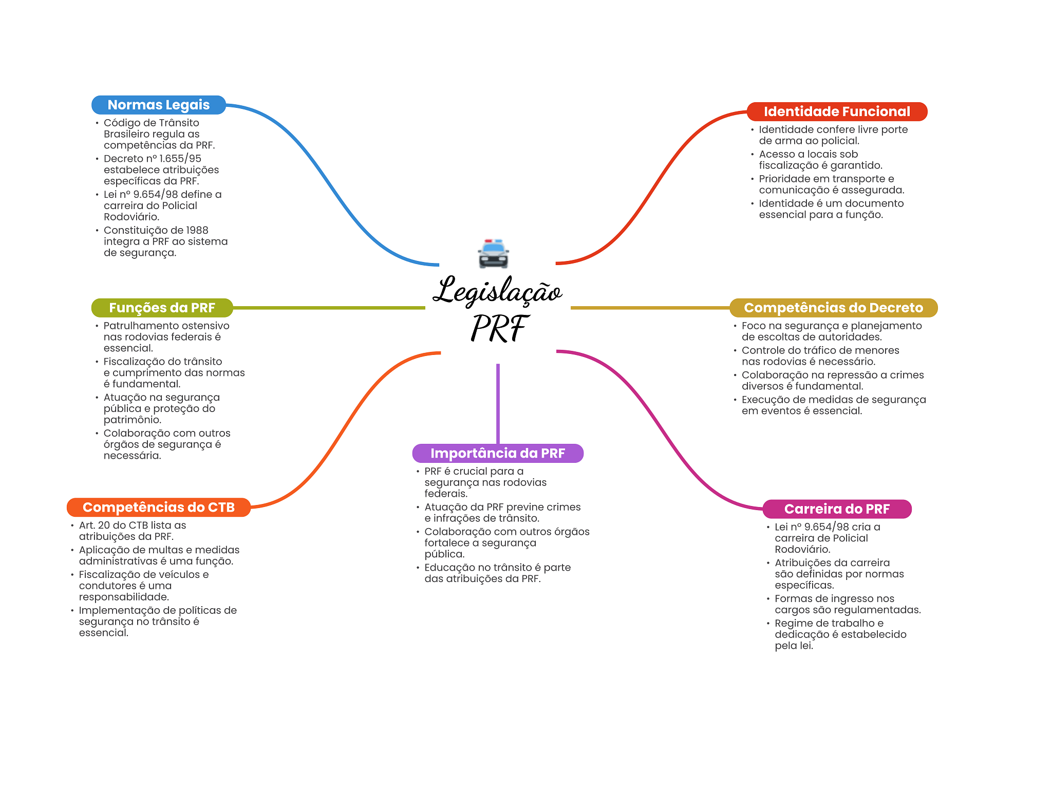Normas Legais Identidade Funcional Código de Trânsito Brasileiro regula as Identidade confere livre porte competências da PRF. de arma ao policial. Decreto n° 1.655/95 Acesso a locais sob estabelece atribuições fiscalização é garantido. específicas da PRF. Prioridade em transporte e Lei n° 9.654/98 define a comunicação é assegurada. carreira do Policial Identidade é um documento Rodoviário. essencial para a função. de 1988 integra a PRF ao sistema de segurança. Legislação Funções da PRF Competências do Decreto Patrulhamento ostensivo PRF Foco na segurança e planejamento nas rodovias federais é de escoltas de autoridades. essencial. Controle do tráfico de menores Fiscalização do trânsito nas rodovias é necessário. e cumprimento das normas Colaboração na repressão a crimes é fundamental. diversos é fundamental. Atuação na segurança Execução de medidas de segurança pública e proteção do em eventos é essencial. patrimônio. Colaboração com outros órgãos de segurança é necessária. Importância da PRF PRF é crucial para a segurança nas rodovias federais. Competências do CTB Atuação da PRF previne crimes Carreira do PRF e infrações de trânsito. Art. 20 do CTB lista as atribuições da PRF. Colaboração com outros órgãos Lei n° 9.654/98 cria a carreira de Policial fortalece a segurança Aplicação de multas e medidas Rodoviário. pública. administrativas é uma função. Educação no trânsito é parte Atribuições da carreira Fiscalização de veículos e das atribuições da PRF. são definidas por normas condutores é uma específicas. responsabilidade. Formas de ingresso nos Implementação de políticas de cargos são regulamentadas. segurança no trânsito é Regime de trabalho e essencial. dedicação é estabelecido pela lei.