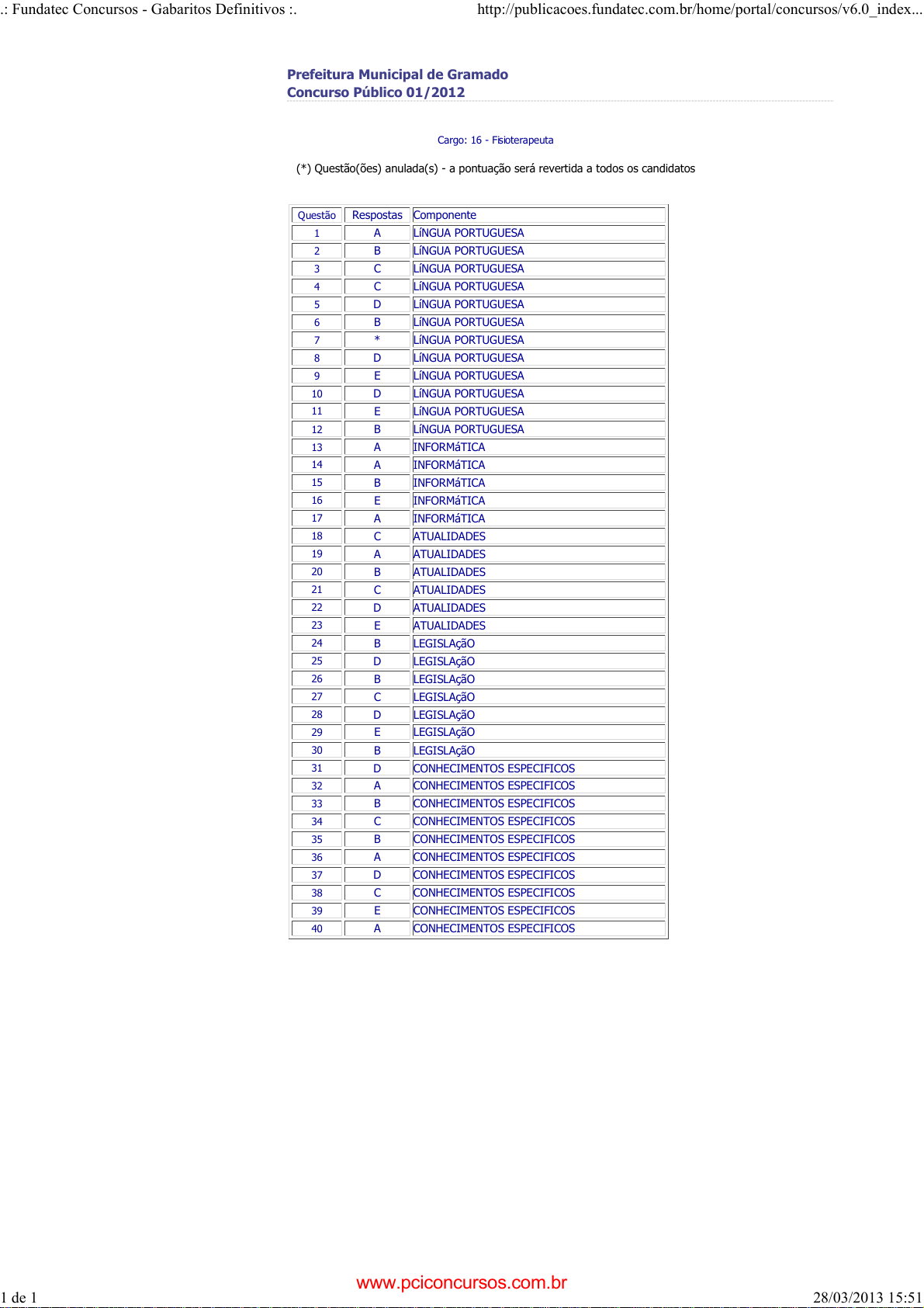 pcimarkpci MjgwNDoxMDhjOmQwZGU6ZjAwMDowOTI3OmQ2YjE6MDFiNjplODlh:VHVlLCAxNiBKYW4gMjAyNCAyMTozMjo0MCAtMDMwMA== www.pciconcursos.com.br Prefeitura Municipal de Gramado Concurso Público 01/2012 Cargo: 16 - Fisioterapeuta (*) Questão(ões) anulada(s) - a pontuação será revertida a todos os candidatos Questão Respostas Componente 1 A LíNGUA PORTUGUESA 2 B LíNGUA PORTUGUESA 3 C LíNGUA PORTUGUESA 4 C LíNGUA PORTUGUESA 5 D LíNGUA PORTUGUESA 6 B LíNGUA PORTUGUESA 7 * LíNGUA PORTUGUESA 8 D LíNGUA PORTUGUESA 9 E LíNGUA PORTUGUESA 10 D LíNGUA PORTUGUESA 11 E LíNGUA PORTUGUESA 12 B LíNGUA PORTUGUESA 13 A INFORMáTICA 14 A INFORMáTICA 15 B INFORMáTICA 16 E INFORMáTICA 17 A INFORMáTICA 18 C ATUALIDADES 19 A ATUALIDADES 20 B ATUALIDADES 21 C ATUALIDADES 22 D ATUALIDADES 23 E ATUALIDADES 24 B LEGISLAçãO 25 D LEGISLAçãO 26 B LEGISLAçãO 27 C LEGISLAçãO 28 D LEGISLAçãO 29 E LEGISLAçãO 30 B LEGISLAçãO 31 D CONHECIMENTOS ESPECIFICOS 32 A CONHECIMENTOS ESPECIFICOS 33 B CONHECIMENTOS ESPECIFICOS 34 C CONHECIMENTOS ESPECIFICOS 35 B CONHECIMENTOS ESPECIFICOS 36 A CONHECIMENTOS ESPECIFICOS 37 D CONHECIMENTOS ESPECIFICOS 38 C CONHECIMENTOS ESPECIFICOS 39 E CONHECIMENTOS ESPECIFICOS 40 A CONHECIMENTOS ESPECIFICOS .: Fundatec Concursos - Gabaritos Definitivos :. http://publicacoes.fundatec.com.br/home/portal/concursos/v6.0_index... 1 de 1 28/03/2013 15:51 www.pciconcursos.com.br