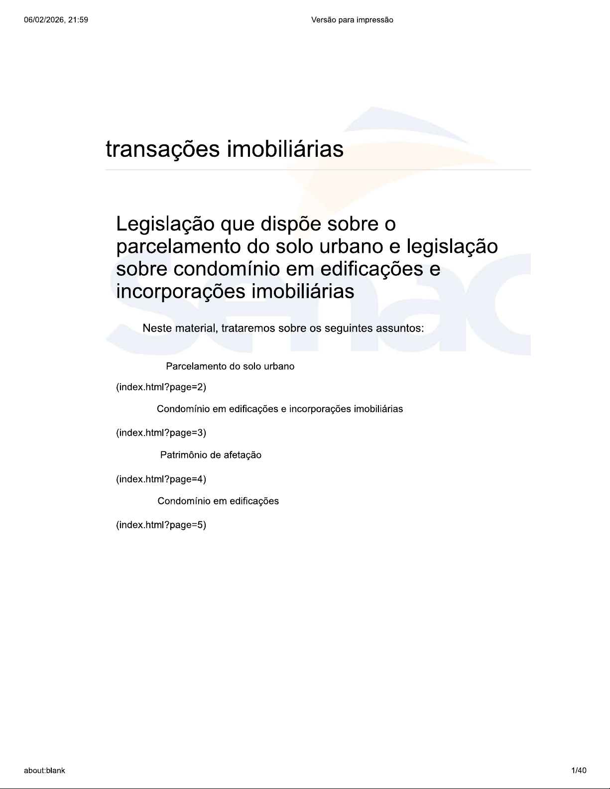 06/02/2026, 21:59 Versão para impressão transações imobiliárias Legislação que dispõe sobre parcelamento do solo urbano e legislação sobre condomínio em edificações e incorporações imobiliárias Neste material, trataremos sobre os seguintes assuntos: Parcelamento do solo urbano (index.html?page=2) Condomínio em edificações e incorporações imobiliárias (index.html?page=3) Patrimônio de afetação (index.html?page=4) Condomínio em edificações (index.html?page=5) about:blank 1/4006/02/2026, 21:59 Versão para impressão Parcelamento do solo urbano O parcelamento do solo urbano é um tema interessante. Trata-se de algo que poderá ser muito lucrativo para o corretor de imóveis. O assunto é tratado pela Constituição Federal de 1988 (está presente no inciso VIII do artigo 30) e pela Lei 6.766, de 19 de dezembro de 1979 (Lei de Parcelamento do Solo Urbano). objetivo primordial é regrar a maneira como se divide solo urbano. Assista a esta videoaula e veja os principais elementos relacionados ao tema e como são verificados na prática do mercado imobiliário. Recurso É importante que corretor de imóveis entenda que, quando pensa em vender áreas grandes para loteamentos, está pensando em viabilizar algo para um futuro parcelamento de solo. O parcelamento de solo está inserido na vida do corretor de imóveis por ser um modo de venda de imóveis rentável e interessante. A Lei de Parcelamento de Solo foi criada em 1979, por meio da Lei n° 6.766, conforme apresenta vídeo. Recurso A criação da Lei 6.766 apoiou o crescimento organizado das cidades brasileiras, ajudando a proteger o comprador de terrenos urbanos. Ela trata de várias questões, estabelecendo as principais regras sobre diretrizes urbanísticas e about:blank 2/4006/02/2026, 21:59 Versão para impressão procedimentos administrativos e registrários. Ela ainda dispõe sobre os direitos e as garantias asseguradas aos adquirentes dos lotes. Vejamos então aquilo que trazem esses textos legais. A Constituição Federal traz em seu texto legal o seguinte: Art. 30. Compete aos Municípios: (...) VIII promover, no que couber, adequado ordenamento territorial, mediante planejamento e controle do uso, do parcelamento e da ocupação do solo urbano; (...) Já a Lei 6.766/79 traz inicialmente as seguintes definições: Art. parcelamento do solo para fins urbanos será regido por esta Lei. Parágrafo único Os Estados, o Distrito Federal e os Municípios poderão estabelecer normas complementares relativas ao parcelamento do solo municipal para adequar previsto nesta Lei às peculiaridades regionais e locais. about:blank 3/4006/02/2026, 21:59 Versão para impressão O parcelamento de solo, portanto, é um ato sobre o qual as determinações municipais têm imenso peso. Cada município do país, por meio de seu plano diretor (criado em sintonia absoluta com Estatuto da Cidade), complementará e regrará pontualmente parcelamento de solo, adequando-o à realidade e às peculiaridades de sua região. Sabendo disso, os corretores de imóveis deverão conhecer a situação específica das áreas onde costumam atuar e onde vislumbram possibilidades de negócios. A Lei 6.766/79 ainda dispõe seguinte: Art. 2.° O parcelamento do solo urbano poderá ser feito mediante loteamento ou desmembramento, observadas as disposições desta Lei e as das legislações estaduais e municipais pertinentes. Considera-se loteamento a subdivisão de gleba em lotes destinados a edificação, com abertura de novas vias de circulação, de logradouros públicos ou prolongamento, modificação ou ampliação das vias existentes. Considera-se desmembramento a subdivisão de gleba em lotes destinados a edificação, com aproveitamento do sistema about:blank 4/4006/02/2026, 21:59 Versão para impressão viário existente, desde que não implique a abertura de novas vias e logradouros públicos, nem prolongamento, modificação ou amplificação dos já existentes. (...) Considera-se lote terreno servido de infraestrutura básica cujas dimensões atendam aos índices urbanísticos definidos pelo plano diretor ou lei municipal para a zona em que se situe. que são loteamentos e Inicialmente, é preciso esclarecer que loteamentos e desmembramentos são modalidades de parcelamento de solo. que é um loteamento? O loteamento será a subdivisão da gleba em lotes destinados à edificação, com abertura de novas vias de circulação e de logradouros públicos ou com prolongamento, modificação ou ampliação das vias existente. A fim de assimilar conteúdo visto até aqui, veja um breve relato sobre loteamento assistindo ao vídeo. Recurso about:blank 5/4006/02/2026, 21:59 Versão para impressão Para bem entendermos conceito de loteamento, é importante então sabermos que são glebas e lotes. Clique ou toque sobre os títulos para expandir seus conteúdos. about:blank 6/4006/02/2026, 21:59 Versão para impressão Gleba É a terra crua, sem qualquer regulamentação ou adequação às leis brasileiras e regionais. Trata-se de uma área de terreno que ainda não foi objeto de loteamento ou desmembramento regular. Após registro do parcelamento, o imóvel deixa de existir juridicamente como gleba e passa a existir como coisa loteada ou desmembrada, composta de lotes e áreas públicas. Scavone Junior assim a define: Gleba é a porção de terra que não tenha sido submetida a parcelamento sob a égide da Lei n° 6.766/79, que equivale dizer que estaremos diante de uma gleba se a porção de terra jamais foi loteada ou desmembrada sob a vigência da nova lei. Gleba A 28 ha Gleba 22 ha about:blank 7/4006/02/2026, 21:59 Versão para impressão Figura 1 - Gleba dividida Fonte: about:blank 8/4006/02/2026, 21:59 Versão para impressão Lote Temos por lote um terreno com infraestrutura básica e cujas dimensões atendam aos índices urbanísticos definidos pelo plano diretor ou pela lei municipal para a zona em que se localiza. Assim, para um terreno ser