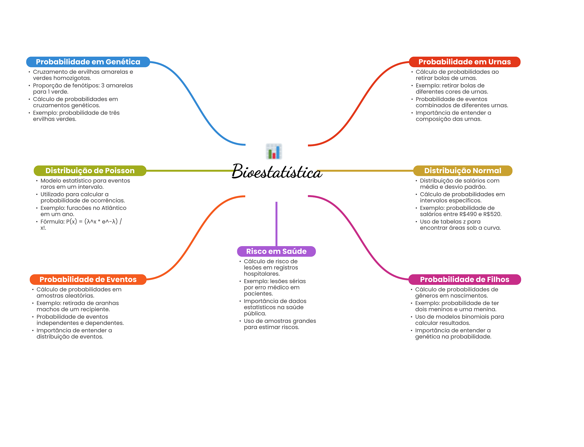Probabilidade em Genética Probabilidade em Urnas Cruzamento de ervilhas amarelas e Cálculo de probabilidades ao verdes homozigotas. retirar bolas de urnas. Proporção de fenótipos: 3 amarelas Exemplo: retirar bolas de para 1 verde. diferentes cores de urnas. Cálculo de probabilidades em Probabilidade de eventos cruzamentos genéticos. combinados de diferentes urnas. Exemplo: probabilidade de três Importância de entender a ervilhas verdes. composição das urnas. Distribuição de Poisson Bioestatística Distribuição Normal Modelo estatístico para eventos Distribuição de salários com raros em um intervalo. média e desvio padrão. Utilizado para calcular a Cálculo de probabilidades em probabilidade de ocorrências. intervalos específicos. Exemplo: furações no Atlântico Exemplo: probabilidade de em um ano. entre R$490 e R$520. Fórmula: P(x) = * / Uso de tabelas Z para encontrar áreas sob a curva. Risco em Saúde Cálculo de risco de lesões em registros hospitalares. Probabilidade de Eventos Exemplo: lesões sérias Probabilidade de Filhos Cálculo de probabilidades em por erro médico em Cálculo de probabilidades de amostras aleatórias. pacientes. gêneros em nascimentos. Exemplo: retirada de aranhas Importância de dados Exemplo: probabilidade de ter machos de um recipiente. estatísticos na saúde dois meninos e uma menina. Probabilidade de eventos pública. Uso de modelos binomiais para independentes e dependentes. Uso de amostras grandes calcular resultados. Importância de entender a para estimar riscos. Importância de entender a distribuição de eventos. genética na probabilidade.