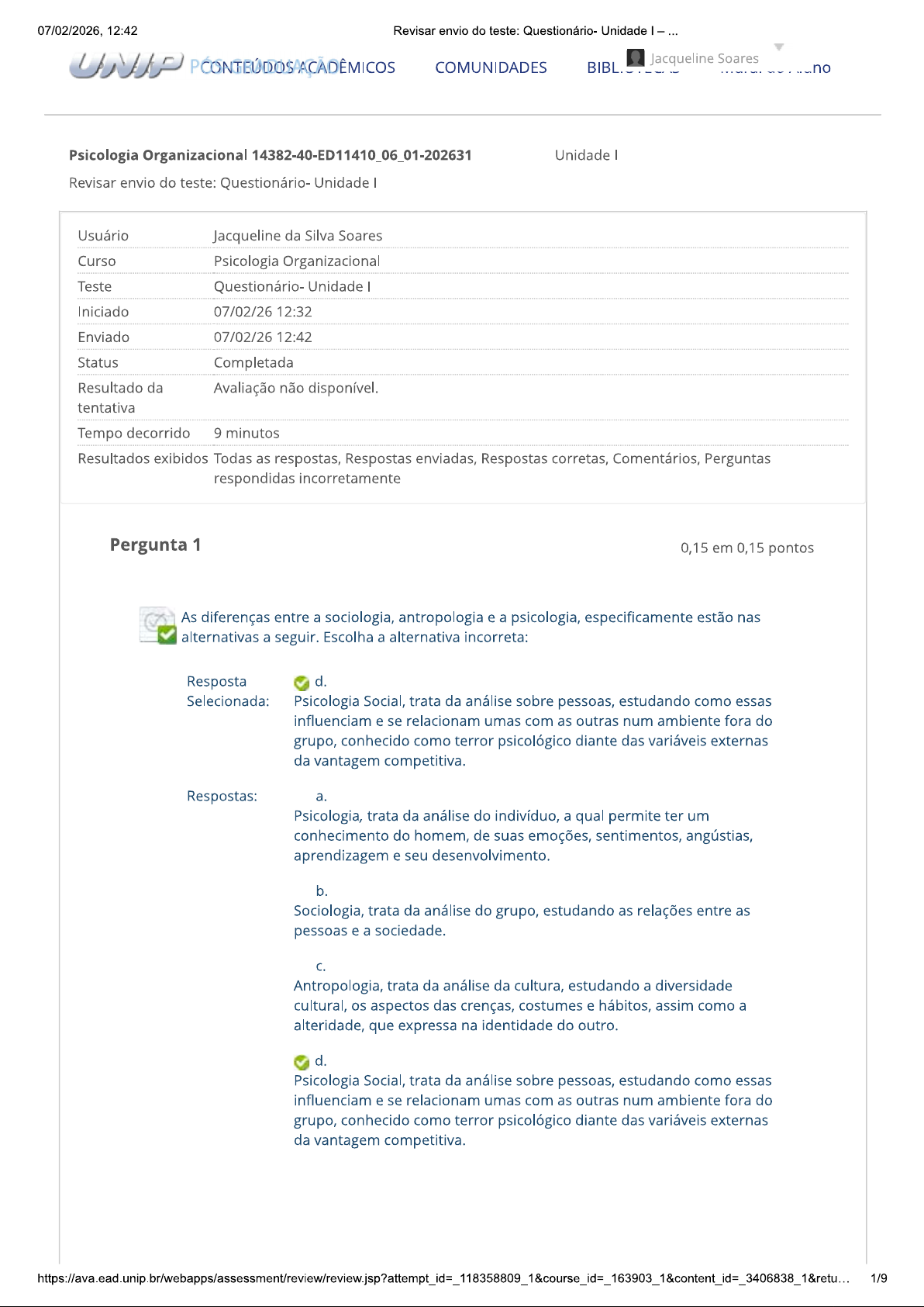 07/02/2026, 12:42 Revisar envio do teste: Questionário- Unidade UNIP Jacqueline Soares COMUNIDADES BIBL. no Psicologia Organizacional 14382-40-ED11410_06_01-202631 Unidade Revisar envio do teste: Questionário- Unidade Usuário Jacqueline da Silva Soares Curso Psicologia Organizacional Teste Questionário- Unidade Iniciado 07/02/26 12:32 Enviado 07/02/26 12:42 Status Completada Resultado da Avaliação não disponível. tentativa Tempo decorrido 9 minutos Resultados exibidos Todas as respostas, Respostas enviadas, Respostas corretas, Comentários, Perguntas respondidas incorretamente Pergunta 1 0,15 em 0,15 pontos As diferenças entre a sociologia, antropologia e a psicologia, especificamente estão nas alternativas a seguir. Escolha a alternativa incorreta: Resposta d. Selecionada: Psicologia Social, trata da análise sobre pessoas, estudando como essas influenciam e se relacionam umas com as outras num ambiente fora do grupo, conhecido como terror psicológico diante das variáveis externas da vantagem competitiva. Respostas: a. Psicologia, trata da análise do indivíduo, a qual permite ter um conhecimento do homem, de suas emoções, sentimentos, angústias, aprendizagem e seu desenvolvimento. b. Sociologia, trata da análise do grupo, estudando as relações entre as pessoas e a sociedade. Antropologia, trata da análise da cultura, estudando a diversidade cultural, os aspectos das crenças, costumes e hábitos, assim como a alteridade, que expressa na identidade do outro. d. Psicologia Social, trata da análise sobre pessoas, estudando como essas influenciam e se relacionam umas com as outras num ambiente fora do grupo, conhecido como terror psicológico diante das variáveis externas da vantagem competitiva. 1/907/02/2026, 12:42 Revisar envio do teste: Questionário- Unidade e. Psicologia Organizacional, trata da análise dos problemas relacionados com a gestão de recursos humanos ou gestão de pessoas dentro de uma empresa. Para isso procura compreender como os funcionários atuam em ambientes coletivos e analisando as consequências de uma determinada atitude dentro do ambiente de trabalho. Pergunta 2 0,15 em 0,15 pontos Lacombe (2008) analisa como uma era de grande impacto ao homem, diante da revolução do computador, que passa a substituir ser humano em termos físicos e intelectuais tem seu principal foco na alternativa : Resposta d. Selecionada: Ao estudar qualquer fenômeno social, acreditamos ser relevante registrar nesse contexto aparecimento da Psicologia Organizacional, como destaque ao processo de transformação que, com certeza, tem implicações na relevância comportamental Respostas: a. Inteligência: a capacidade de um indivíduo para diferentes funções, como a lógica, abstração, memorização, comunicação, aprendizado e outros. b. Personalidade: como as particularidades humanas influenciam o comportamento de um indivíduo ou grupo social. Comportamento: como as funções mentais interferem no comportamento dos indivíduos e grupos sociais. Relacionamentos interpessoais: como as pessoas se comunicam, que garante o sucesso ou fracasso dos processos comunicativos. Resiliência: a capacidade de um indivíduo lidar com problemas, adaptar- se a mudanças ou resistir à pressão e situações adversas em relação a outras pessoas fora de seu ambiente de trabalho. d. Ao estudar qualquer fenômeno social, acreditamos ser relevante registrar nesse contexto aparecimento da Psicologia Organizacional, como destaque ao processo de transformação que, com certeza, tem implicações na relevância comportamental e. Resiliência: a capacidade de um indivíduo lidar com problemas, adaptar- se a mudanças ou resistir à pressão e situações adversas Pergunta 3 0,15 em 0,15 pontos 2/907/02/2026, 12:42 Revisar envio do teste: Questionário- Unidade "...Psicologia do Trabalho ou industrial, para alguns autores tem mesmo significado da Psicologia Organizacional, todavia, recebe maior relevância ao estudar o homem em seu ambiente laboral, garantindo a sua saúde física e mental e a segurança no trabalho, independentemente se é ou não em um ambiente empresarial..." (Disponível em https://w tua). É incorreto afirmar que: Resposta e. Selecionada: A Psicologia Social, estuda comportamento de indivíduos e como ele é influenciado socialmente, consequentemente, analisando os aspectos da personalidade individual Respostas: a. Entre 1920 e 1970, durante a fase industrial, foco no aumento dos lucros e, para tal, a busca de talentos envolviam testes psicológicos que qualificavam e direcionavam os funcionários para suas melhores áreas de atuação. b. Entre 1970 e 1990) surge a abordagem organizacional, cuja qualidade de vida do trabalhador se torna importante, principalmente quando resultado é rendimento profissionais e, consequentemente, maior lucro. De 1990, surge uma nova abordagem desta teoria, abordagem conhecida como a psicologia organizacional, cujo foco é resumo do que foi aplicado e criado desde 1920 no mercado trabalhista, com mais ênfase no comportamento psicobiológico da pessoa d. Hoje se dá muito valor a saúde do trabalhador, seja a mental como física, passando a exigir do profissional que atua nessa área identificar possíveis falhas comportamentais, utilizando de ferramentas de certa forma diversificadas no acompanhamento da organização e seus colaboradores, e. A Psicologia Social, estuda comportamento de indivíduos e como ele é influenciado socialmente, consequentemente, analisando os aspectos da personalidade individual Pergunta 4 0,15 em 0,15 pontos Com a invenção da máquina a vapor por James Watt (1776) provocou mudanças políticas, sociais, e econômicas, desse modo trabalho artesanal é substituído pelas máquinas, dando produção e melhor qualidade do produto, diminuindo custo da mão de obra, embora barata, mas com interesse de diminuir as reivindicações dos trabalhadores em melhores condições de vida no ambiente de trabalho. 