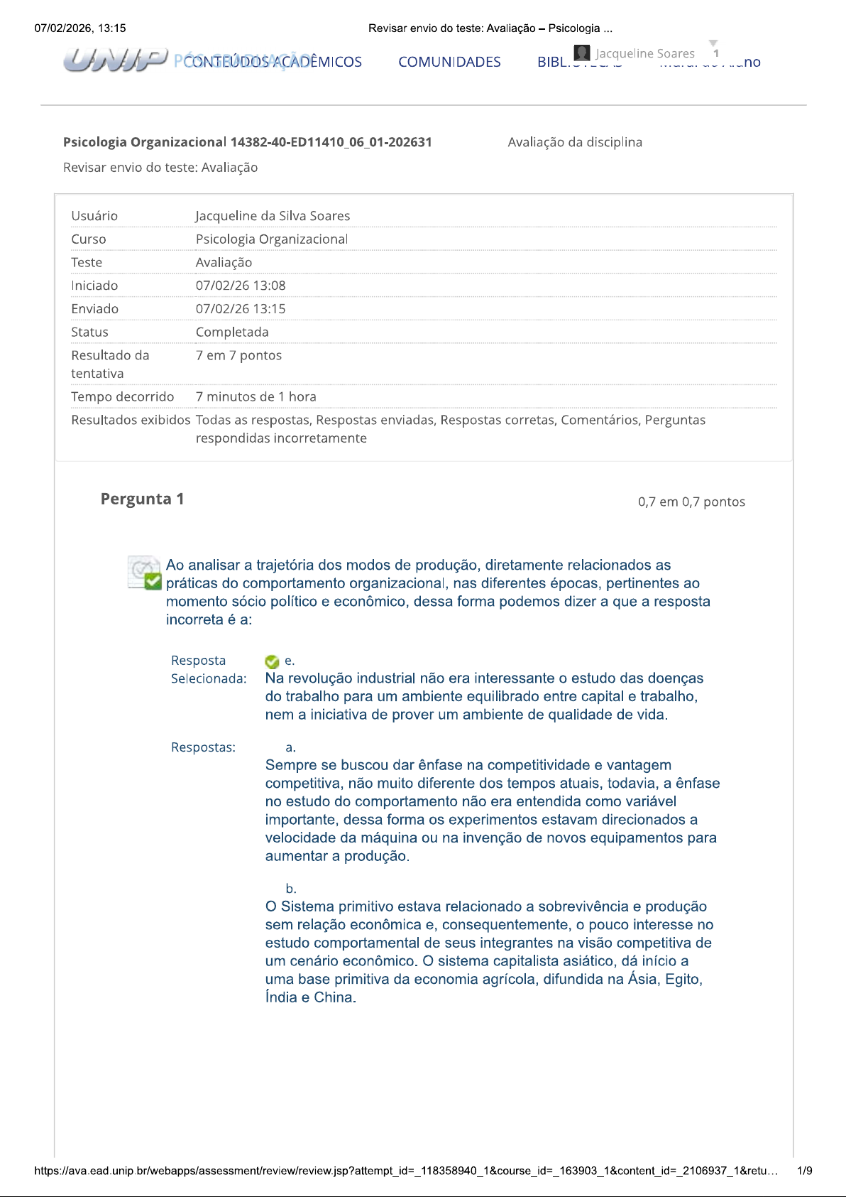07/02/2026, 13:15 Revisar envio do teste: Avaliação Psicologia UNIP Jacqueline Soares COMUNIDADES BIBL. no Psicologia Organizacional 14382-40-ED11410_06_01-202631 Avaliação da disciplina Revisar envio do teste: Avaliação Usuário Jacqueline da Silva Soares Curso Psicologia Organizacional Teste Avaliação Iniciado 07/02/26 13:08 Enviado 07/02/26 13:15 Status Completada Resultado da 7 em 7 pontos tentativa Tempo decorrido 7 minutos de 1 hora Resultados exibidos Todas as respostas, Respostas enviadas, Respostas corretas, Comentários, Perguntas respondidas incorretamente Pergunta 1 0,7 em 0,7 pontos Ao analisar a trajetória dos modos de produção, diretamente relacionados as práticas do comportamento organizacional, nas diferentes épocas, pertinentes ao momento sócio político e econômico, dessa forma podemos dizer a que a resposta incorreta é a: Resposta e. Selecionada: Na revolução industrial não era interessante estudo das doenças do trabalho para um ambiente equilibrado entre capital e trabalho, nem a iniciativa de prover um ambiente de qualidade de vida. Respostas: a. Sempre se buscou dar ênfase na competitividade e vantagem competitiva, não muito diferente dos tempos atuais, todavia, a ênfase no estudo do comportamento não era entendida como variável importante, dessa forma os experimentos estavam direcionados a velocidade da máquina ou na invenção de novos equipamentos para aumentar a produção. b. Sistema primitivo estava relacionado a sobrevivência e produção sem relação econômica e, consequentemente, pouco interesse no estudo comportamental de seus integrantes na visão competitiva de um cenário econômico. sistema capitalista asiático, dá início a uma base primitiva da economia agrícola, difundida na Ásia, Egito, Índia e China. 1/907/02/2026, 13:15 Revisar envio do teste: Avaliação Psicologia Com Sistema escravista, cujos escravos eram considerados moeda de transação de poder e quanto maior a sua posse era sinônimo de status e poder, os indícios das necessidades da presença de uma política social e pública começa a surgir. Os escravos após seu envelhecimento eram descartados da mão de obra ativa e, sem onde ir, buscavam a sobrevivência nas cidades, aumentando as doenças e pestes recorrentes da qualidade de vida. d. Sistema Feudal, condição dessa trajetória econômica produtiva, inicia uma política precária das relações humana, quando se estabelece a organização social e política entre servo e senhor. Lembrando aqui a forte diferença entre servo e escravo, sendo primeiro primeiro com características de direitos mínimos no sistema de troca da sua produção individual e o escravo, obviamente, sem quaisquer direitos. e. Na revolução industrial não era interessante estudo das doenças do trabalho para um ambiente equilibrado entre capital e trabalho, nem a iniciativa de prover um ambiente de qualidade de vida. Comentário da resposta: p. 15, mód. 01. Pergunta 2 0,7 em 0,7 pontos Algumas das principais características a respeito do processo histórico de evolução da administração organizacional, através das intervenções do cenário sociopolítico e econômico da época, encontramos nas alternativas a seguir, porém uma delas é incorreta. Qual é esta alternativa? Resposta Selecionada: Foco nas organizações sistemas abertos, sem foco nos insumos, transformações e produtos (1980 1990). Respostas: a. Na idade Média a Reforma Protestante de Martinho Lutero: reforma religiosa; insatisfação com as atitudes, propriedade. Poder da Igreja Católica (Sofrimento humano para chegar ao céu). Escrita deixa de ser exclusividade do clero (Primeiras universidades: medicina; direito e teologia). b. Idade Pós Moderna com neoliberalismo, queda do muro de Berlin, aumento da força capitalista mais crise ideológica e Globalização. Foco nas organizações sistemas abertos, sem foco nos insumos, transformações e produtos (1980 1990). 2/907/02/2026, 13:15 Revisar envio do teste: Avaliação Psicologia d. Revolução Industrial (Mudanças Econômicas); início do capitalismo; máquinas a vapor; divisão de Estado; burguesia e proletários; ênfase no conhecimento. e. Século 17 (Renascimento: Movimento Humanista); base da sociedade: progresso (Produção material + divisão de trabalho + propriedade); transição do Feudalismo, para Capitalismo; fortalecimento do comércio (Burguesia); Contestação do poder da Igreja. Comentário da resposta: p. 14, mod 1 Pergunta 3 0,7 em 0,7 pontos Apoiados nas análises dos autores, Wagner & Hollenbeck (2002) e Lacombe (2008), nos deixa como referencial, algumas das principais características a respeito do processo histórico de evolução da administração organizacional, através das intervenções do cenário sociopolítico e econômico de cada época, que com certeza dão origem ao desenvolvimento da psicologia organizacional que, como pudemos avaliar, quanto os processos de mudanças e transformações, implicam na relação colaborador e organização e os efeitos produtivos. Diante das análises feitas por esses autores, qual alternativa abaixo está incorreta: Resposta d. Selecionada: Os processos de mudanças e transformações, não implicam na relação colaborador e organização e os efeitos produtivos, quando envolve a presença politica do sindicato para neutralizar os conflitos trabalhistas. Respostas: a. Ao estudar qualquer fenômeno social, acreditamos ser relevante registrar nesse contexto aparecimento da Psicologia Organizacional, como destaque ao processo de transformação. b. Com certeza, tem implicações na relevância comportamental a qual nos arriscamos a pensar que é afetado pela economia. C. A política com referencial de analisar comportamento da sociedade, implica na Ética para atingimento dos resultados e metas a serem atingidas numa organização. d. Os processos de mudanças e transformações, não implicam na relação colaborador e organiza