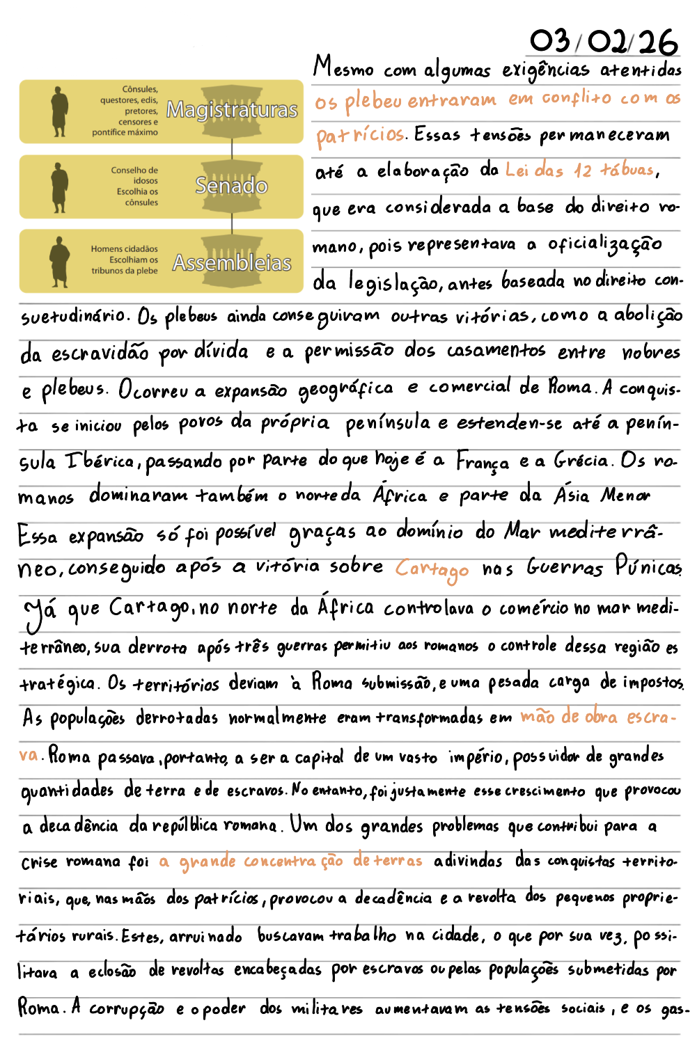 03/02/26 Mesmo com algumas exigências atentidas Cônsules, questores, edis, pretores, Magistraturas plebeu entraram em com censores e máximo patrícios. Essas tensões permaneceram Conselho de idosos Senado até a elaboração da Lei das 12 tábuas, Escolhia os cônsules que era considerada a base do direito vo- Homens cidadãos mano, pois representava a oficialização Escolhiam os Assembleias tribunos da plebe da legislação, antes baseada no direito con- suetudinário. Os plebeus ainda conse outras vitórias, como a abolição da escravidão por dívida e a permissão dos casamentos entre nobres e plebeus. Ocorreu a expansão geográfica e comercial de Roma. A conquis- se iniciou pelos poros da própria península e estenden-se até a penín- sula Ibérica, passando por parte do que hoje é a França e a Grécia. Os manos dominaram também norteda Africa e parte da Ásia Menor Essa expansão só foi possível graças ao domínio do Mar medite neo, conseguido após a vitória sobre Cartago has Guerras Púnicas que Cartago, norte da Africa controlava comércio no mar medi- terrâneo, sua derrota após três guerras permitiv aos romanos controle dessa região es tratégica. Os territórios deviam à Roma submissão, e uma pesada carga de As populações derrotadas normalmente eram transformadas em mão de obra escra- va. Roma passava portanto, a ser a capital de vasto império, de grandes quantidades de terra e de escravos. No entanto, foijustamente esse crescimento que provocou a deca dência da romana. Um dos grandes problemas que contribui para a romana foi a grande concentra ção deterras adivindas das conquistas territo- riais, que, mãos dos patrícios, provocou a decadência e a revolta dos pequenos proprie- tários rurais. Estes, arruinado buscavam trabal lho na cidade, 0 que por sua ssi- litava a eclosão de encabeçadas por escravos ou pelas populações submetidas por Roma. A corrupção e poder dos militares aumentavam as tensões sociais, e gas-