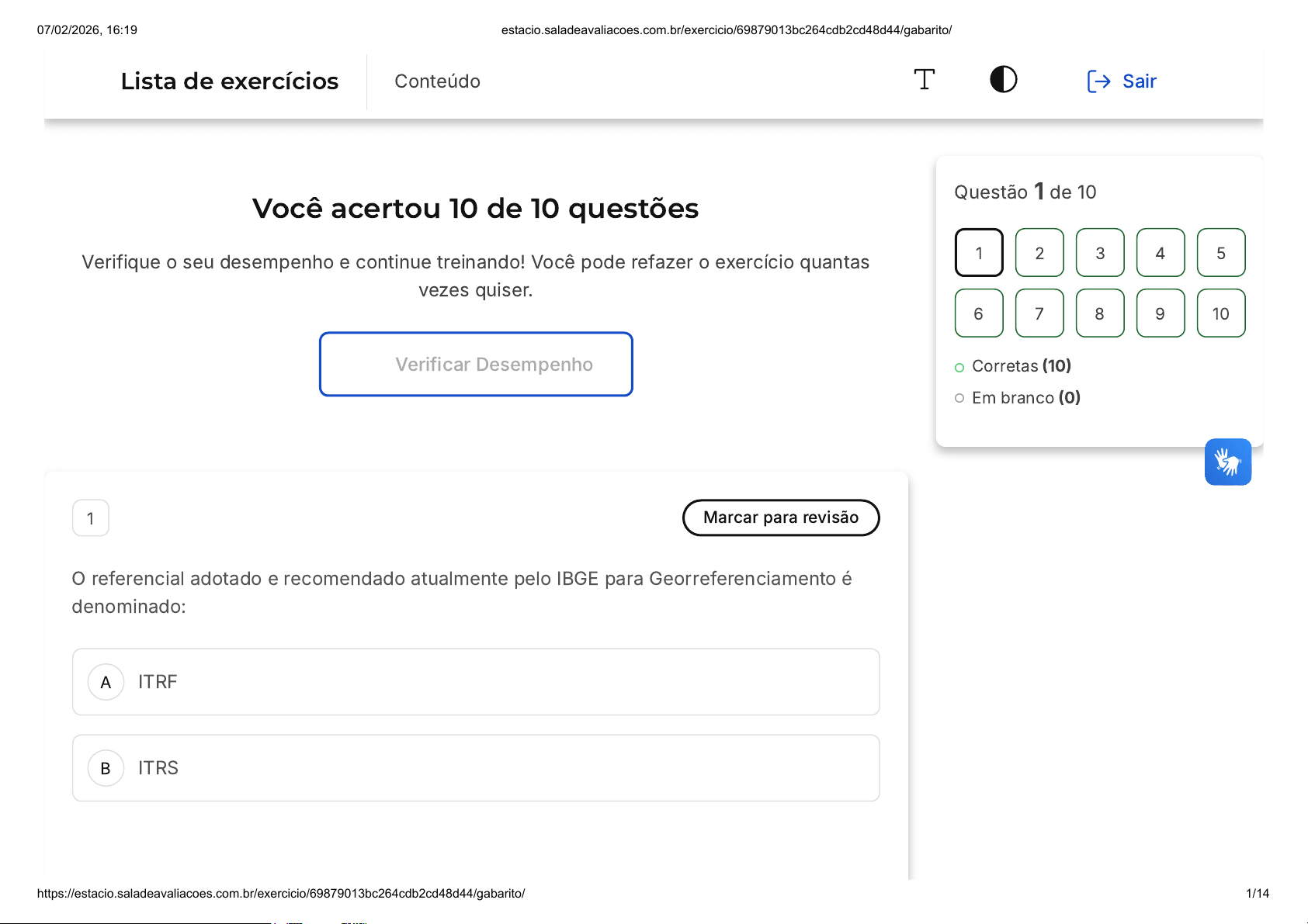 Você acertou 10 de 10 questões Verifique o seu desempenho e continue treinando! Você pode refazer o exercício quantas vezes quiser. Verificar Desempenho A B 1 Marcar para revisão O referencial adotado e recomendado atualmente pelo IBGE para Georreferenciamento é denominado: ITRF ITRS Questão 1 de 10 Corretas (10) Em branco (0) 1 2 3 4 5 6 7 8 9 10 Lista de exercícios Conteúdo Sair 07/02/2026, 16:19 estacio.saladeavaliacoes.com.br/exercicio/69879013bc264cdb2cd48d44/gabarito/ https://estacio.saladeavaliacoes.com.br/exercicio/69879013bc264cdb2cd48d44/gabarito/ 1/14 C D E SAD SIRGAS2000 Córrego Alegre Resposta correta Parabéns, você selecionou a alternativa correta. Confira o gabarito comentado! Gabarito Comentado O Sistema de Referência Geocêntrico para as Américas (SIRGAS2000) é o referencial adotado e recomendado atualmente pelo Instituto Brasileiro de Geografia e Estatística (IBGE) para Georreferenciamento. Este sistema é utilizado para a definição de coordenadas geodésicas e geocêntricas, sendo fundamental para a precisão em trabalhos de mapeamento e localização. 2 Marcar para revisão A projeção equidistante preserva a seguinte característica: 07/02/2026, 16:19 estacio.saladeavaliacoes.com.br/exercicio/69879013bc264cdb2cd48d44/gabarito/ https://estacio.saladeavaliacoes.com.br/exercicio/69879013bc264cdb2cd48d44/gabarito/ 2/14 A B C D E Comprimento Forma Área Distância Volume Resposta correta Parabéns, você selecionou a alternativa correta. Confira o gabarito comentado! Gabarito Comentado A projeção equidistante é um tipo de projeção cartográfica que mantém as distâncias entre os pontos no mapa. Isso significa que a distância entre dois pontos no mapa é proporcional à distância real entre esses pontos na superfície da Terra. Portanto, a característica preservada na projeção equidistante é a distância. 07/02/2026, 16:19 estacio.saladeavaliacoes.com.br/exercicio/69879013bc264cdb2cd48d44/gabarito/ https://estacio.saladeavaliacoes.com.br/exercicio/69879013bc264cdb2cd48d44/gabarito/ 3/14 A B C D E 3 Marcar para revisão As superfícies utilizadas na Geodésia são conhecidas como: Topocêntrica, Plana e Horizontal Geocêntrica, Direta e Vertical Física, Geoidal e Elipsoidal Global, Topocêntrica e Plana Geoidal, Plana e Circunferência Resposta correta Parabéns, você selecionou a alternativa correta. Confira o gabarito comentado! Gabarito Comentado Na Geodésia, as superfícies utilizadas são conhecidas como Física, Geoidal e Elipsoidal. A superfície física é a superfície real da Terra, com todas as suas irregularidades. A superfície geoidal é uma superfície equipotencial do campo de 07/02/2026, 16:19 estacio.saladeavaliacoes.com.br/exercicio/69879013bc264cdb2cd48d44/gabarito/ https://estacio.saladeavaliacoes.com.br/exercicio/69879013bc264cdb2cd48d44/gabarito/ 4/14 A B C D E gravidade da Terra que melhor se aproxima do nível médio do mar. Já a superfície elipsoidal é uma simplificação da superfície geoidal, representada por um elipsoide de revolução. Portanto, a alternativa correta é a C: Física, Geoidal e Elipsoidal. 4 Marcar para revisão O SGR associado ao GPS é denominado: WGS84 SIRGAS2000 Córrego Alegre SAD69-96 GRS80 07/02/2026, 16:19 estacio.saladeavaliacoes.com.br/exercicio/69879013bc264cdb2cd48d44/gabarito/ https://estacio.saladeavaliacoes.com.br/exercicio/69879013bc264cdb2cd48d44/gabarito/ 5/14 A B C Resposta correta Parabéns, você selecionou a alternativa correta. Confira o gabarito comentado! Gabarito Comentado O Sistema Geodésico de Referência (SGR) associado ao Sistema de Posicionamento Global (GPS) é denominado WGS84. Este é um sistema de coordenadas geográficas mundial que permite localizar qualquer ponto na Terra, sendo amplamente utilizado em aplicações de GPS. Portanto, a alternativa correta é a "A", que indica o WGS84. 5 Marcar para revisão Os tipos de orientação das fotos na fotogrametria são denominados de: Estereoscópica e Tridimensional Vetorial e Matricial Interior e Exterior 07/02/2026, 16:19 estacio.saladeavaliacoes.com.br/exercicio/69879013bc264cdb2cd48d44/gabarito/ https://estacio.saladeavaliacoes.com.br/exercicio/69879013bc264cdb2cd48d44/gabarito/ 6/14 D E SIFT e Digital MDT e Ortoimagens Resposta correta Parabéns, você selecionou a alternativa correta. Confira o gabarito comentado! Gabarito Comentado Na fotogrametria, a orientação das fotos é classificada como Interior e Exterior. A orientação interior refere-se à posição relativa entre a câmera e o objeto fotografado no momento da captura da imagem. Já a orientação exterior está relacionada à posição e orientação da câmera em relação a um sistema de coordenadas global. Portanto, a alternativa correta é a "C", que menciona esses dois tipos de orientação. 6 Marcar para revisão A materialização do Geoide se dá através dos seguintes instrumentos: 07/02/2026, 16:19 estacio.saladeavaliacoes.com.br/exercicio/69879013bc264cdb2cd48d44/gabarito/ https://estacio.saladeavaliacoes.com.br/exercicio/69879013bc264cdb2cd48d44/gabarito/ 7/14 A B C D E GNSS e Topografia Cartografia e GNSS Marégrafos e medidas na superfície Método Clássico e Moderno Geodésia e Cartografia Resposta correta Parabéns, você selecionou a alternativa correta. Confira o gabarito comentado! Gabarito Comentado O Geoide é uma representação do formato da Terra que considera a gravidade e a rotação do planeta. Para materializar o Geoide, ou seja, para torná-lo uma representação física e mensurável, são utilizados instrumentos como os marégrafos, que medem o nível do mar, e medidas na superfície da Terra. Portanto, a alternativa correta é a "C: Marégrafos e medidas na superfície". 07/02/2026, 16:19 estacio.saladeavaliacoes.com.br/exercicio/69879013bc264cdb2cd48d44/gabarito/ https://estacio.saladeavaliacoes.com.br/exercicio/69879013bc264cdb2cd48d44/gabarito/ 8/14 A B C D E 7 Marcar para revisão A superfície que melh
