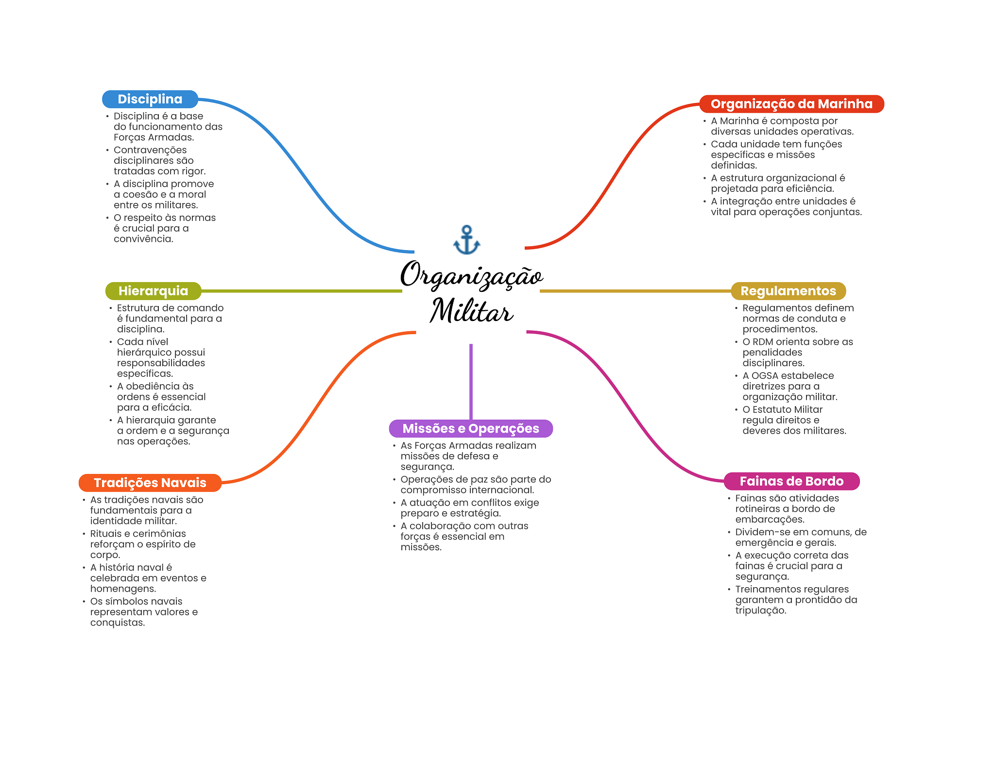 Disciplina Organização da Marinha Disciplina é a base do funcionamento das A Marinha é composta por diversas unidades operativas. Forças Armadas. Cada unidade tem funções Contravenções específicas e missões disciplinares são definidas. tratadas com rigor. A estrutura organizacional é A disciplina promove a coesão e a moral projetada para eficiência. entre militares. A integração entre unidades é respeito às normas vital para operações conjuntas. é crucial para a convivência. Organização Hierarquia Regulamentos Estrutura de comando Militar Regulamentos definem é fundamental para a normas de conduta e disciplina. procedimentos. Cada nível O RDM orienta sobre as hierárquico possui penalidades responsabilidades disciplinares. específicas. A OGSA estabelece A obediência às diretrizes para a ordens é essencial organização militar. para a eficácia. Estatuto Militar A hierarquia garante regula direitos e a ordem e a segurança Missões e Operações deveres dos militares. nas operações. As Forças Armadas realizam missões de defesa e segurança. Tradições Navais Operações de paz são parte do Fainas de Bordo compromisso internacional. As tradições navais são Fainas são atividades A atuação em conflitos exige fundamentais para a rotineiras a bordo de preparo e estratégia. identidade militar. embarcações. A colaboração com outras Rituais e cerimônias forças é essencial em Dividem-se em comuns, de reforçam espírito de missões. emergência e gerais. corpo. A execução correta das A história naval é fainas é crucial para a celebrada em eventos e segurança. homenagens. Treinamentos regulares Os símbolos navais garantem a prontidão da representam valores e tripulação. conquistas.