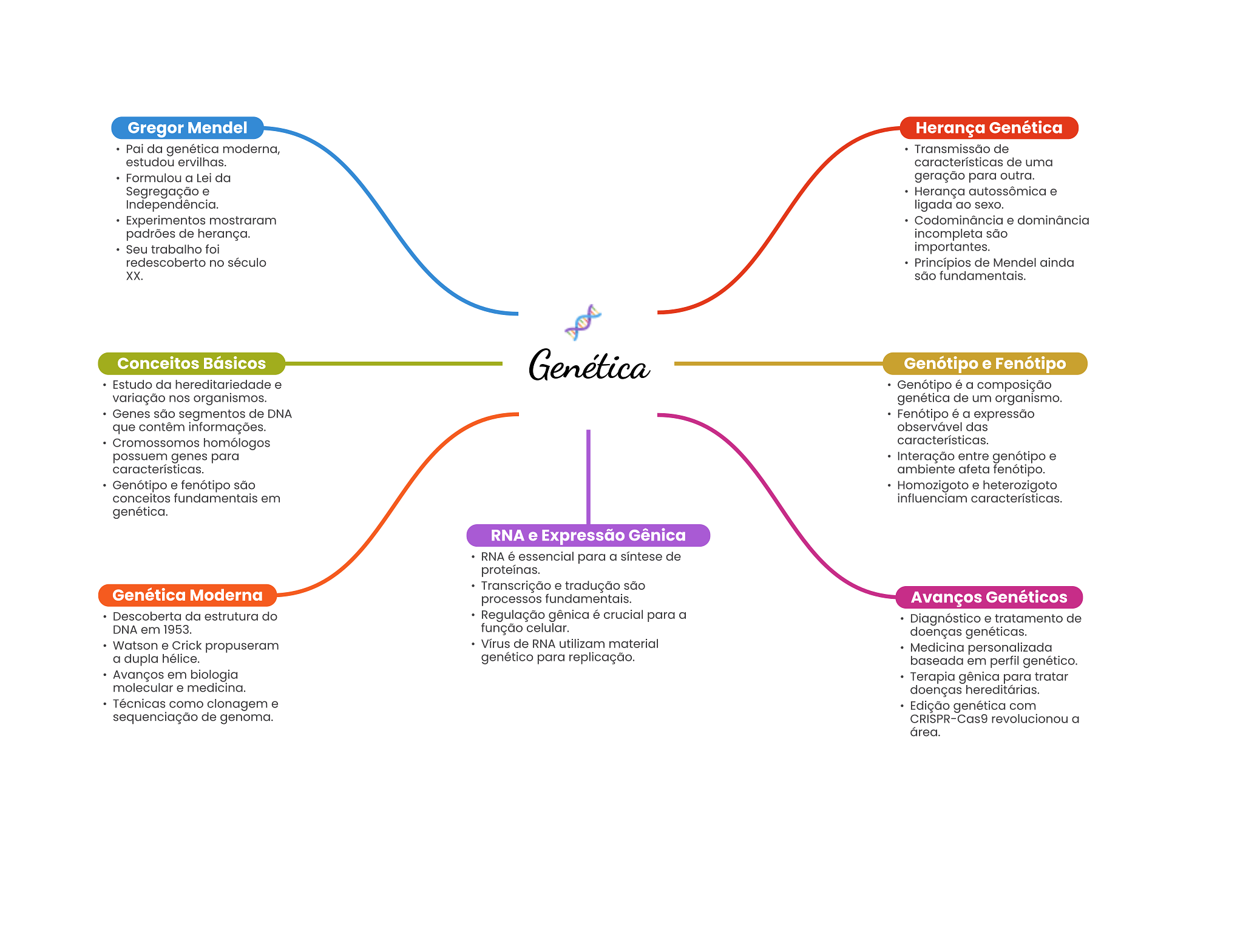 Gregor Mendel Herança Genética Pai da genética moderna, Transmissão de estudou ervilhas. características de uma Formulou a Lei da geração para outra. Segregação e Herança autossômica e Independência. ligada ao sexo. Experimentos mostraram Codominância e dominância padrões de herança. incompleta são Seu trabalho foi importantes. redescoberto no século Princípios de Mendel ainda XX. são fundamentais. Conceitos Básicos Genética Genótipo e Fenótipo Estudo da hereditariedade e Genótipo é a composição variação nos organismos. genética de um organismo. Genes são segmentos de DNA Fenótipo é a expressão que contêm informações. observável das Cromossomos homólogos características. possuem genes para Interação entre genótipo e características. ambiente afeta fenótipo. Genótipo e fenótipo são Homozigoto e heterozigoto conceitos fundamentais em influenciam características. genética. RNA e Expressão Gênica RNA é essencial para a síntese de proteínas. Transcrição e tradução são Genética Moderna processos fundamentais. Avanços Genéticos Descoberta da estrutura do Regulação gênica é crucial para a Diagnóstico e tratamento de DNA em 1953. função celular. doenças genéticas. Watson e Crick propuseram de RNA utilizam material Medicina personalizada a dupla hélice. genético para replicação. baseada em perfil genético. Avanços em biologia Terapia gênica para tratar molecular e medicina. doenças hereditárias. Técnicas como clonagem e Edição genética com sequenciação de genoma. CRISPR-Cas9 revolucionou a área.