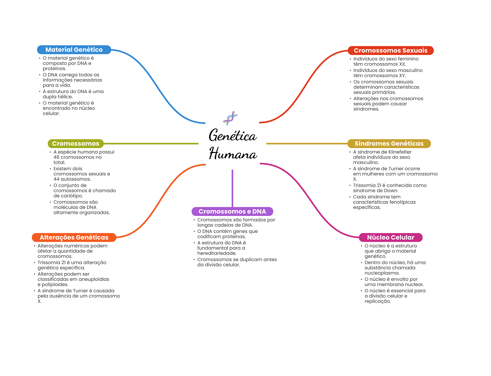 Material Genético Cromossomos Sexuais material genético é Indivíduos do sexo feminino composto por DNA e têm cromossomos XX. proteínas. Indivíduos do sexo masculino DNA carrega todas as têm cromossomos XY. informações necessárias Os cromossomos sexuais para a vida. determinam características A estrutura do DNA é uma sexuais primárias. dupla hélice. Alterações nos cromossomos material genético é sexuais podem causar encontrado no núcleo síndromes. celular. Genética Cromossomos Síndromes Genéticas A espécie humana possui 46 cromossomos no Humana A síndrome de Klinefelter afeta indivíduos do sexo total. masculino. Existem dois A síndrome de Turner ocorre cromossomos sexuais e em mulheres com um cromossomo 44 autossomos. X. conjunto de Trissomia 21 é conhecida como cromossomos é chamado síndrome de Down. de cariótipo. Cada síndrome tem Cromossomos são características fenotípicas moléculas de DNA específicas. altamente organizadas. Cromossomos e DNA Cromossomos são formados por longas cadeias de DNA. DNA contém genes que Alterações Genéticas codificam proteínas. Núcleo Celular A estrutura do DNA é Alterações numéricas podem núcleo é a estrutura fundamental para a afetar a quantidade de hereditariedade. que abriga material cromossomos. genético. Cromossomos se duplicam antes Trissomia 21 é uma alteração da divisão celular. Dentro do núcleo, há uma genética específica. substância chamada Alterações podem ser nucleoplasma. classificadas em aneuploidias núcleo é envolto por e poliploides. uma membrana nuclear. A síndrome de Turner é causada núcleo é essencial para pela ausência de um cromossomo a divisão celular e X. replicação.