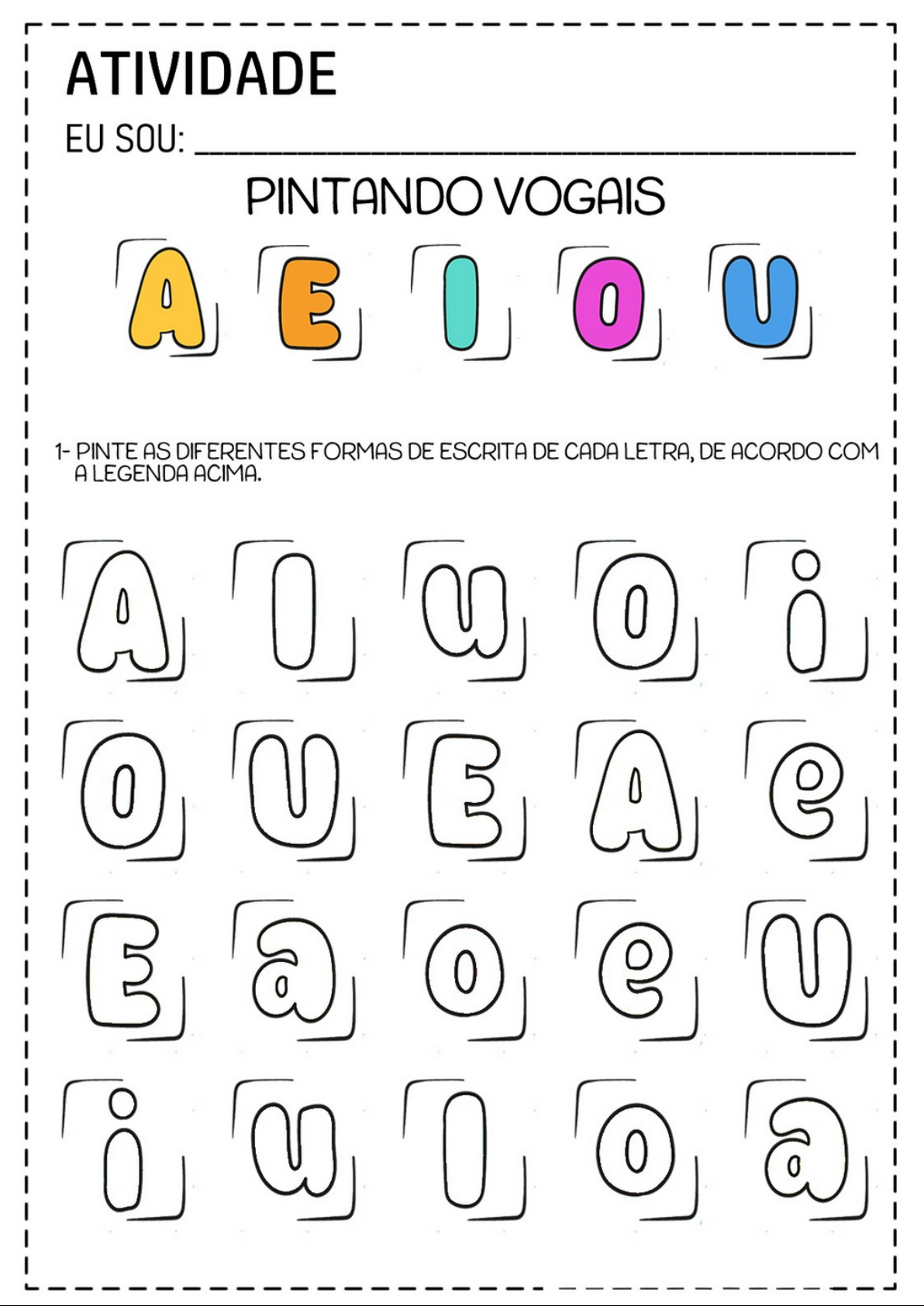 ATIVIDADE EU SOU: PINTANDO VOGAIS 1- PINTE AS DIFERENTES FORMAS DE ESCRITA DE CADA LETRA, DE ACORDO COM A LEGENDA ACIMA. E E a aATIVIDADE EU SOU: 1- PINTE DESENHOS COM NOMES INICIADOS PELAATIVIDADE EU SOU: AS VOGAIS ENCONTRE AS VOGAIS E PINTE, SEGUINDO A LEGENDA: A E I U I UA I ICores primárias Cores primárias vermelho amarelo azul vermelho amarelo azul Cores secundárias Cores secundárias + = + = vermelho amarelo laranja vermelho amarelo laranja + = = vermelho azul violeta vermelho azul violeta + = + = azul amarelo verde azul amarelo verde