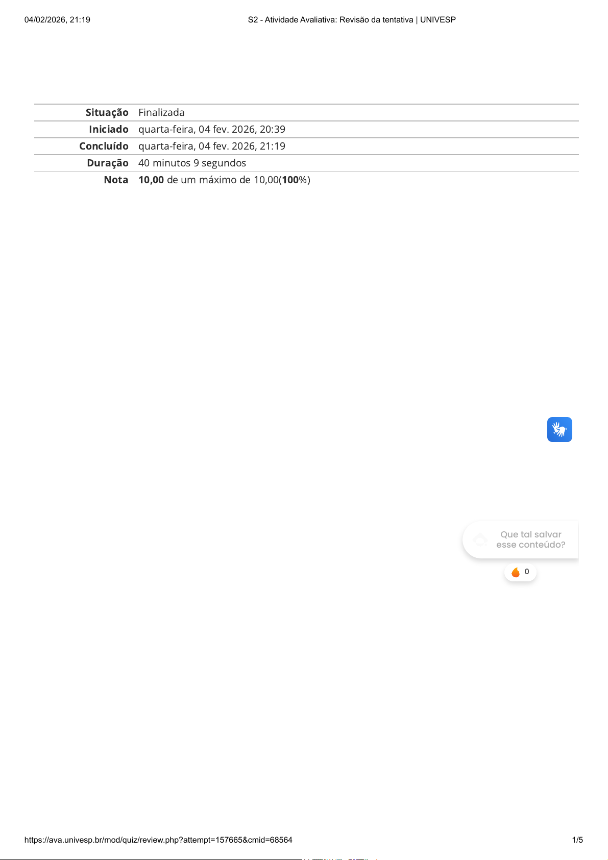 Situação Finalizada Iniciado quarta-feira, 04 fev. 2026, 20:39 Concluído quarta-feira, 04 fev. 2026, 21:19 Duração 40 minutos 9 segundos Nota 10,00 de um máximo de 10,00(100%) Que tal salvar esse conteúdo? 0 04/02/2026, 21:19 S2 - Atividade Avaliativa: Revisão da tentativa | UNIVESP https://ava.univesp.br/mod/quiz/review.php?attempt=157665&cmid=68564 1/5 user Realce user Lápis user Lápis user Lápis user Lápis user Lápis Questão 1 Completo Atingiu 2,50 de 2,50 O Projeto Político-Pedagógico (PPP) desempenha um papel essencial na organização e gestão das atividades escola funcionando como um documento estratégico que orienta as ações da escola. Ele estabelece a missão, os valores e da instituição, além de guiar práticas pedagógicas e administrativas. Associe corretamente os aspectos do PPP com suas respectivas funções e características. Considere que nem todos das colunas podem possuir associação ou podem possuir mais de uma correlação. Competências: Descrições: I. Visão Estratégica A. Orienta a escola na implementação de práticas pedagógicas atualiz incentivando a introdução de novas metodologias de ensino. II. Reflexão da Identidade da Escola B. Funciona como uma referência para ajustes constantes, adaptando ambiente escolar aos desafios educacionais e tecnológicos emergente III. Alinhamento com a Comunidade C. Permite que a escola se conecte com as expectativas e necessidade fortalecendo a relação com a comunidade. IV. Direção para Inovações Pedagógicas D. Estabelece objetivos e metas claras, direcionando os esforços da es alcançar resultados educacionais de longo prazo. V. Compromisso com a Qualidade do Ensino E. Garante que a escola mantenha uma coerência com seus princípios tradições, integrando aspectos históricos e culturais em sua missão. VI. Ferramenta para Avaliação e Melhoria Contínua F. Assegura que a escola promova uma educação de qualidade, adapt continuamente às demandas de um mundo em constante mudança. Assinale a alternativa que contém a associação correta. a. I-E; II-D; III-B; IV-C; V-A; VI-F b. I-D; II-E; III-C; IV-A; V-F; VI-B c. I-F; II-B; III-A; IV-E; V-D; VI-C d. I-A; II-F; III-D; IV-B; V-C; VI-E e. I-C; II-A; III-E; IV-D; V-B; VI-F Que tal salvar esse conteúdo? 04/02/2026, 21:19 S2 - Atividade Avaliativa: Revisão da tentativa | UNIVESP https://ava.univesp.br/mod/quiz/review.php?attempt=157665&cmid=68564 2/5 user Lápis user Lápis user Lápis Questão 2 Completo Atingiu 2,50 de 2,50 O Currículo Paulista (2019) visa preparar os alunos para os desafios do século XXI, promovendo diversas competên essenciais para a formação integral dos estudantes. Este currículo destaca a importância de habilidades flexíveis e interdisciplinares, essenciais para a educação contemporânea. SÃO PAULO (Estado). Secretaria da Educação. Currículo Paulista: uma construção colaborativa. São Paulo, 2019. Com base nisso, identifique a competência correta promovida pelo Currículo Paulista: a. Pensamento crítico. b. Desconsideração das habilidades práticas. c. Conhecimentos históricos sobre o período colonial brasileiro. d. Exclusiva memorização de conteúdos. e. Aplicação de métodos de ensino tradicionais. Que tal salvar esse conteúdo? 04/02/2026, 21:19 S2 - Atividade Avaliativa: Revisão da tentativa | UNIVESP https://ava.univesp.br/mod/quiz/review.php?attempt=157665&cmid=68564 3/5 user Lápis user Lápis Questão 3 Completo Atingiu 2,50 de 2,50 O projeto "Contraturno" na escola Ângelo Bizzo visa proporcionar atividades complementares que enriquecem o ap dos alunos por meio de vivências culturais, esportivas e lúdicas. Essas atividades são planejadas para favorecer o desenvolvimento integral dos estudantes e atuar na superação de dificuldades educacionais. Com relação a esse contexto, analise as asserções a seguir e a relação proposta entre elas: I. O projeto "Contraturno" promove a inclusão e a equidade na escola, oferecendo oportunidades de aprendizado q além do currículo regular, proporcionando vivências que atendem às necessidades dos alunos em diferentes áreas desenvolvimento. PORQUE II. As oficinas realizadas durante o contraturno, como a dança recreativa, permitem aos alunos desenvolverem hab emocionais e sociais, além de promoverem o exercício da cidadania e a construção de uma identidade autônoma. A respeito dessas asserções, assinale a alternativa correta. a. A asserção I é uma proposição falsa, e a II é uma proposição verdadeira. b. As asserções I e II são falsas. c. As asserções I e II são proposições verdadeiras, mas a II não é uma justificativa da I. d. A asserção I é uma proposição verdadeira, e a II é uma proposição falsa. e. As asserções I e II são proposições verdadeiras, e a II é uma justificativa da I. Que tal salvar esse conteúdo? 04/02/2026, 21:19 S2 - Atividade Avaliativa: Revisão da tentativa | UNIVESP https://ava.univesp.br/mod/quiz/review.php?attempt=157665&cmid=68564 4/5 user Lápis user Lápis Questão 4 Completo Atingiu 2,50 de 2,50 O Projeto Dia da Consciência Negra na escola Ângelo Bizzo tem como objetivo promover a valorização da cultura af afro-brasileira, incentivando debates, apresentações artísticas e reflexões sobre a história e a contribuição dos afrodescendentes para a sociedade brasileira. Com relação a esse contexto, analise as asserções a seguir e a relação proposta entre elas: I. O Projeto Dia da Consciência Negra na escola Ângelo Bizzo busca não apenas promover a valorização da cultura a mas também combater práticas discriminatórias, incentivando o respeito à diversidade e a construção de uma iden plural. PORQUE II. Atividades como apresentações de danças, exposições de objetos culturais e debates ajudam a desconstruir este ampliando a compreensão dos alunos sobre as influências africanas na cultura brasileira e criando um ambiente es inclusivo. A respe