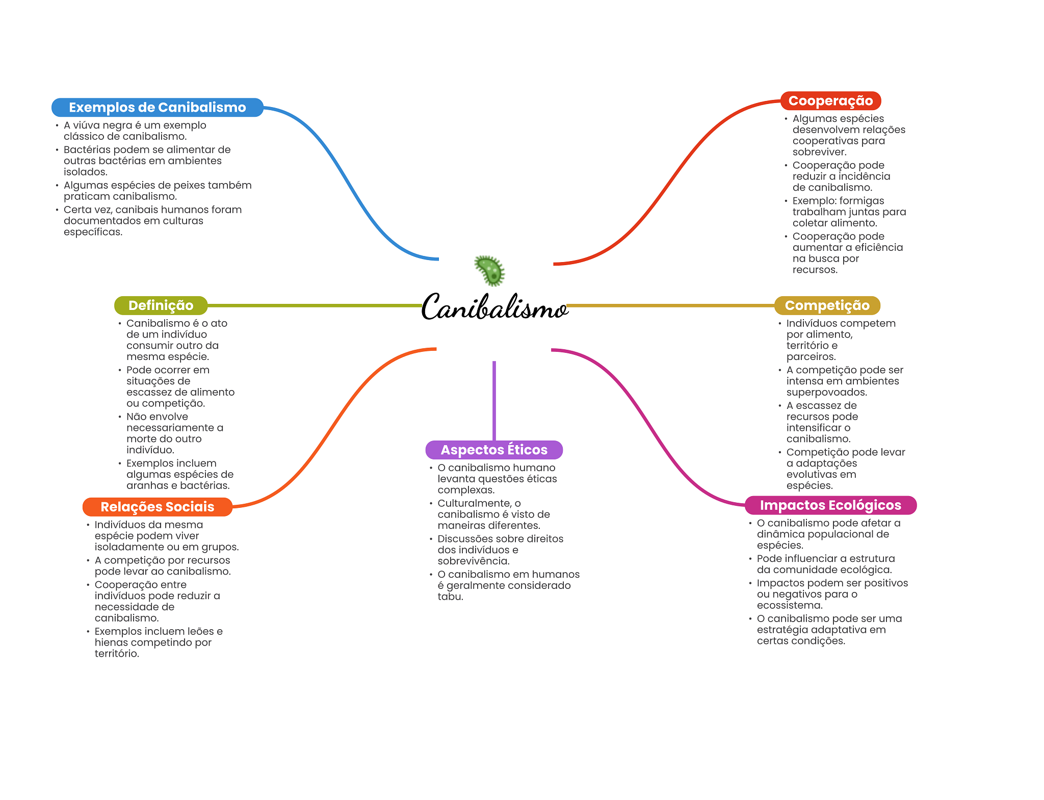 Exemplos de Canibalismo Cooperação Algumas espécies A viúva negra é um exemplo desenvolvem relações clássico de canibalismo. cooperativas para Bactérias podem se alimentar de sobreviver. outras bactérias em ambientes Cooperação pode isolados. reduzir a incidência Algumas espécies de peixes também de canibalismo. praticam canibalismo. Exemplo: formigas Certa vez, canibais humanos foram trabalham juntas para documentados em culturas coletar alimento. específicas. Cooperação pode aumentar a eficiência na busca por recursos. Definição Canibalismo Competição Canibalismo é ato Indivíduos competem de um indivíduo por alimento, consumir outro da território e mesma espécie. parceiros. Pode ocorrer em A competição pode ser situações de intensa em ambientes escassez de alimento superpovoados. ou competição. A escassez de Não envolve recursos pode necessariamente a intensificar morte do outro canibalismo. indivíduo. Aspectos Éticos Competição pode levar Exemplos incluem canibalismo humano a adaptações algumas espécies de levanta questões éticas evolutivas em aranhas e bactérias. complexas. espécies. Relações Sociais Culturalmente, Impactos Ecológicos canibalismo é visto de Indivíduos da mesma maneiras diferentes. canibalismo pode afetar a espécie podem viver Discussões sobre direitos dinâmica populacional de isoladamente ou em grupos. dos indivíduos e espécies. A competição por recursos sobrevivência. Pode influenciar a estrutura pode levar ao canibalismo. canibalismo em humanos da comunidade ecológica. Cooperação entre é geralmente considerado Impactos podem ser positivos indivíduos pode reduzir a tabu. ou negativos para necessidade de ecossistema. canibalismo. canibalismo pode ser uma Exemplos incluem leões e estratégia adaptativa em hienas competindo por certas condições. território.