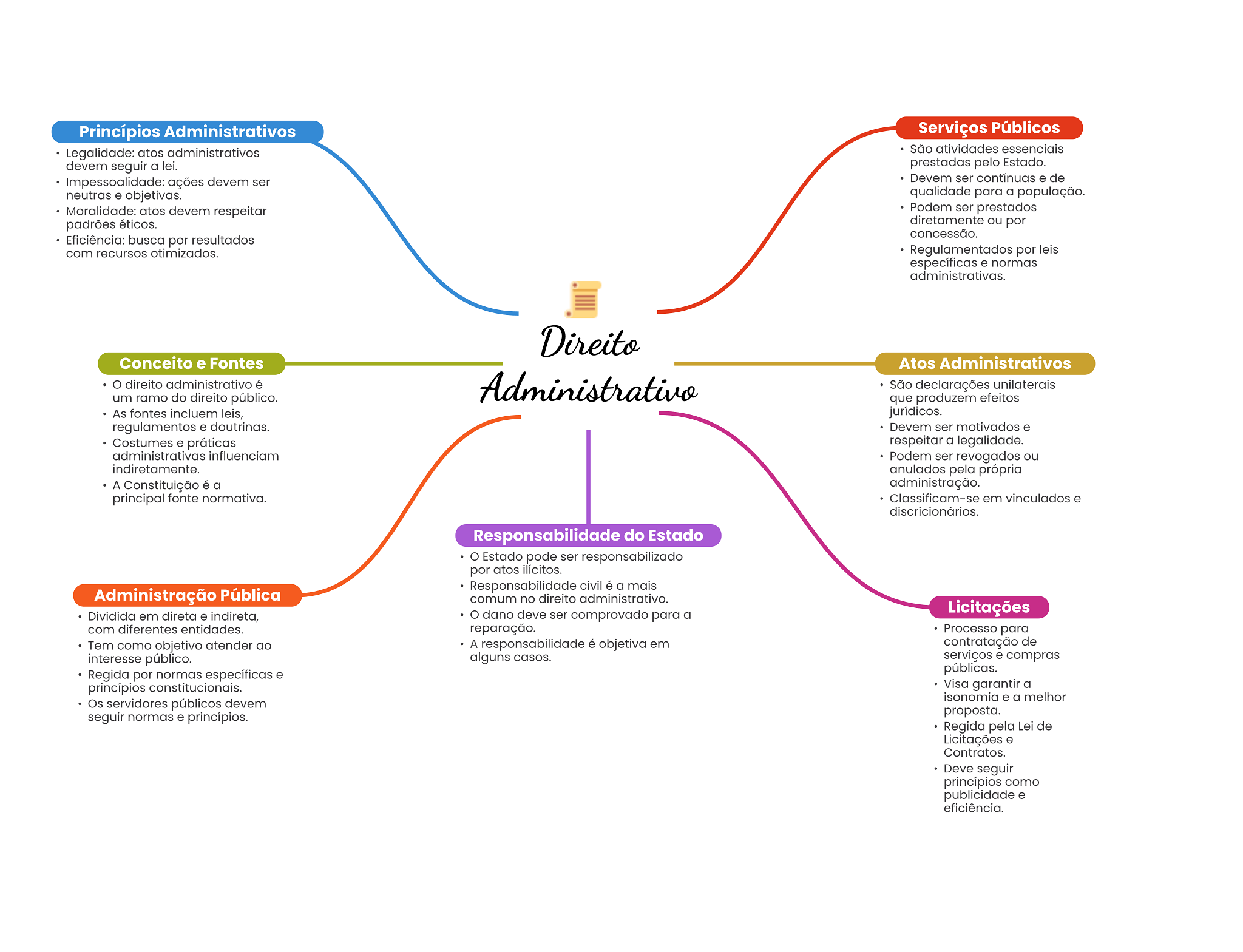 Princípios Administrativos Serviços Públicos Legalidade: atos administrativos São atividades essenciais devem seguir a lei. prestadas pelo Estado. Impessoalidade: ações devem ser Devem ser contínuas e de neutras e objetivas. qualidade para a população. Moralidade: atos devem respeitar Podem ser prestados padrões éticos. diretamente ou por concessão. Eficiência: busca por resultados com recursos otimizados. Regulamentados por leis específicas e normas administrativas. Direito Conceito e Fontes Atos Administrativos direito administrativo é Administrativo São declarações unilaterais um ramo do direito público. que produzem efeitos As fontes incluem leis, jurídicos. regulamentos e doutrinas. Devem ser motivados e Costumes e práticas respeitar a legalidade. administrativas influenciam Podem ser revogados ou indiretamente. anulados pela própria A Constituição é a administração. principal fonte normativa. Classificam-se em vinculados e discricionários. Responsabilidade do Estado Estado pode ser responsabilizado por atos ilícitos. Responsabilidade civil é a mais Administração Pública comum no direito administrativo. dano deve ser comprovado para a Licitações Dividida em direta e indireta, com diferentes entidades. reparação. Processo para Tem como objetivo atender ao A responsabilidade é objetiva em contratação de interesse público. alguns casos. serviços e compras Regida por normas específicas e públicas. princípios constitucionais. Visa garantir a isonomia e a melhor Os servidores públicos devem seguir normas e princípios. proposta. Regida pela Lei de Licitações e Contratos. Deve seguir princípios como publicidade e eficiência.