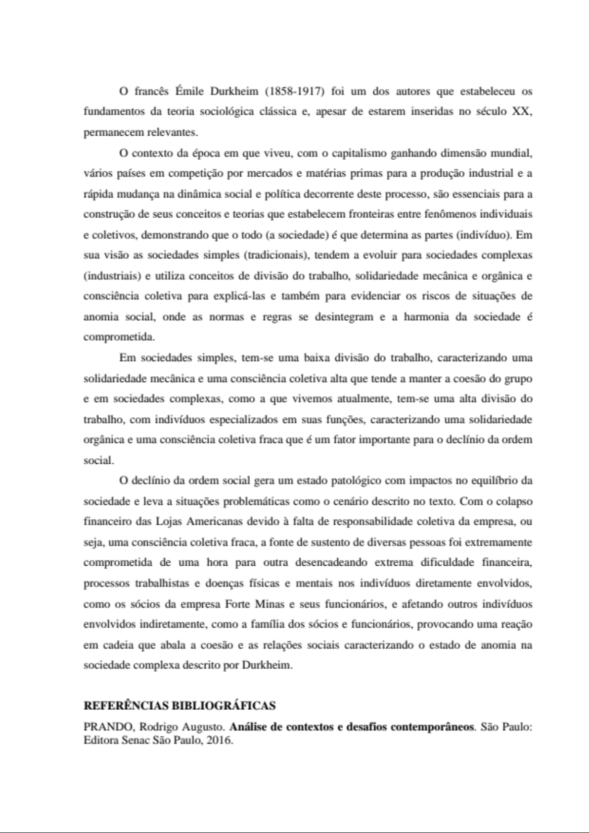 francês Émile Durkheim (1858-1917) foi um dos autores que estabeleceu os fundamentos da teoria sociológica clássica e, apesar de estarem inseridas no século XX, permanecem relevantes. contexto da época em que viveu, com capitalismo ganhando dimensão mundial, vários países em competição por mercados e matérias primas para a produção industrial e a rápida mudança na dinâmica social e política decorrente deste processo, são essenciais para a construção de seus conceitos e teorias que estabelecem fronteiras entre fenômenos individuais e coletivos, demonstrando que todo (a sociedade) é que determina as partes (indivíduo). Em sua visão as sociedades simples (tradicionais), tendem a evoluir para sociedades complexas (industriais) e utiliza conceitos de divisão do trabalho, solidariedade mecânica e orgânica e consciência coletiva para explicá-las e também para evidenciar os riscos de situações de anomia social, onde as normas e regras se desintegram e a harmonia da sociedade é comprometida. Em sociedades simples, tem-se uma baixa divisão do trabalho, caracterizando uma solidariedade mecânica e uma consciência coletiva alta que tende a manter a coesão do grupo e em sociedades complexas, como a que vivemos atualmente, tem-se uma alta divisão do trabalho, com indivíduos especializados em suas funções, caracterizando uma solidariedade orgânica e uma consciência coletiva fraca que é um fator importante para o declínio da ordem social. declínio da ordem social gera um estado patológico com impactos no equilíbrio da sociedade e leva a situações problemáticas como o cenário descrito no texto. Com o colapso financeiro das Lojas Americanas devido à falta de responsabilidade coletiva da empresa, ou seja, uma consciência coletiva fraca, a fonte de sustento de diversas pessoas foi extremamente comprometida de uma hora para outra desencadeando extrema dificuldade financeira, processos trabalhistas e doenças físicas e mentais nos indivíduos diretamente envolvidos, como os sócios da empresa Forte Minas e seus funcionários, e afetando outros indivíduos envolvidos indiretamente, como a família dos sócios e funcionários, provocando uma reação em cadeia que abala a coesão e as relações sociais caracterizando o estado de anomia na sociedade complexa descrito por Durkheim. REFERÊNCIAS BIBLIOGRÁFICAS PRANDO, Rodrigo Augusto. Análise de contextos e desafios contemporâneos. São Paulo: Editora Senac São Paulo, 2016.