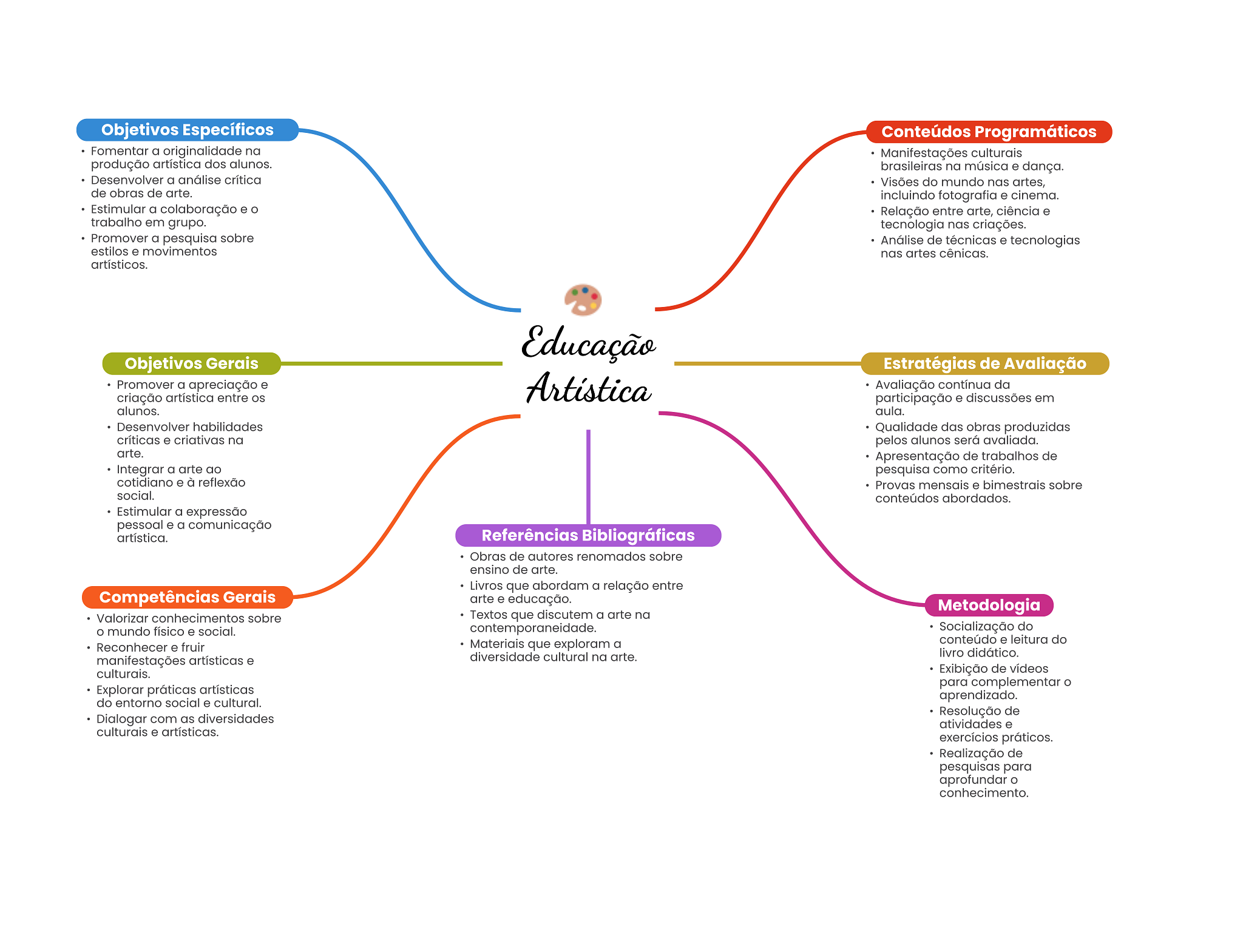 Objetivos Específicos Conteúdos Programáticos Fomentar a originalidade na Manifestações culturais produção artística dos alunos. brasileiras na música e dança. Desenvolver a análise crítica Visões do mundo nas artes, de obras de arte. incluindo fotografia e cinema. Estimular a colaboração e Relação entre arte, ciência e trabalho em grupo. tecnologia nas criações. Promover a pesquisa sobre Análise de técnicas e tecnologias estilos e movimentos nas artes cênicas. artísticos. Educação Objetivos Gerais Estratégias de Avaliação Promover a apreciação e criação artística entre Artística Avaliação contínua da participação e discussões em alunos. aula. Desenvolver habilidades Qualidade das obras produzidas críticas e criativas na pelos alunos será avaliada. arte. Apresentação de trabalhos de Integrar a arte ao pesquisa como critério. cotidiano e à reflexão Provas mensais e bimestrais sobre social. conteúdos abordados. Estimular a expressão pessoal e a comunicação artística. Referências Bibliográficas Obras de autores renomados sobre ensino de arte. Livros que abordam a relação entre Competências Gerais arte e educação. Metodologia Valorizar conhecimentos sobre Textos que discutem a arte na mundo físico e social. contemporaneidade Socialização do Reconhecer e fruir Materiais que exploram a conteúdo e leitura do manifestações artísticas e diversidade cultural na arte. livro didático. culturais. Exibição de vídeos para complementar Explorar práticas artísticas aprendizado. do entorno social e cultural. Resolução de Dialogar com as diversidades atividades e culturais e artísticas. exercícios práticos. Realização de pesquisas para aprofundar conhecimento.