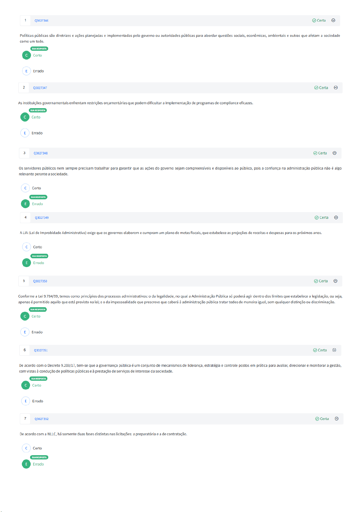 1 Q3027346 Certa Políticas públicas são diretrizes e ações planejadas e implementadas pelo governo ou autoridades públicas para abordar questões sociais, econômicas, ambientais e outras que afetam a sociedade como um todo. SUA RESPOSTA Certo E Errado 2 Q3027347 Certa As instituições governamentais enfrentam restrições orçamentárias que podem dificultar a implementação de programas de compliance eficazes. SUA RESPOSTA Certo E Errado 3 Q3027348 Certa Os servidores públicos nem sempre precisam trabalhar para garantir que as ações do governo sejam compreensíveis e disponíveis ao público, pois a confiança na administração pública não é algo relevante perante a sociedade. Certo SUA RESPOSTA E Errado 4 Q3027349 Certa A LIA (Lei de Improbidade Administrativa) exige que os governos elaborem e cumpram um plano de metas fiscais, que estabelece as projeções de receitas e despesas para os próximos anos. Certo SUA RESPOSTA E Errado 5 Q3027350 Certa Conforme a Lei 9.784/99, temos como princípios dos processos administrativos: da legalidade, no qual a Administração Pública só poderá agir dentro dos limites que estabelece a legislação, ou seja, apenas é permitido aquilo que está previsto na lei; e da impessoalidade que prescreve que caberá à administração pública tratar todos de maneira igual, sem qualquer distinção ou discriminação. SUA RESPOSTA Certo E Errado 6 Q3027351 Certa De acordo com Decreto 9.203/17, tem-se que a governança pública é um conjunto de mecanismos de liderança, estratégia e controle postos em prática para avaliar, direcionar e monitorar a gestão, com vistas à condução de políticas públicas e à prestação de serviços de interesse da sociedade. Certo E Errado 7 Q3027352 Certa De acordo com a NLLC, há somente duas fases distintas nas licitações: a preparatória e a de contratação. Certo E Errado8 Q3027353 ! Errada De acordo com a LAI, tem-se como conceito de informação conjunto de ações referentes à produção, recepção, classificação, utilização, acesso, reprodução, transporte, transmissão, distribuição, arquivamento, armazenamento, eliminação, avaliação, destinação ou controle da informação. SUA RESPOSTA Certo RESPOSTA CORRETA E Errado 9 Q3027354 Certa De acordo com a Lei 8.112/90, as denúncias sobre irregularidades serão objeto de apuração, desde que contenham a identificação e endereço do denunciante e sejam formuladas por escrito, confirmada a autenticidade. SUA RESPOSTA Certo E Errado 10 Q3027355 Certa De acordo com a CF/88, somente a fiscalização financeira e a orçamentária da União e das entidades da administração direta e indireta, quanto à legalidade, será exercida pelo Senado Federal. Certo SUA RESPOSTA E Errado