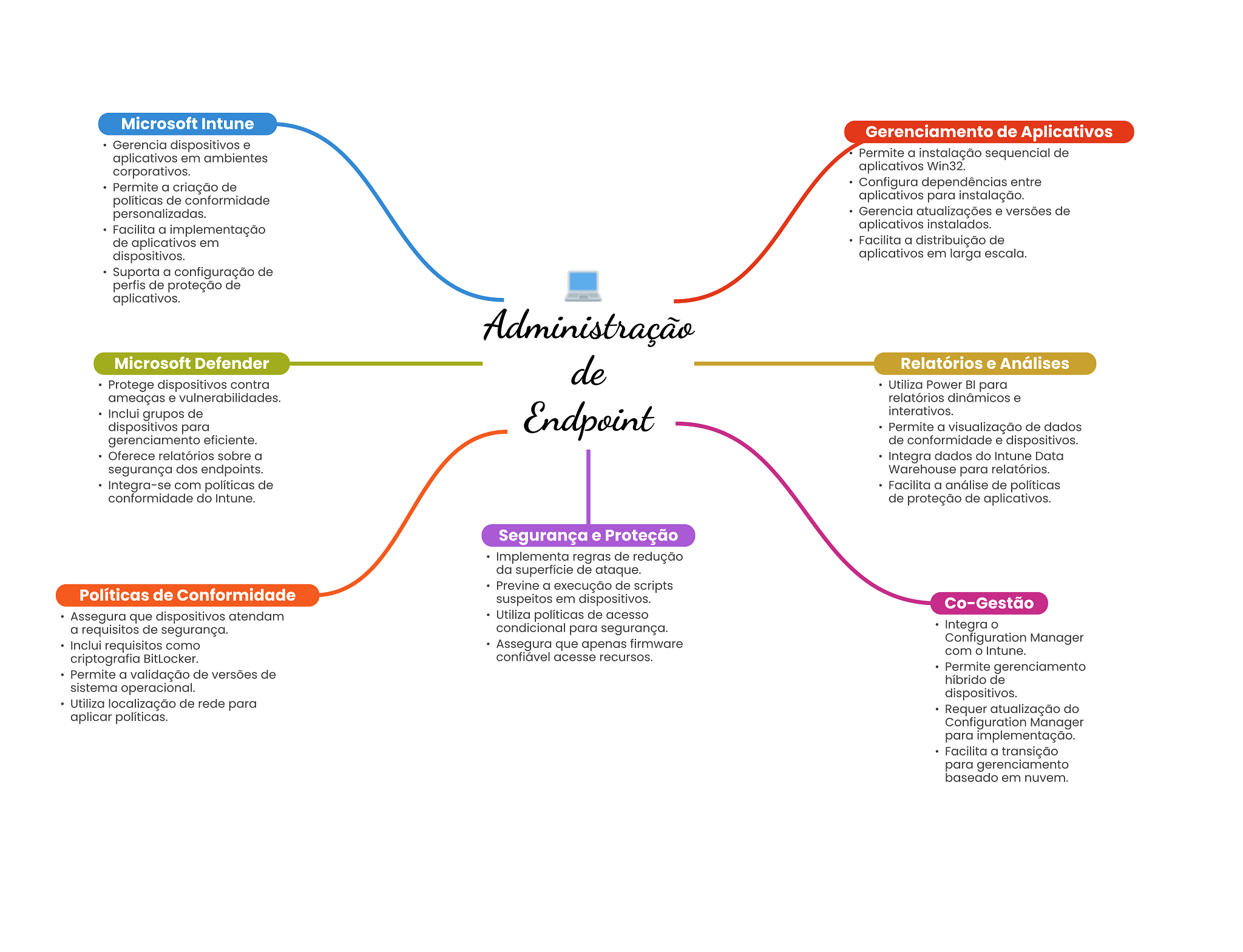 Microsoft Intune Gerenciamento de Aplicativos Gerencia dispositivos e aplicativos em ambientes Permite a instalação sequencial de corporativos. aplicativos Win32. Permite a criação de Configura dependências entre políticas de conformidade aplicativos para instalação. personalizadas. Gerencia atualizações e versões de Facilita a implementação aplicativos instalados. de aplicativos em Facilita a distribuição de dispositivos. aplicativos em larga escala. Suporta a configuração de perfis de proteção de aplicativos. Administração Microsoft Defender de Relatórios e Análises Protege dispositivos contra Utiliza Power BI para ameaças e vulnerabilidades. relatórios dinâmicos e Inclui grupos de dispositivos para Endpoint interativos. Permite a visualização de dados gerenciamento eficiente. de conformidade e dispositivos. Oferece relatórios sobre a Integra dados do Intune Data segurança dos endpoints. Warehouse para relatórios. Integra-se com políticas de Facilita a análise de políticas conformidade do Intune. de proteção de aplicativos. Segurança e Proteção Implementa regras de redução da superfície de ataque. Previne a execução de scripts Políticas de Conformidade suspeitos em dispositivos. Co-Gestão Assegura que dispositivos atendam Utiliza políticas de acesso a requisitos de segurança. condicional para segurança. Integra Inclui requisitos como Assegura que apenas firmware Configuration Manager com Intune. criptografia BitLocker. confiável acesse recursos. Permite gerenciamento Permite a validação de versões de híbrido de sistema operacional. dispositivos. Utiliza localização de rede para Requer atualização do aplicar políticas. Configuration Manager para implementação. Facilita a transição para gerenciamento baseado em nuvem.