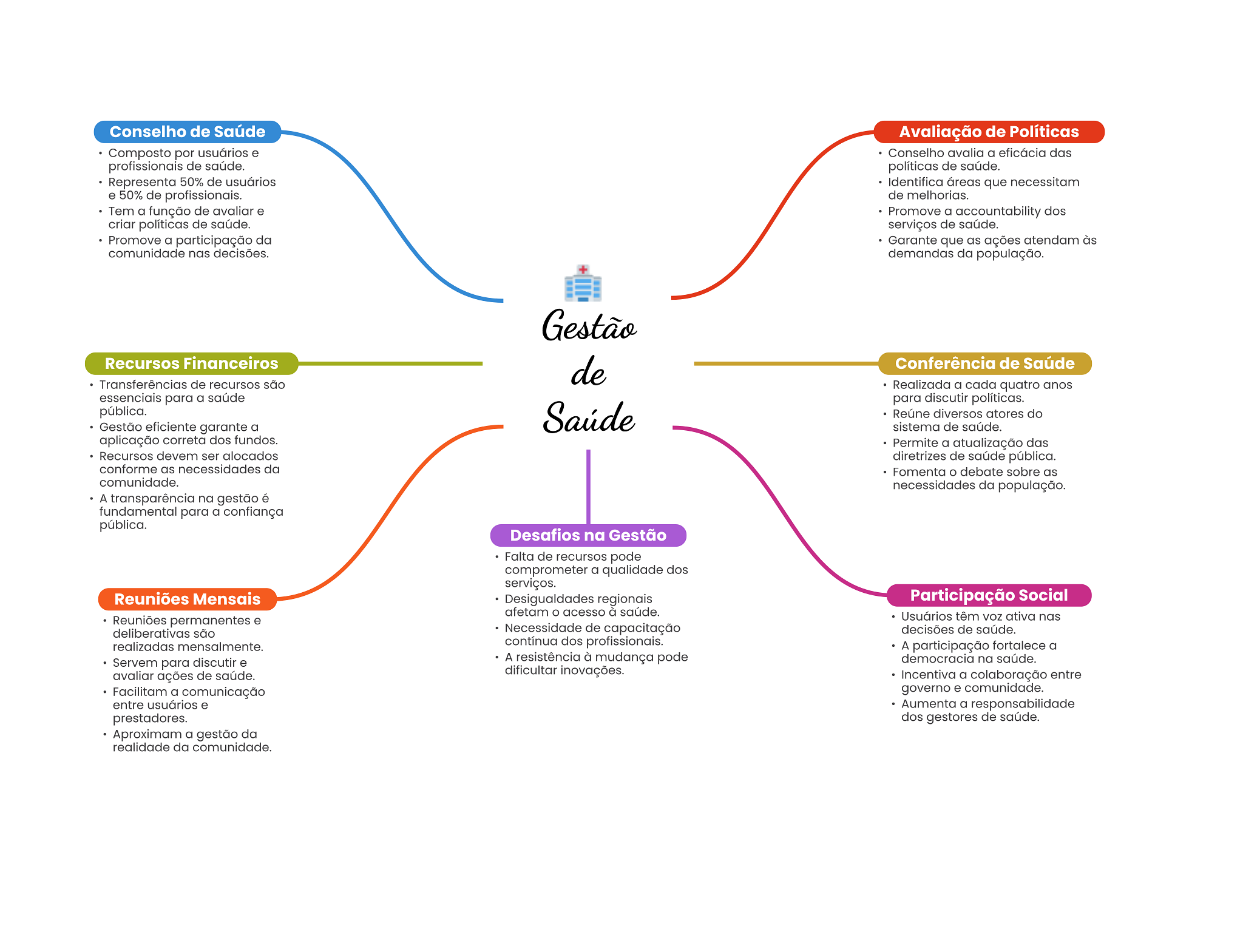 Conselho de Saúde Avaliação de Políticas Composto por usuários e Conselho avalia a eficácia das profissionais de saúde. políticas de saúde. Representa 50% de usuários Identifica áreas que necessitam e 50% de profissionais. de melhorias. Tem a função de avaliar e Promove a accountability dos criar políticas de saúde. serviços de saúde. Promove a participação da Garante que as ações atendam às comunidade nas decisões. demandas da população. Gestão Recursos Financeiros de Conferência de Saúde Transferências de recursos são Realizada a cada quatro anos essenciais para a saúde para discutir políticas. pública. Saúde Reúne diversos atores do Gestão eficiente garante a sistema de saúde. aplicação correta dos fundos. Permite a atualização das Recursos devem ser alocados diretrizes de saúde pública. conforme as necessidades da Fomenta debate sobre as comunidade. necessidades da população. A transparência na gestão é fundamental para a confiança pública. Desafios na Gestão Falta de recursos pode comprometer a qualidade dos serviços. Reuniões Mensais Desigualdades regionais Participação Social afetam acesso à saúde. Reuniões permanentes e Usuários têm voz ativa nas deliberativas são Necessidade de capacitação decisões de saúde. realizadas mensalmente. contínua dos profissionais. A participação fortalece a Servem para discutir e A resistência à mudança pode democracia na saúde. avaliar ações de saúde. dificultar inovações. Incentiva a colaboração entre Facilitam a comunicação governo e comunidade. entre usuários e Aumenta a responsabilidade prestadores. dos gestores de saúde. Aproximam a gestão da realidade da comunidade.