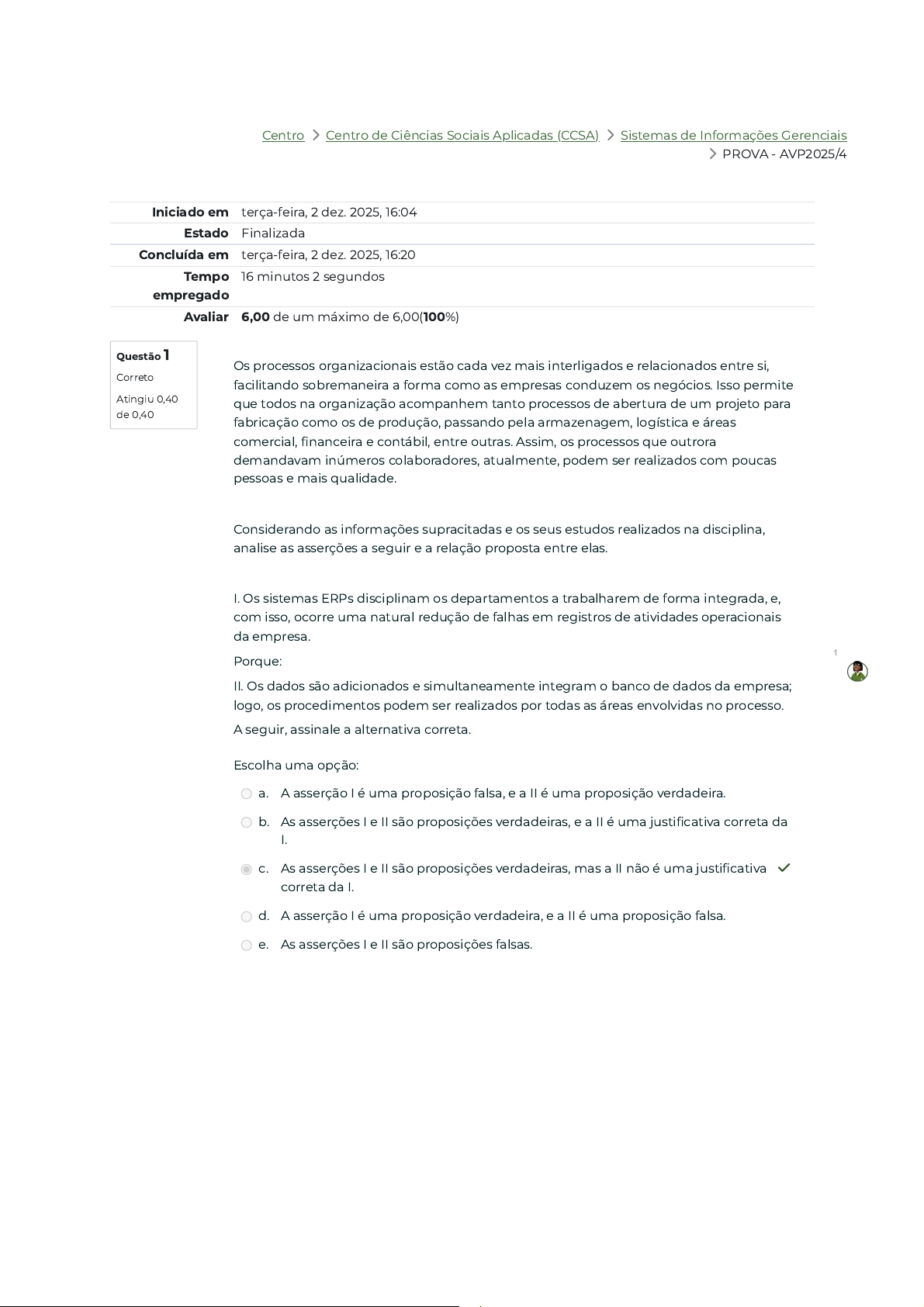 Centro 〉 Centro de Ciências Sociais Aplicadas (CCSA) 〉 Sistemas de Informações Gerenciais 〉 PROVA - AVP2025/4 Questão 1 Correto Atingiu 0,40 de 0,40 Iniciado em terça-feira, 2 dez. 2025, 16:04 Estado Finalizada Concluída em terça-feira, 2 dez. 2025, 16:20 Tempo empregado 16 minutos 2 segundos Avaliar 6,00 de um máximo de 6,00(100%) Os processos organizacionais estão cada vez mais interligados e relacionados entre si, facilitando sobremaneira a forma como as empresas conduzem os negócios. Isso permite que todos na organização acompanhem tanto processos de abertura de um projeto para fabricação como os de produção, passando pela armazenagem, logística e áreas comercial, financeira e contábil, entre outras. Assim, os processos que outrora demandavam inúmeros colaboradores, atualmente, podem ser realizados com poucas pessoas e mais qualidade. Considerando as informações supracitadas e os seus estudos realizados na disciplina, analise as asserções a seguir e a relação proposta entre elas. I. Os sistemas ERPs disciplinam os departamentos a trabalharem de forma integrada, e, com isso, ocorre uma natural redução de falhas em registros de atividades operacionais da empresa. Porque: II. Os dados são adicionados e simultaneamente integram o banco de dados da empresa; logo, os procedimentos podem ser realizados por todas as áreas envolvidas no processo. A seguir, assinale a alternativa correta. Escolha uma opção: a. A asserção I é uma proposição falsa, e a II é uma proposição verdadeira. b. As asserções I e II são proposições verdadeiras, e a II é uma justificativa correta da I. c. As asserções I e II são proposições verdadeiras, mas a II não é uma justificativa correta da I. ✓ d. A asserção I é uma proposição verdadeira, e a II é uma proposição falsa. e. As asserções I e II são proposições falsas. 1 https://ava.graduacaoead.unicv.edu.br/course/index.php?categoryid=267 https://ava.graduacaoead.unicv.edu.br/course/index.php?categoryid=266 https://ava.graduacaoead.unicv.edu.br/course/view.php?id=13268#section-10 Questão 2 Correto Atingiu 0,40 de 0,40 Lucca (2013) discorreu que a competição entre as organizações não acontece com arcos, flechas e longas lanças, mas com recursos financeiros, mercadológicos, muita engenharia e capital intelectual. LUCCA, G. Gestão Estratégica balanceada: um enfoque nas boas práticas estratégicas. São Paulo: Atlas, 2013. Com base nas informações apresentadas acima, leia as asserções abaixo: I. Podem existir dificuldades em avaliar a eficiência e eficácia de um sistema de Business Intelligence (BI). PORQUE II. Alguns indicadores de monitoramento podem exigir a integração de um sistema de informação com informações especializadas. A respeito dessas asserções, assinale a opção correta: Escolha uma opção: a. A asserção I é uma proposição verdadeira e a II é uma proposição falsa. b. As asserções I e II são proposições falsas. c. A asserção I é uma proposição falsa e a II é uma proposição verdadeira. d. As asserções I e II são proposições verdadeiras e a II é uma justificativa correta da I. ✓ e. As asserções I e II são proposições verdadeiras, mas a II não é uma justificativa correta da I. 1 Questão 3 Correto Atingiu 0,40 de 0,40 Todos os sistemas de informação visam apoiar a tomada de decisão, ainda que indiretamente, mas os sistemas de apoio à decisão são expressamente projetados para tal finalidade. À medida que esses sistemas são, cada vez mais, desenvolvidos para analisar conjuntos massivos de dados (conhecidos como big data), eles têm se tornado conhecidos como Business Intelligence (BI), sendo de fundamental importância à gestão nas organizações. Diante do exposto e dos seus estudos na disciplina, analise as asserções a seguir e a relação proposta entre elas. I. Devido à revolução da tecnologia da informação e ao surgimento de ferramentas de otimização para tratamento de grandes volumes de dados, surgiram os modelos OLAP (Online Analytical Processing) para a geração de relatórios estratégicos em tempo real. Porque: II. Esses modelos utilizam os conhecidos cubos de decisão, que combinam perspectivas e indicadores estratégicos, além de permitir ao gestor formular questionamentos, de forma ágil e prática, sem a necessidade de conhecimentos anteriores na área de tecnologia da informação. Escolha uma opção: a. A asserção I é uma proposição verdadeira, e a II é uma proposição falsa. b. As asserções I e II são proposições falsas. c. A asserção I é uma proposição falsa, e a II é uma proposição verdadeira. d. As asserções I e II são proposições verdadeiras, e a II é uma justificativa correta da I. e. As asserções I e II são proposições verdadeiras, mas a II não é uma justificativa correta da I. ✓ 1 Questão 4 Correto Atingiu 0,40 de 0,40 Leia o fragmento a seguir. A tecnologia da informação surgiu como uma fonte que proporcionaria a redução de custos, agilizaria o processo decisório e diminuiria distâncias, e, além disso, ela tem sido, cada vez mais, aplicada em todos os ramos da atividade humana devido ao crescimento de seus recursos e habilidades. SANTOS, A. P. O comércio eletrônico e as mudanças sobre o conteúdo e o processo decisório estratégico. 2002. Dissertação (mestrado em Administração) – Escola de Administração, Universidade Federal do Paraná, Curitiba. Diante do exposto e de acordo com o estudado acerca dos elementos de infraestrutura que compõem a tecnologia da informação, leia as afirmativas a seguir. I. Hardwares: equipamentos usados para a utilização do sistema, ou seja, a parte física (computadores, servidores etc.). II. Softwares: sistemas e aplicativos criados para o gerenciamento; são a parte lógica do processo. III. Arquitetura de sistemas: referente ao projeto, à análise e à engenharia de software, e às redes e/ou