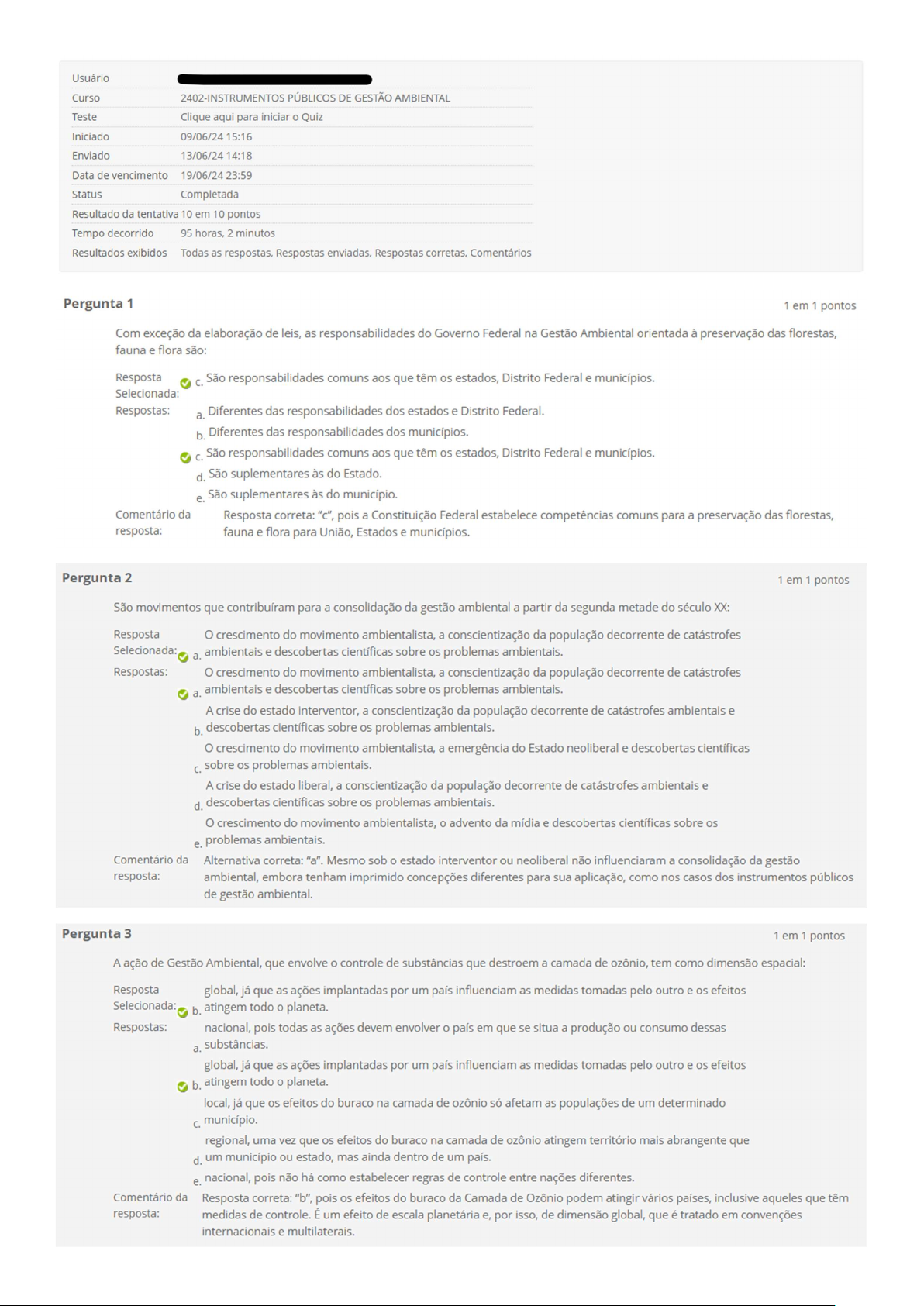 Usuário Curso PÚBLICOS DE GESTÃO AMBIENTAL Teste Clique aqui para iniciar Quiz Iniciado 09/06/24 15:16 Enviado 13/06/24 14:18 Data de vencimento 19/06/24 Status Completada Resultado da tentativa 10 em 10 pontos Tempo decorrido 95 horas, 2 minutos Resultados exibidos Todas as respostas, Respostas enviadas, Respostas corretas, Comentários Pergunta 1 1 em 1 pontos Com exceção da elaboração de leis, as responsabilidades do Governo Federal na Gestão Ambiental orientada à preservação das florestas, fauna e flora são: Resposta São responsabilidades comuns aos que têm os estados, Distrito Federal e municípios. Selecionada: Respostas: a. Diferentes das responsabilidades dos estados e Distrito Federal. b. Diferentes das responsabilidades dos municípios. São responsabilidades comuns aos que têm os estados, Distrito Federal e municípios. d. São suplementares às do Estado. e. São suplementares às do município. Comentário da Resposta correta: pois a Constituição Federal estabelece competências comuns para a preservação das florestas, resposta: fauna e flora para União, Estados e municípios. Pergunta 2 1 em 1 pontos São movimentos que contribuíram para a consolidação da gestão ambiental a partir da segunda metade do século XX: Resposta crescimento do movimento ambientalista, a conscientização da população decorrente de catástrofes Selecionada: a. ambientais e descobertas científicas sobre os problemas ambientais. Respostas: crescimento do movimento ambientalista, a conscientização da população decorrente de catástrofes a. ambientais e descobertas científicas sobre os problemas ambientais. A crise do estado interventor, a conscientização da população decorrente de catástrofes ambientais e b. descobertas científicas sobre os problemas ambientais. crescimento do movimento ambientalista, a emergência do Estado neoliberal e descobertas científicas sobre os problemas ambientais. A crise do estado liberal, a conscientização da população decorrente de catástrofes ambientais e d. descobertas científicas sobre os problemas ambientais. crescimento do movimento ambientalista, advento da mídia e descobertas científicas sobre os e. problemas ambientais. Comentário da Alternativa correta: "a". Mesmo sob estado interventor ou neoliberal não influenciaram a consolidação da gestão resposta: ambiental, embora tenham imprimido concepções diferentes para sua aplicação, como nos casos dos instrumentos públicos de gestão ambiental. Pergunta 3 1 em 1 pontos A ação de Gestão Ambiental, que envolve o controle de substâncias que destroem a camada de ozônio, tem como dimensão espacial: Resposta global, já que as ações implantadas por um país influenciam as medidas tomadas pelo outro e os efeitos Selecionada: b. atingem todo planeta. Respostas: nacional, pois todas as ações devem envolver país em que se situa a produção ou consumo dessas a. substâncias. global, já que as ações implantadas por um país influenciam as medidas tomadas pelo outro e os efeitos b. atingem todo planeta. local, já que os efeitos do buraco na camada de ozônio só afetam as populações de um determinado C. município. regional, uma vez que os efeitos do buraco na camada de ozônio atingem território mais abrangente que d. um município ou estado, mas ainda dentro de um país. e. nacional, pois não há como estabelecer regras de controle entre nações diferentes. Comentário da Resposta correta: "b", pois os efeitos do buraco da Camada de Ozônio podem atingir vários países, inclusive aqueles que têm resposta: medidas de controle. É um efeito de escala planetária e, por isso, de dimensão global, que é tratado em convenções internacionais e multilaterais.Pergunta 4 1 em 1 pontos A separação de poderes: Resposta e. Possibilita balanceamento entre as atuações dos poderes Executivo, Legislativo e Judiciário. Selecionada: Respostas: a. Permite compreender a distinção entre as competências da União, dos Estados e dos municípios. b. Possibilita tornar claras as responsabilidades do Poder Executivo na Política Nacional de Meio Ambiente. Implica o entre as funções dos poderes Executivo, Legislativo, Judiciário e Ministério Público. Possibilita balanceamento entre as atuações dos poderes Executivo, Legislativo, Judiciário e Ministério d. Público. e. Possibilita balanceamento entre as atuações dos poderes Executivo, Legislativo e Judiciário. Comentário da Resposta correta: alternativa e. A separação dos poderes ocorre entre o Executivo, Legislativo e Judiciário. Ministério resposta: Público foi criado pela Constituição Federal de forma independente dos três Poderes. Pergunta 5 1 em 1 pontos Para o alcance do interesse público, as políticas públicas garantem as necessidades coletivas da sociedade e as condições necessárias para a produção e distribuição de bens, mercadorias, serviços e informações. Os recursos para tanto decorrem: Resposta Dos impostos recolhidos pelos cidadãos. Selecionada: Respostas: a. Do capital internacional. b. Dos investimentos das empresas privadas. Dos impostos recolhidos pelos cidadãos. d. Da ONU. e. Da aplicação dos recursos individuais. Comentário da Alternativa correta: "c". Com o ordenamento jurídico do Estado democrático e a escolha do governo, são implementadas as resposta: ações coletivas, por meio de políticas públicas, para o que os cidadãos devem contribuir com impostos.