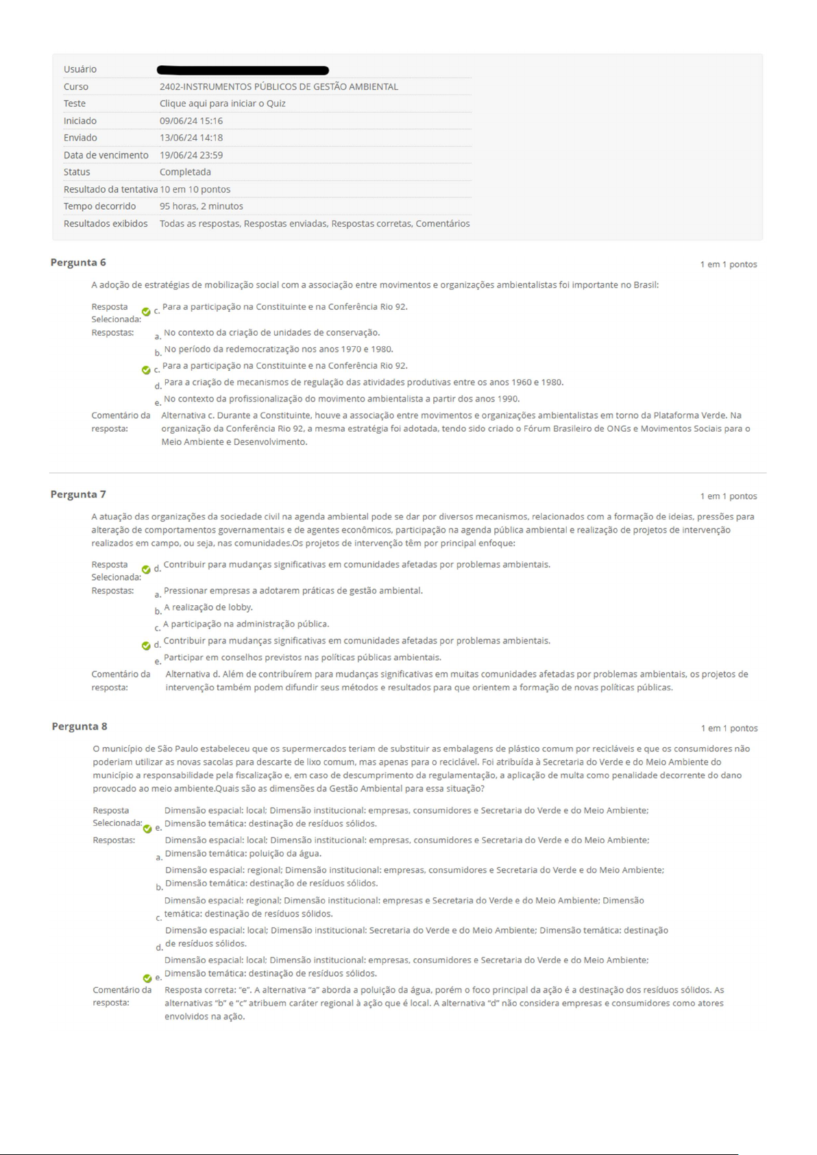Usuário Curso 2402-INSTRUMENTOS PÚBLICOS DE GESTÃO AMBIENTAL Teste Clique aqui para iniciar Quiz Iniciado 09/06/24 15:16 Enviado 13/06/24 14:18 Data de vencimento 19/06/24 Status Completada Resultado da tentativa 10 em 10 pontos Tempo decorrido 95 horas, 2 minutos Resultados exibidos Todas as respostas, Respostas enviadas, Respostas corretas, Comentários Pergunta 6 1 em pontos A adoção de estratégias de mobilização social com a associação entre movimentos e organizações ambientalistas foi importante no Brasil: Resposta Para a participação na Constituinte e na Conferência Rio 92. Selecionada: Respostas: a. No contexto da criação de unidades de conservação. b. No período da redemocratização nos anos 1970 e 1980. Para a participação na Constituinte e na Conferência Rio 92. d. Para a criação de mecanismos de regulação das atividades produtivas entre os anos 1960 e 1980. e. No contexto da profissionalização do movimento ambientalista a partir dos anos 1990. Comentário da Alternativa Durante a Constituinte, houve a associação entre movimentos e organizações ambientalistas em torno da Plataforma Verde. Na resposta: organização da Conferência Rio a mesma estratégia foi adotada, tendo sido criado Fórum Brasileiro de ONGs e Movimentos Sociais para o Meio Ambiente e Desenvolvimento. Pergunta 7 1 em 1 pontos A atuação das organizações da sociedade civil na agenda ambiental pode se dar por diversos mecanismos, relacionados com a formação de ideias, pressões para alteração de comportamentos governamentais e de agentes econômicos, participação na agenda pública ambiental e realização de projetos de intervenção realizados em campo, ou seja, nas comunidades.Os projetos de intervenção têm por principal enfoque: Resposta d. Contribuir para mudanças significativas em comunidades afetadas por problemas ambientais. Selecionada: Respostas: a. Pressionar empresas a adotarem práticas de gestão ambiental. b. A realização de lobby. A participação na administração pública. d. Contribuir para mudanças significativas em comunidades afetadas por problemas ambientais. e. Participar em conselhos previstos nas políticas públicas ambientais. Comentário da Alternativa d. Além de contribuírem para mudanças significativas em muitas comunidades afetadas por problemas ambientais, os projetos de resposta: intervenção também podem difundir seus métodos e resultados para que orientem a formação de novas políticas públicas. Pergunta 8 1 em 1 pontos município de São Paulo estabeleceu que os supermercados teriam de substituir as embalagens de plástico comum por recicláveis e que os consumidores não poderiam utilizar as novas sacolas para descarte de lixo comum, mas apenas para reciclável. Foi atribuída à Secretaria do Verde e do Meio Ambiente do município a responsabilidade pela fiscalização e, em caso de descumprimento da regulamentação, a aplicação de multa como penalidade decorrente do dano provocado ao meio ambiente.Quais são as dimensões da Gestão Ambiental para essa situação? Resposta Dimensão espacial: local: Dimensão institucional: empresas, consumidores e Secretaria do Verde e do Ambiente: Selecionada: e. Dimensão temática: destinação de resíduos sólidos. Respostas: Dimensão espacial: local; Dimensão institucional: empresas, consumidores e Secretaria do Verde e do Meio a. Dimensão temática: poluição da água. Dimensão espacial: regional; Dimensão institucional: empresas, consumidores e Secretaria do Verde e do Meio b. Dimensão temática: destinação de resíduos sólidos. Dimensão espacial: regional; Dimensão institucional: empresas e Secretaria do Verde e do Meio Ambiente: Dimensão temática: destinação de resíduos sólidos. Dimensão espacial: local; Dimensão institucional: Secretaria do Verde e do Meio Ambiente: Dimensão temática: destinação d. de resíduos sólidos. Dimensão espacial: local; Dimensão institucional: empresas, consumidores e Secretaria do Verde e do Meio e. Dimensão temática: destinação de resíduos sólidos. Comentário da Resposta correta: "e". A alternativa "a" aborda a poluição da água, porém o foco principal da ação é a destinação dos resíduos sólidos. As resposta: alternativas "b" e atribuem caráter regional à ação que é local. A alternativa "d" não considera empresas e consumidores como atores envolvidos na ação.Pergunta 9 1 em 1 pontos A formação da agenda pública ambiental: Resposta d. Desenvolveu-se ao longo da história, tendo marcos importantes em sua formação, a partir dos anos 1970. Selecionada: Respostas: a. Ocorreu nos anos 1990, a partir da Conferência Rio-92. b. Teve como marco inicial a Convenção das Mudanças Climáticas. Teve como marco inicial o relatório "Nosso Futuro Comum". d. Desenvolveu-se ao longo da história, tendo marcos importantes em sua formação, a partir dos anos 1970. e. Desenvolveu-se ao longo da história, tendo marcos importantes em sua formação, no período de 1930 a 1950. Comentário da Resposta correta: "d". A alternativa "e" aponta para eventos em um período que surgem medidas ambientais, mas sem a perspectiva da resposta: exploração de recursos naturais para desenvolvimento. As alternativas "a", "b" e apontam para importantes eventos ou documentos que influenciaram a agenda pública ambiental, mas que não foram marcos iniciais. Pergunta 10 1 em pontos A instituição das regiões metropolitanas e a criação de instrumentos orientados ao seu planejamento, constitui instrumentos relacionado a qual abordagem da política ambiental: Resposta e. Abordagem do planejamento territorial. Selecionada: Respostas: a. Abordagem da Política Nacional de Meio Ambiente. b. Abordagem do controle da poluição industrial. Abordagem da administração dos recursos naturais. d. Abordagem do desenvolvimento sustentável. e. Abordagem do planejamento territorial. Comentário da Alternativa correta: "e". A ab