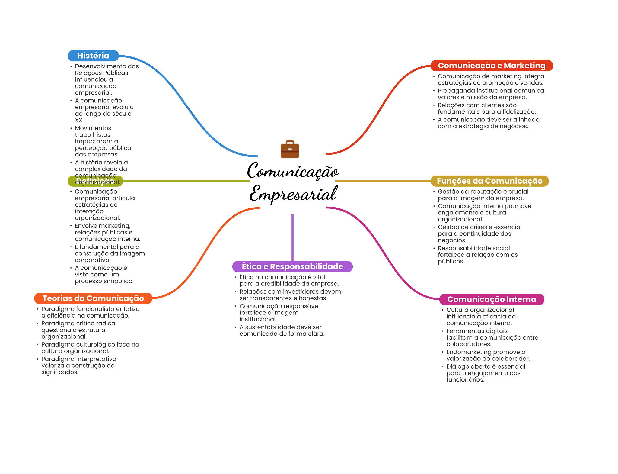 História Desenvolvimento das Comunicação e Marketing Relações Públicas influenciou a Comunicação de marketing integra comunicação estratégias de promoção e vendas. empresarial. Propaganda institucional comunica A comunicação valores e missão da empresa. empresarial evoluiu Relações com clientes são ao longo do século fundamentais para a fidelização. XX. A comunicação deve ser alinhada Movimentos com a estratégia de negócios. trabalhistas impactaram a percepção pública das empresas. A história revela a complexidade da comunicação Comunicação organizacional. Funções da Comunicação Comunicação empresarial articula Empresarial Gestão da reputação é crucial para a imagem da empresa. estratégias de Comunicação interna promove interação engajamento e cultura organizacional. organizacional. Envolve marketing, Gestão de crises é essencial relações públicas e para a continuidade dos comunicação interna. negócios. É fundamental para a Responsabilidade social construção da imagem fortalece a relação com OS corporativa. públicos. A comunicação é Ética e Responsabilidade vista como um Ética na comunicação é vital processo simbólico. para a credibilidade da empresa. Relações com investidores devem Teorias da Comunicação ser transparentes e honestas. Comunicação Interna Paradigma funcionalista enfatiza Comunicação responsável a eficiência na comunicação. fortalece a imagem Cultura organizacional institucional. influencia a eficácia da Paradigma crítico radical comunicação interna. A sustentabilidade deve ser questiona a estrutura comunicada de forma clara. Ferramentas digitais organizacional. facilitam a comunicação entre Paradigma culturológico foca na colaboradores. cultura organizacional. Endomarketing promove a Paradigma interpretativo valorização do colaborador. valoriza a construção de Diálogo aberto é essencial significados. para engajamento dos funcionários.