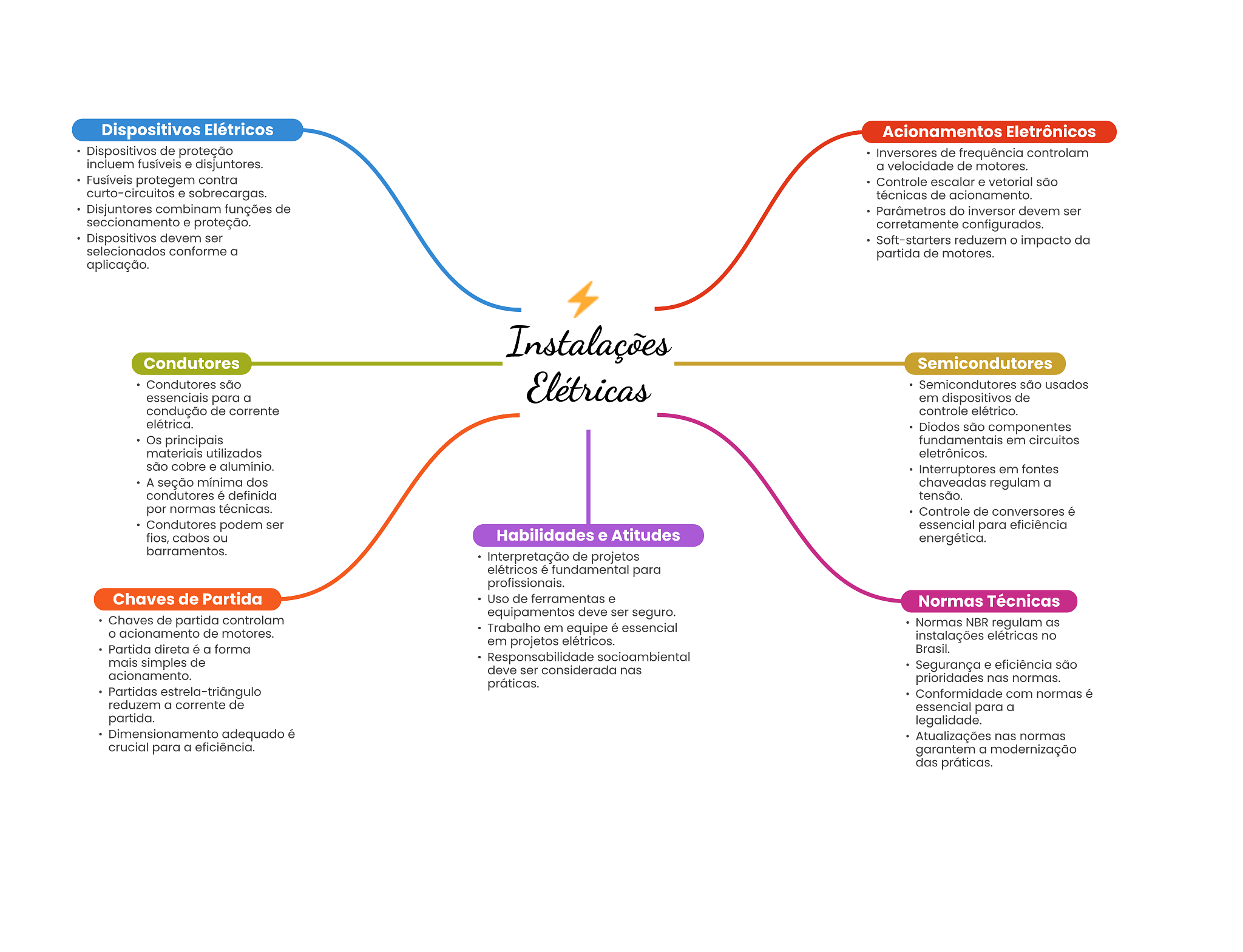 Dispositivos Elétricos Acionamentos Eletrônicos Dispositivos de proteção Inversores de frequência controlam incluem fusíveis e disjuntores. a velocidade de motores. Fusíveis protegem contra Controle escalar e vetorial são curto-circuitos e sobrecargas. técnicas de acionamento. Disjuntores combinam funções de Parâmetros do inversor devem ser seccionamento e proteção. corretamente configurados. Dispositivos devem ser Soft-starters reduzem impacto da selecionados conforme a partida de motores. aplicação. Instalações Condutores Semicondutores Condutores são Elétricas Semicondutores são usados essenciais para a em dispositivos de condução de corrente controle elétrico. elétrica. Diodos são componentes Os principais fundamentais em circuitos materiais utilizados eletrônicos. são cobre e alumínio. Interruptores em fontes A seção mínima dos chaveadas regulam a condutores é definida tensão. por normas técnicas. Controle de conversores é Condutores podem ser essencial para eficiência fios, cabos ou Habilidades e Atitudes energética. barramentos. Interpretação de projetos elétricos é fundamental para profissionais. Chaves de Partida Uso de ferramentas e Normas Técnicas equipamentos deve ser seguro. Chaves de partida controlam O acionamento de motores. Trabalho em equipe é essencial Normas NBR regulam as em projetos elétricos. instalações elétricas no Partida direta é a forma Brasil. mais simples de Responsabilidade socioambiental deve ser considerada nas Segurança e eficiência são acionamento. práticas. prioridades nas normas. Partidas Conformidade com normas é reduzem a corrente de essencial para a partida. legalidade. Dimensionamento adequado é Atualizações nas normas crucial para a eficiência. garantem a modernização das práticas.