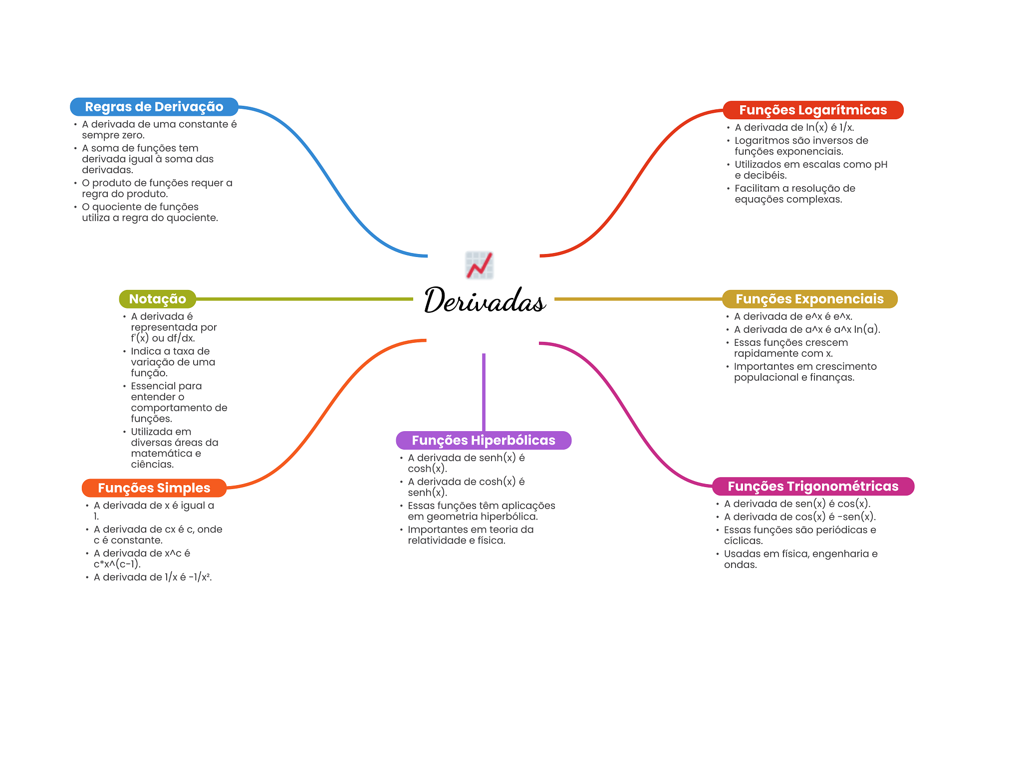 Regras de Derivação Funções Logarítmicas A derivada de uma constante é A derivada de In(x) é 1/x. sempre zero. Logaritmos são inversos de A soma de funções tem funções exponenciais. derivada igual à soma das derivadas. Utilizados em escalas como pH e decibéis. produto de funções requer a regra do produto. Facilitam a resolução de equações complexas. quociente de funções utiliza a regra do quociente. Notação Derivadas Funções Exponenciais A derivada é A derivada de é representada por A derivada de é In(a). f'(x) ou df/dx. Essas funções crescem Indica a taxa de rapidamente com X. variação de uma Importantes em crescimento função. populacional e finanças. Essencial para entender comportamento de funções. Utilizada em diversas áreas da Funções Hiperbólicas matemática e . A derivada de senh(x) é ciências. cosh(x). A derivada de cosh(x) é Funções Simples senh(x). Funções Trigonométricas A derivada de X é igual a Essas funções têm aplicações A derivada de sen(x) é cos(x). 1. em geometria hiperbólica. A derivada de cos(x) é -sen(x). A derivada de CX é onde Importantes em teoria da Essas funções são periódicas e C é constante. relatividade e física. cíclicas. A derivada de X^C é Usadas em física, engenharia e c*x^(c-1). ondas. A derivada de 1/x é -1/x².