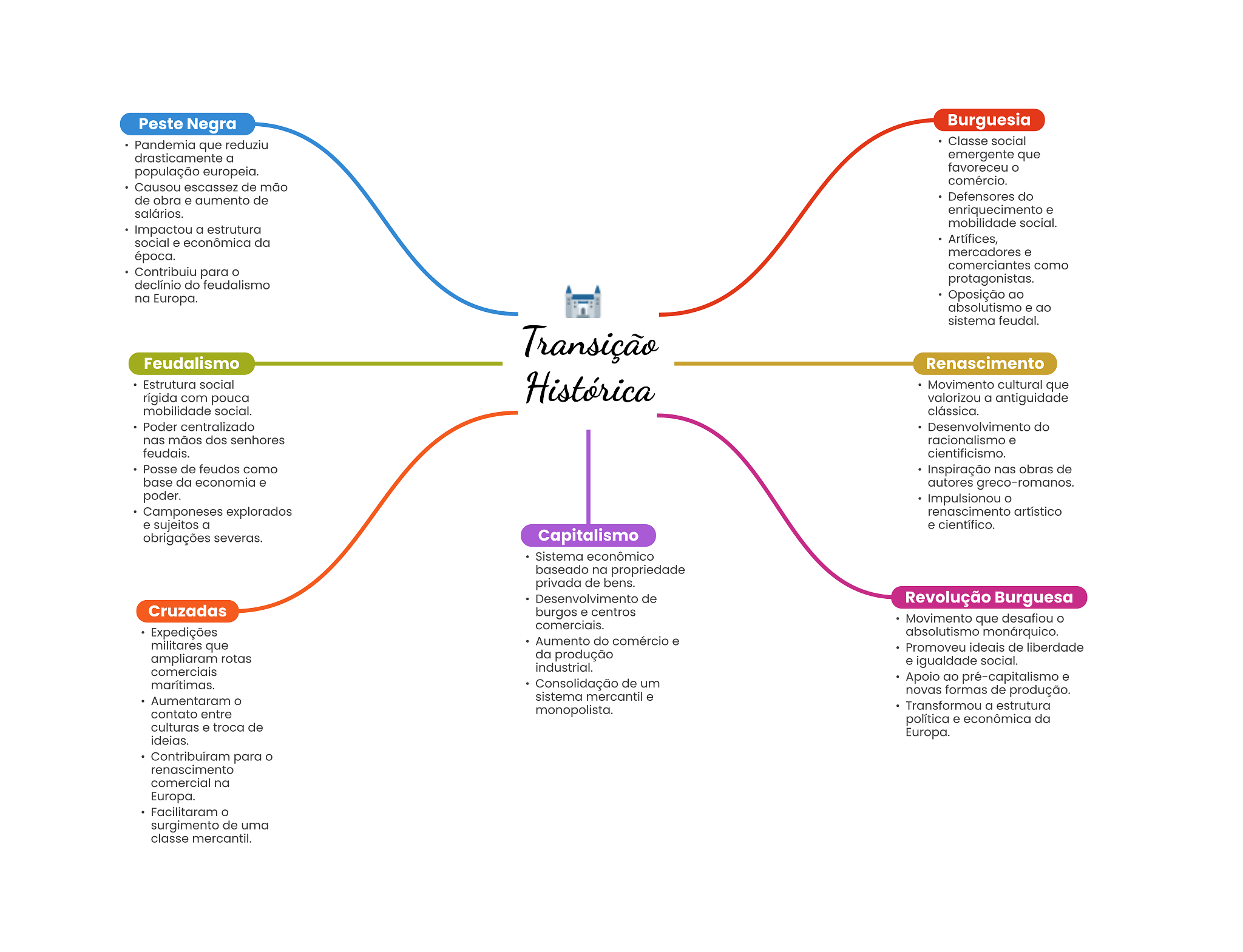 Peste Negra Burguesia Pandemia que reduziu Classe social drasticamente a emergente que população europeia. favoreceu comércio. Causou escassez de mão de obra e aumento de Defensores do salários. enriquecimento e mobilidade social. Impactou a estrutura social e econômica da Artífices, época. mercadores e comerciantes como Contribuiu para declínio do feudalismo protagonistas. na Europa. Oposição ao absolutismo e ao sistema feudal. Transição Feudalismo Renascimento Estrutura social rígida com pouca Histórica Movimento cultural que valorizou a antiguidade mobilidade social. clássica. Poder centralizado Desenvolvimento do nas mãos dos senhores racionalismo e feudais. cientificismo. Posse de feudos como Inspiração nas obras de base da economia e autores greco-romanos. poder. Impulsionou Camponeses explorados renascimento artístico e sujeitos a e científico. obrigações severas. Capitalismo Sistema econômico baseado na propriedade privada de bens. Desenvolvimento de Revolução Burguesa Cruzadas burgos e centros comerciais. Movimento que desafiou Expedições absolutismo monárquico. militares que Aumento do comércio e Promoveu ideais de liberdade ampliaram rotas da produção industrial. e igualdade social. comerciais Consolidação de um Apoio ao pré-capitalismo e marítimas. Aumentaram sistema mercantil e novas formas de produção. contato entre monopolista. Transformou a estrutura política e econômica da culturas e troca de Europa. ideias. Contribuíram para renascimento comercial na Europa. Facilitaram surgimento de uma classe mercantil.