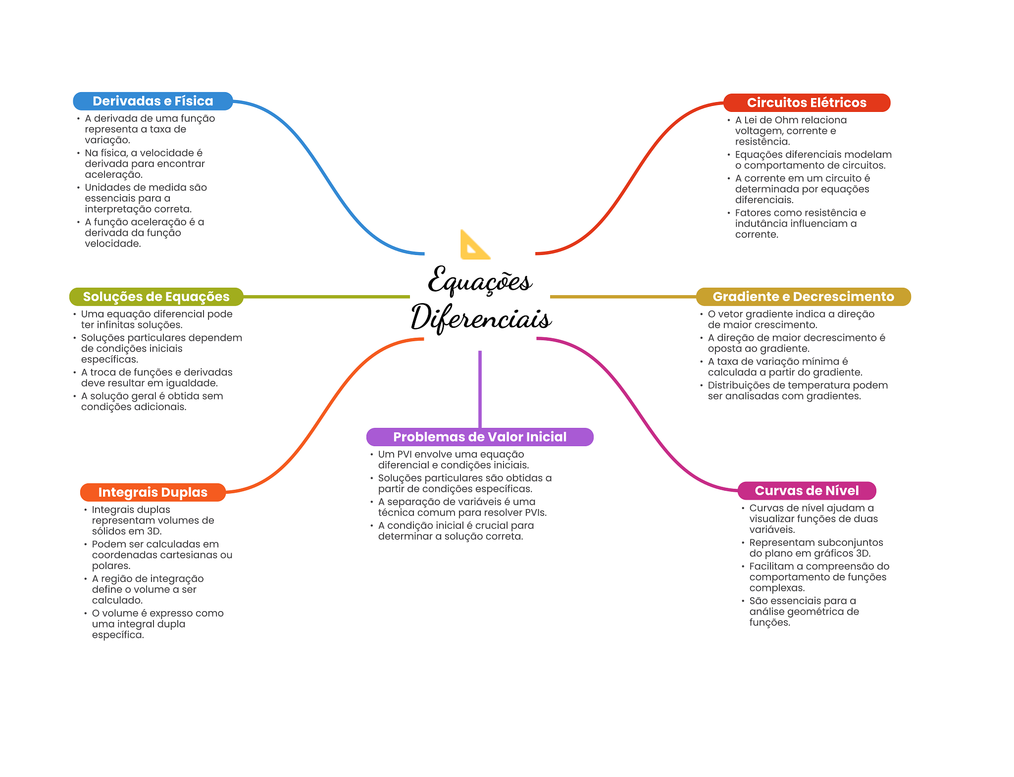 Derivadas e Física Circuitos Elétricos A derivada de uma função A Lei de Ohm relaciona representa a taxa de voltagem, corrente e variação. resistência. Na física, a velocidade é Equações diferenciais modelam derivada para encontrar O comportamento de circuitos. aceleração. A corrente em um circuito é Unidades de medida são determinada por equações essenciais para a diferenciais. interpretação correta. Fatores como resistência e A função aceleração é a indutância influenciam a derivada da função corrente. velocidade. Equações Soluções de Equações Gradiente e Decrescimento Uma equação diferencial pode ter infinitas soluções. Diferenciais vetor gradiente indica a direção de maior crescimento. Soluções particulares dependem A direção de maior decrescimento é de condições iniciais oposta ao gradiente. específicas. A taxa de variação mínima é A troca de funções e derivadas calculada a partir do gradiente. deve resultar em igualdade. Distribuições de temperatura podem A solução geral é obtida sem ser analisadas com gradientes. condições adicionais. Problemas de Valor Inicial Um PVI envolve uma equação diferencial e condições iniciais. Soluções particulares são obtidas a Integrais Duplas partir de condições específicas. Curvas de Nível A separação de variáveis é uma Integrais duplas técnica comum para resolver PVIs. Curvas de nível ajudam a representam volumes de visualizar funções de duas sólidos em 3D. A condição inicial é crucial para variáveis. determinar a solução correta. Podem ser calculadas em Representam subconjuntos coordenadas cartesianas ou do plano em gráficos 3D. polares. Facilitam a compreensão do A região de integração comportamento de funções define volume a ser complexas. calculado. São essenciais para a volume é expresso como análise geométrica de uma integral dupla funções. específica.