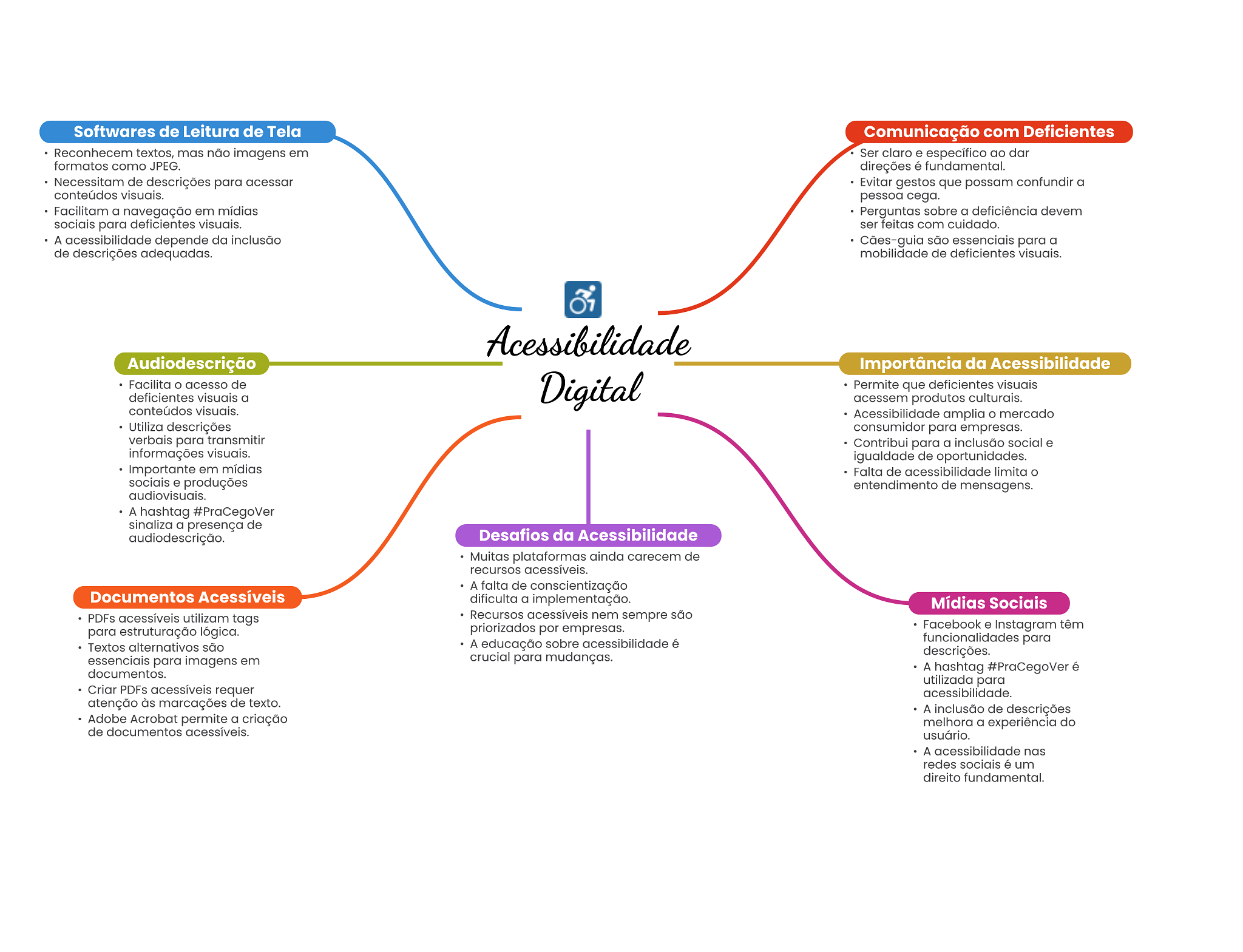 Softwares de Leitura de Tela Comunicação com Deficientes Reconhecem textos, mas não imagens em Ser claro e específico ao dar formatos como JPEG. direções é fundamental. Necessitam de descrições para acessar Evitar gestos que possam confundir a conteúdos visuais. pessoa cega. Facilitam a navegação em mídias Perguntas sobre a deficiência devem sociais para deficientes visuais. ser feitas com cuidado. A acessibilidade depende da inclusão Cães-guia são essenciais para a de descrições adequadas. mobilidade de deficientes visuais. Acessibilidade Audiodescrição Importância da Acessibilidade Facilita acesso de Digital Permite que deficientes visuais deficientes visuais a acessem produtos culturais. conteúdos visuais. Acessibilidade amplia O mercado Utiliza descrições consumidor para empresas. verbais para transmitir Contribui para a inclusão social e informações visuais. igualdade de oportunidades. Importante em mídias Falta de acessibilidade limita sociais e produções entendimento de mensagens. audiovisuais. A hashtag #PraCegoVer sinaliza a presença de audiodescrição. Desafios da Acessibilidade Muitas plataformas ainda carecem de recursos acessíveis. A falta de conscientização Documentos Acessíveis dificulta a implementação. Mídias Sociais PDFs acessíveis utilizam tags Recursos acessíveis nem sempre são para estruturação lógica. priorizados por empresas. Facebook e Instagram têm Textos alternativos são A educação sobre acessibilidade é funcionalidades para essenciais para imagens em crucial para mudanças. descrições. documentos. A hashtag #PraCegoVer é utilizada para Criar PDFs acessíveis requer acessibilidade. atenção às marcações de texto. A inclusão de descrições Adobe Acrobat permite a criação melhora a experiência do de documentos acessíveis. usuário. A acessibilidade nas redes sociais é um direito fundamental.